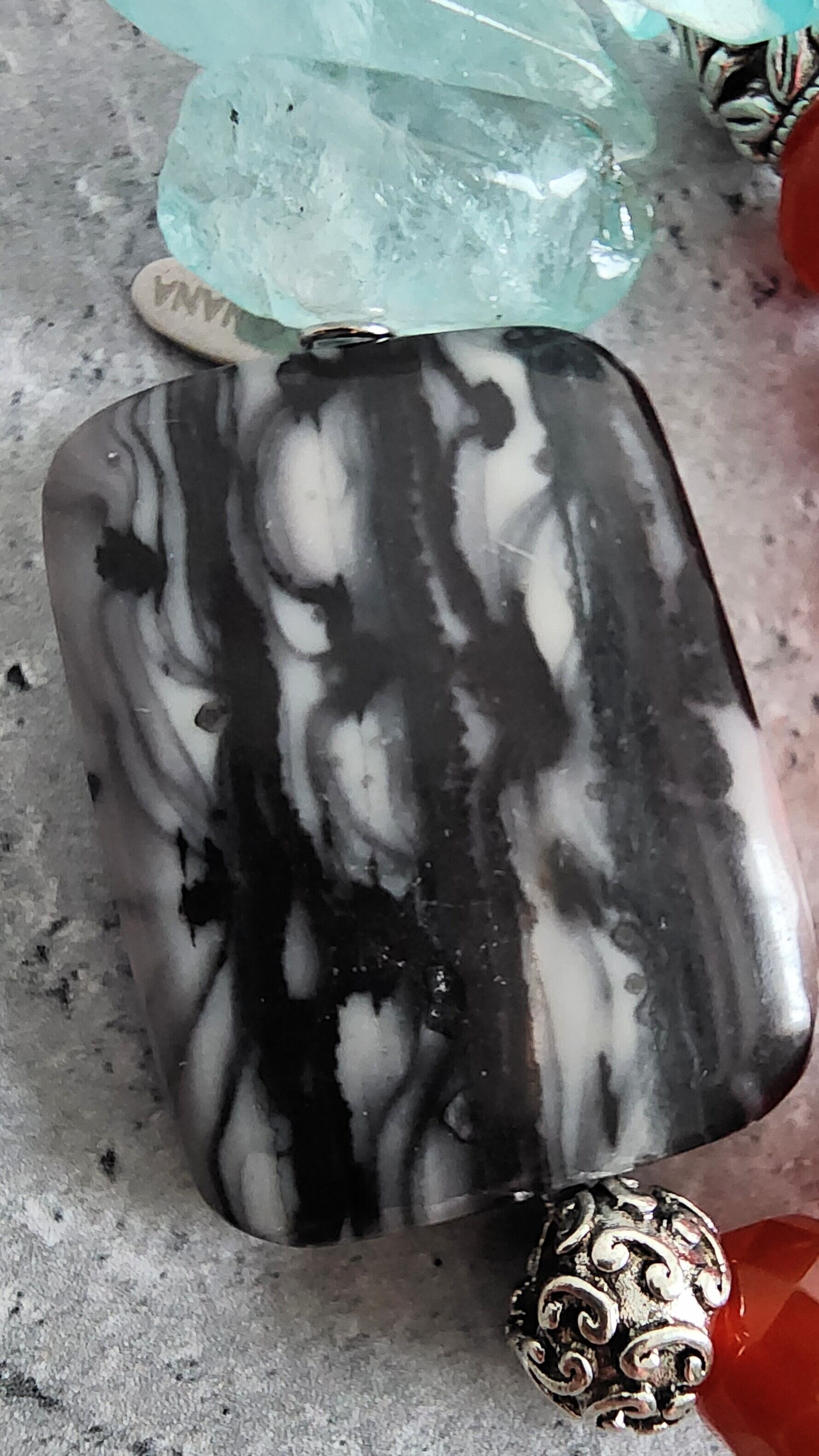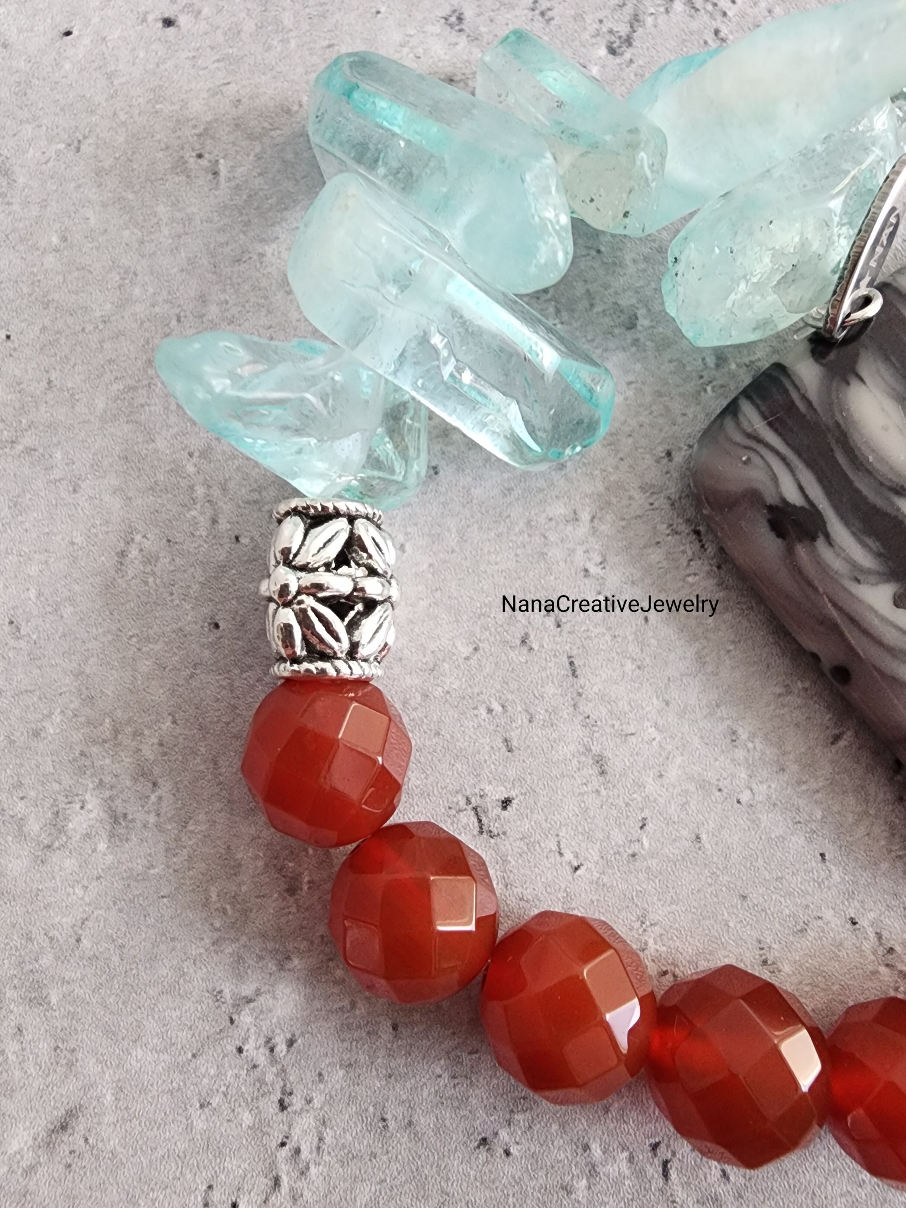 シックなマーブル模様のロードナイト、鮮やかな赤のアゲートラウンドカット、そして涼しげな輝きを放つクリスタル氷柱が絶妙に組み合わされたアイテム。強さと洗練を兼ね備えた個性的なブレスレットです。