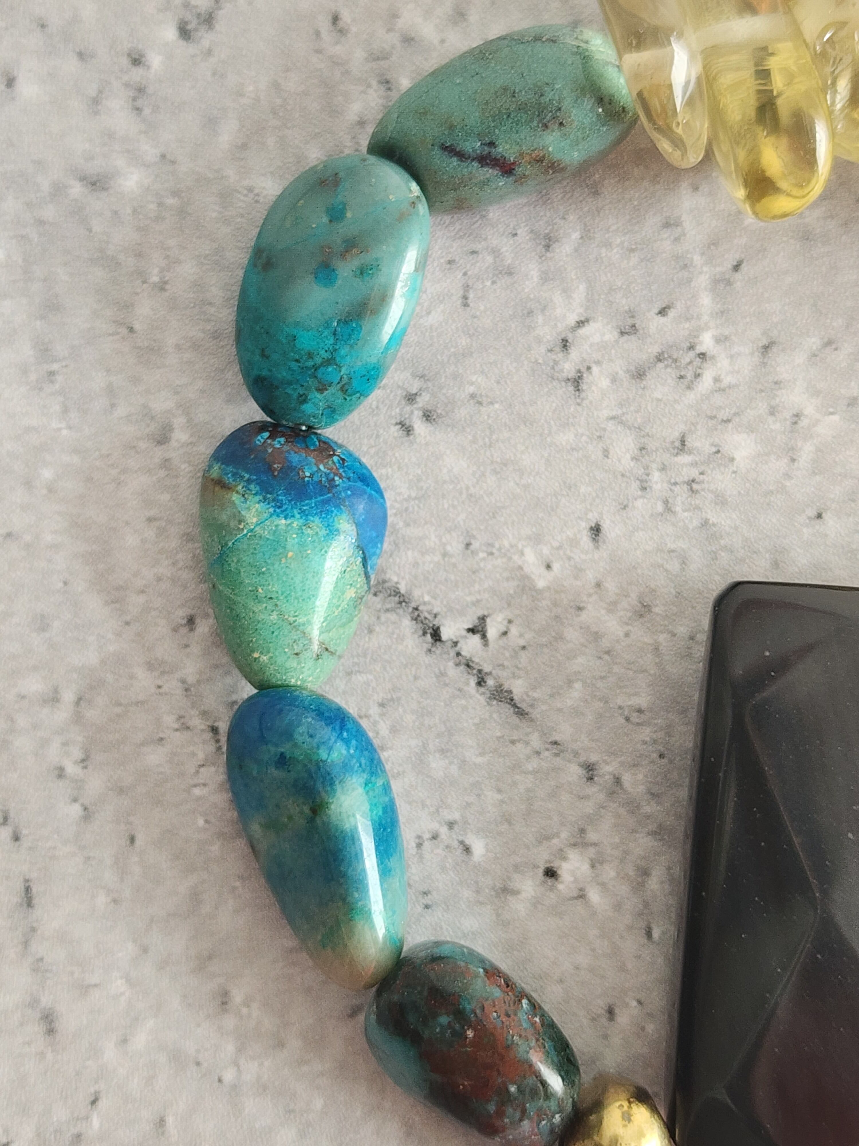大粒のオニキス菱形、クリソコラタンブルとレモンクォーツチップの異なる色と質感の石で組み合わせた個性的で存在感のある一本。