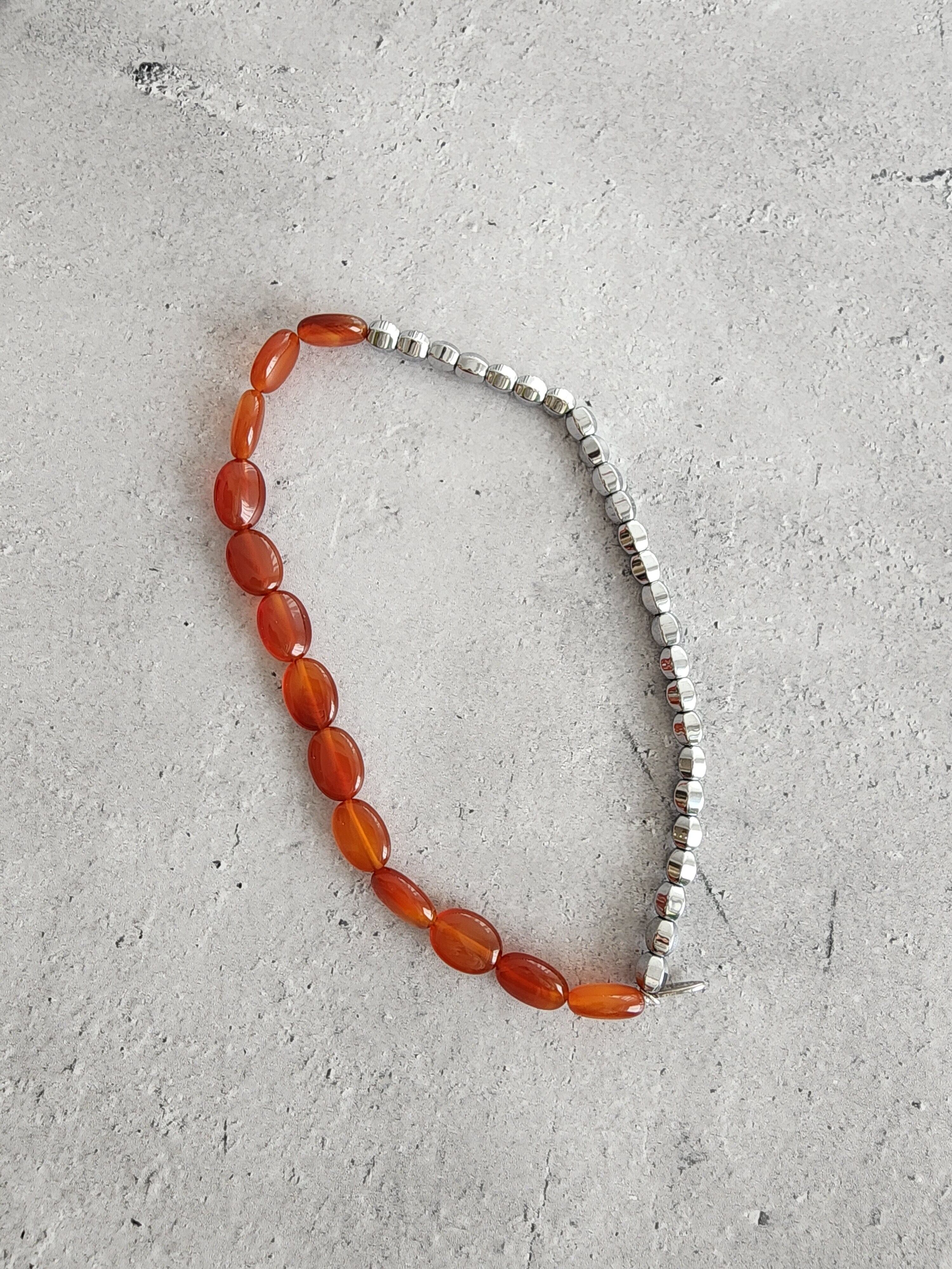 美しい艶やかなレッドアゲートをシルバーヘマタイトのメタリックな輝きでクールに、モダンに。