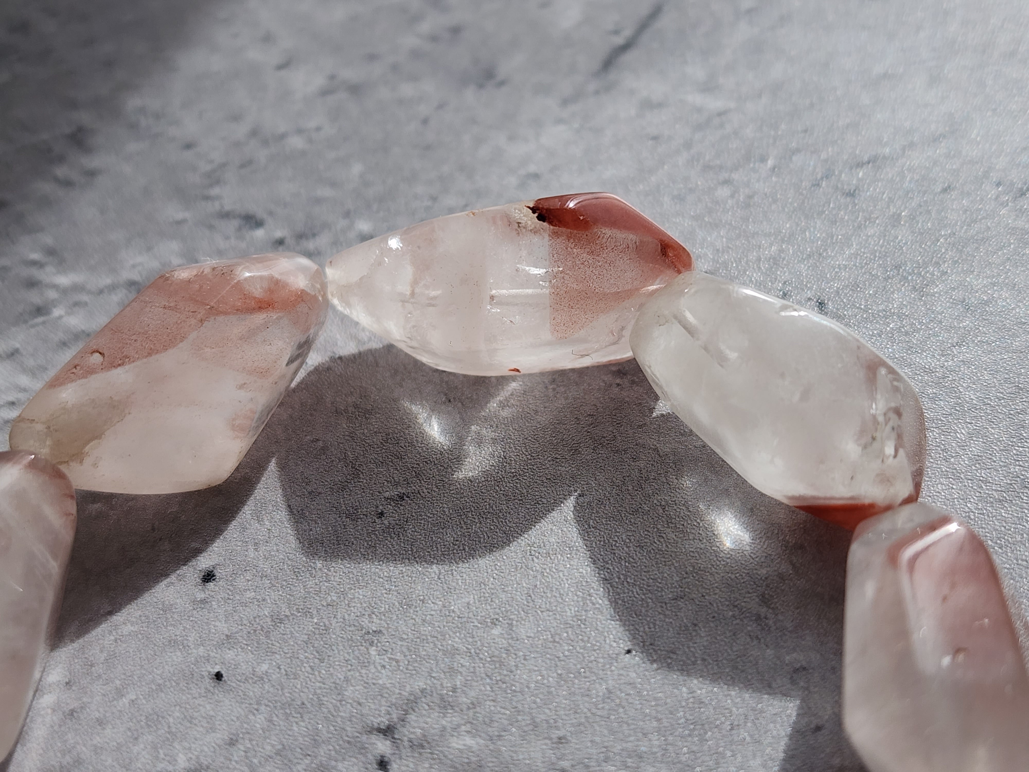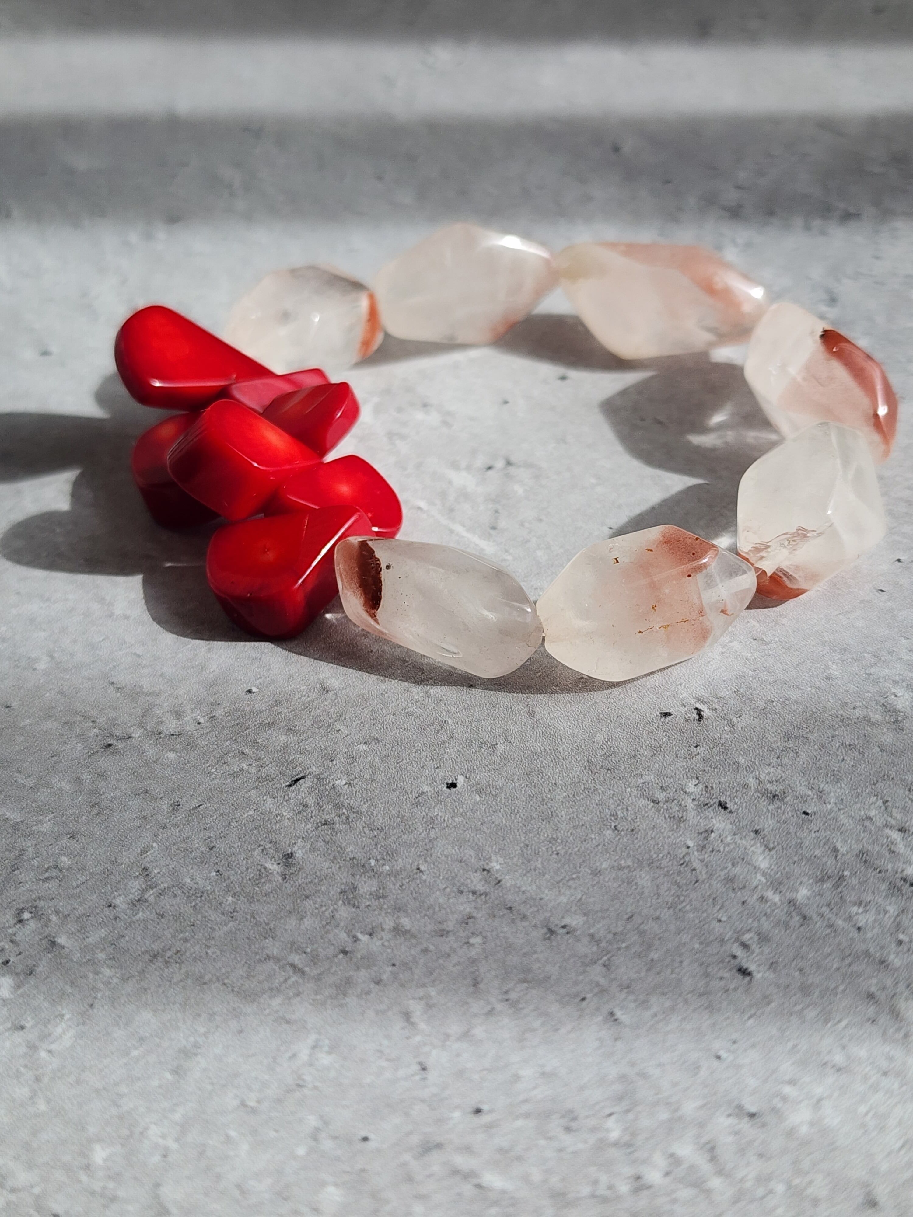 レピドクロサイトインクォーツの透明な輝きに、レッドコーラルの鮮やかな彩りを合わせたエレガントなアイテムです。