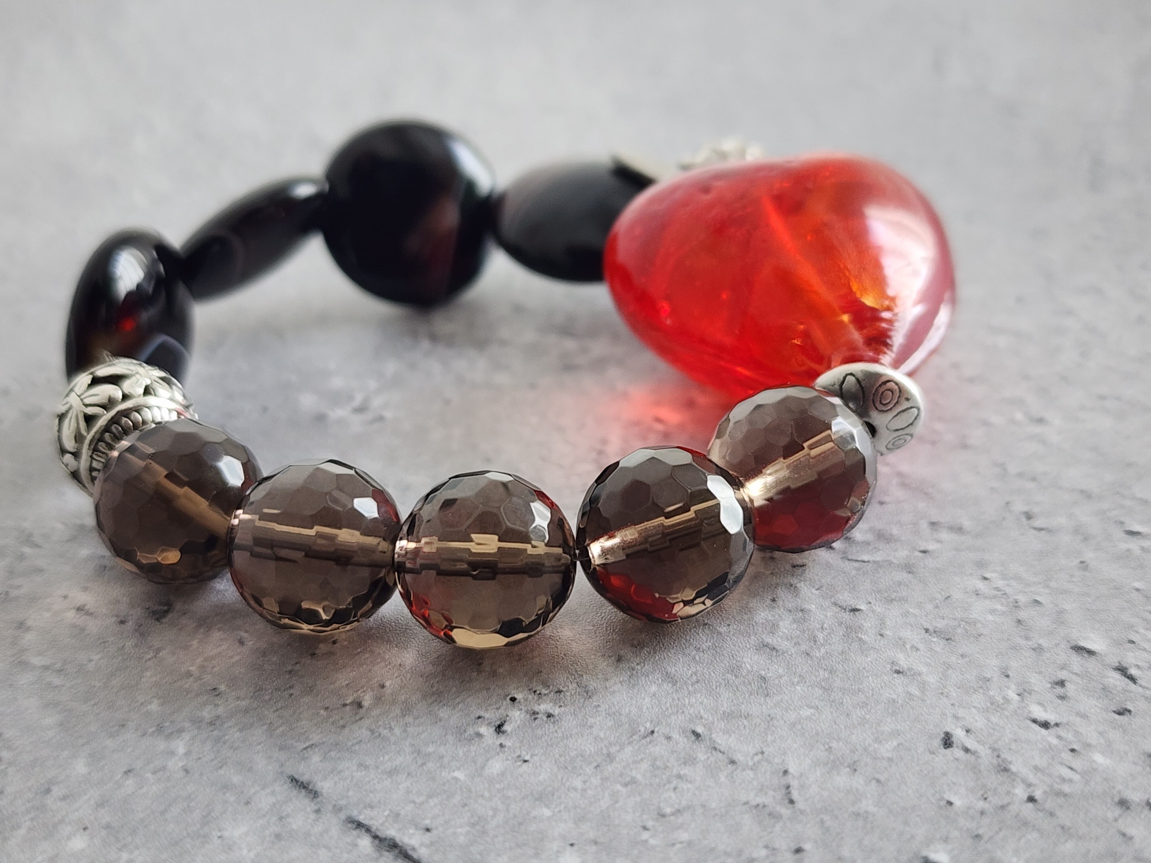 強烈なレッドカラーベネチアンガラスハート、美しいスモーキークォーツとキュートなストライプオニキス、ソロバン形の真鍮ビーズとアンティーク風透かし合金ビーズで組み合わせた色鮮やかでありながらシックな印象を与えるブレスレットです。