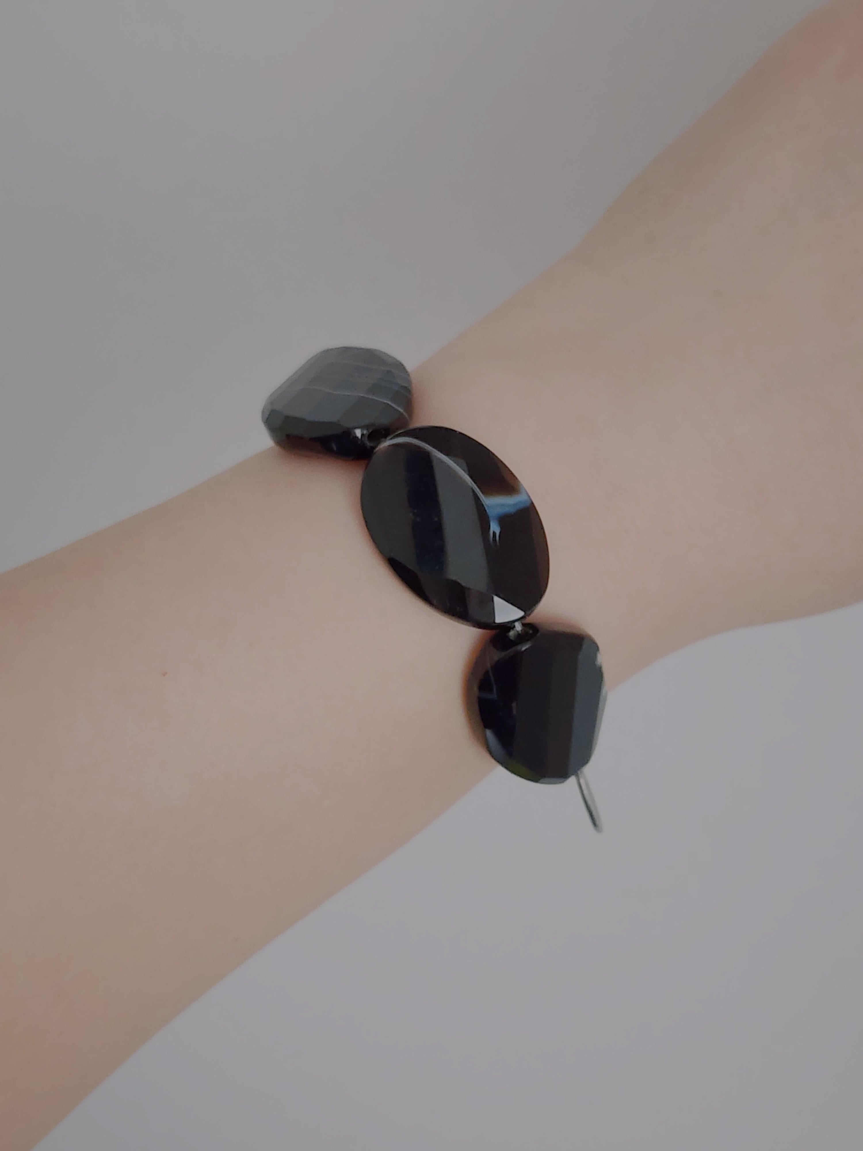 光を受けてほのかに浮かび上がる縞模様と、丁寧なカットが印象的なブラックオニキス。