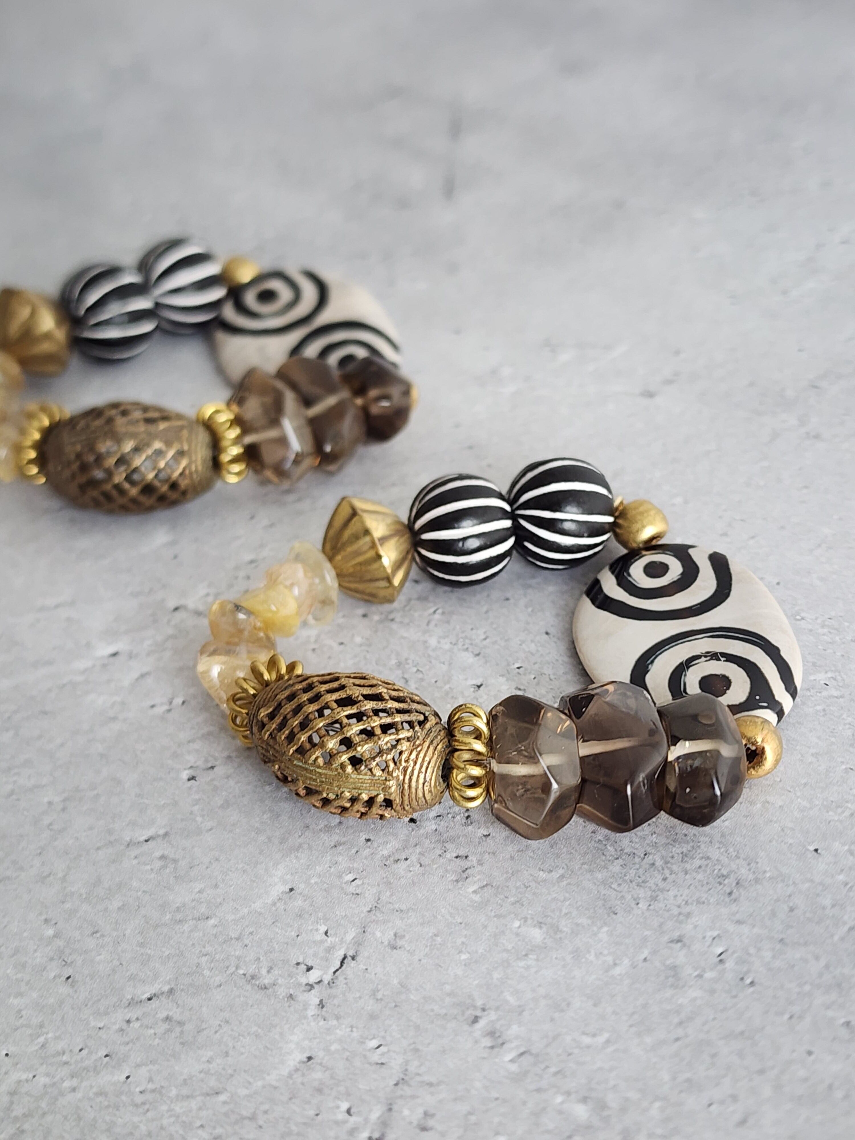 さらに、ヴィンテージ感のある真鍮パーツと、インパクトがある模様が魅力的なジャワビーズがアクセントとなり、異国情緒溢れるデザインに仕上がっています。個性的でありながら、どんな装いにも馴染む洗練されたブレスレットです。