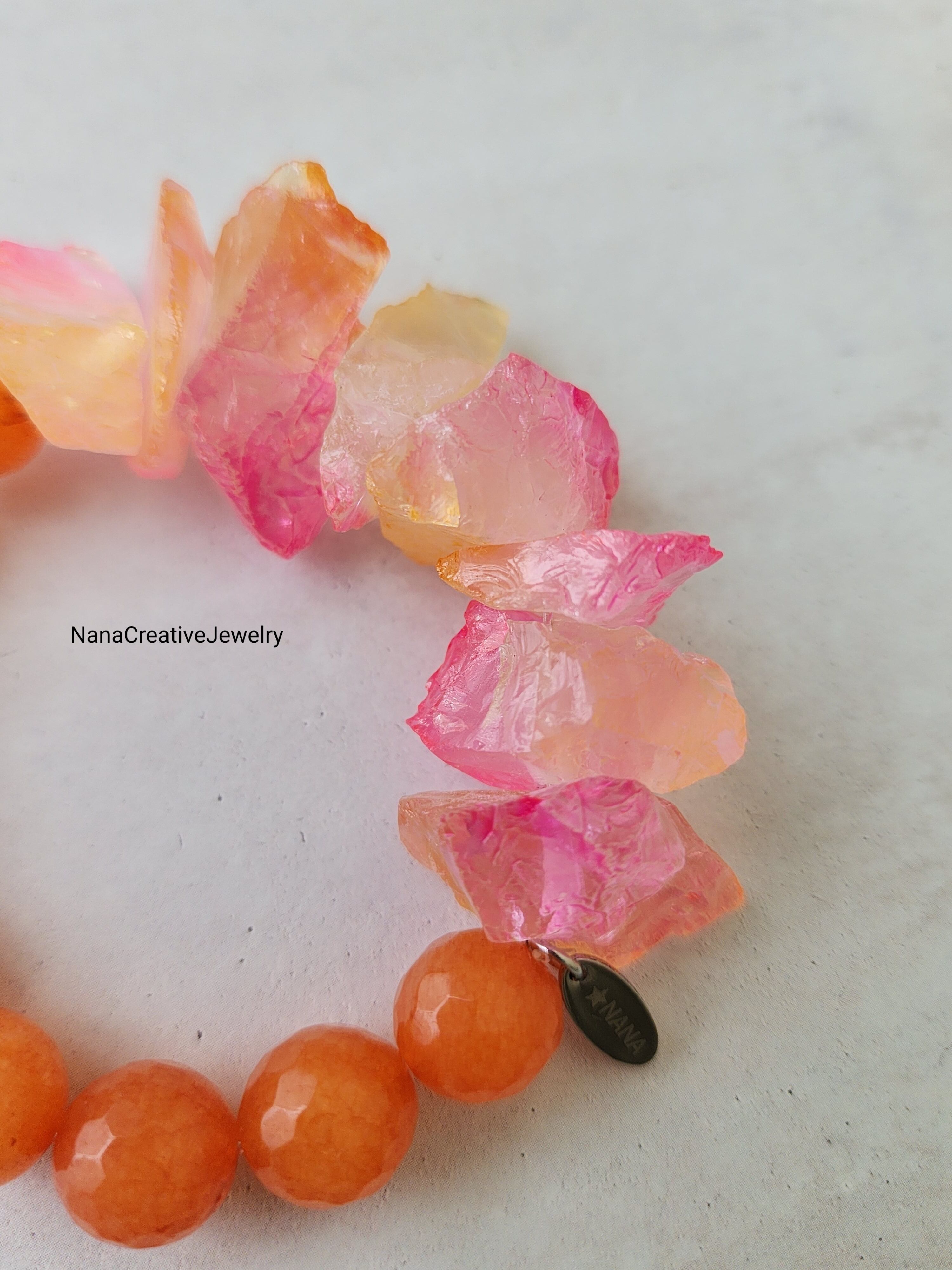 そこに、朝焼けと夕焼けの光を閉じ込めたようなクリスタルが重なり、肌の上で柔らかくきらめく。