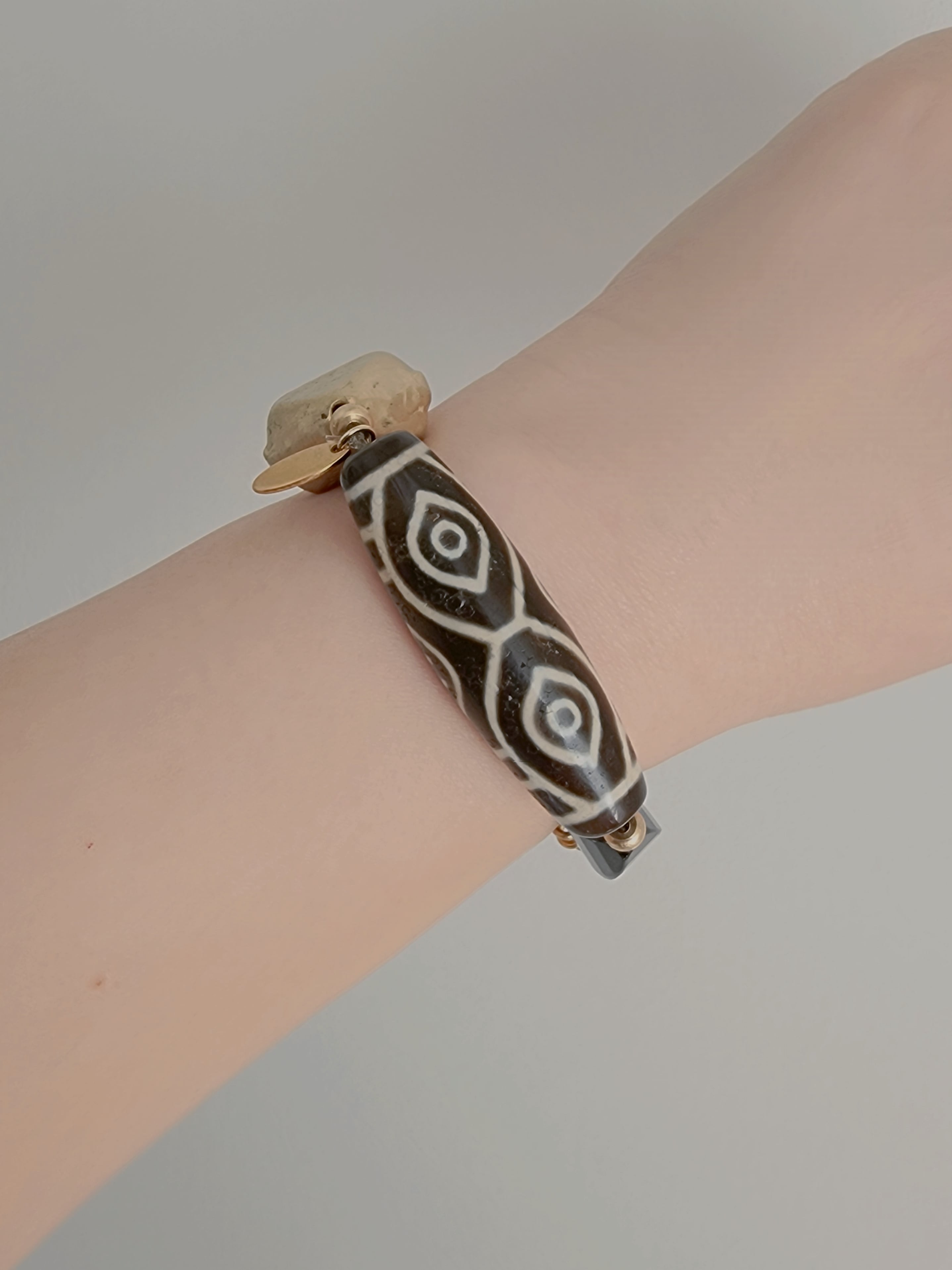 龍眼天珠はシンボル的な模様と奥行きのある質感で独特のオーラを放ちます。その緻密なラインが、視線を惹きつける力強いアクセントに。