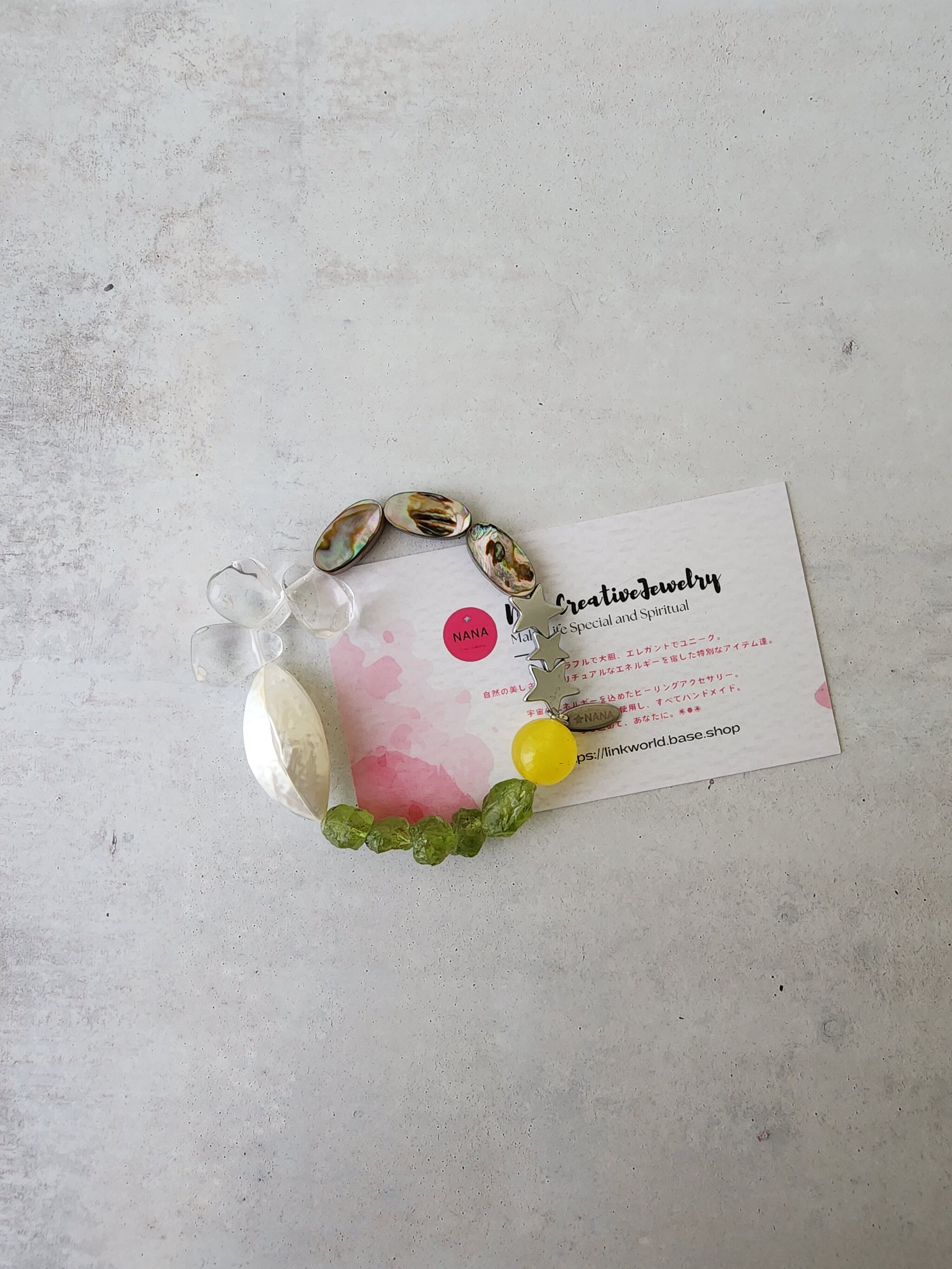 Multicolorbracelet ー Yellow (ペリドット×ジェード×トロカシェル×アバロンシェル×クリスタル×ヘマタイト)