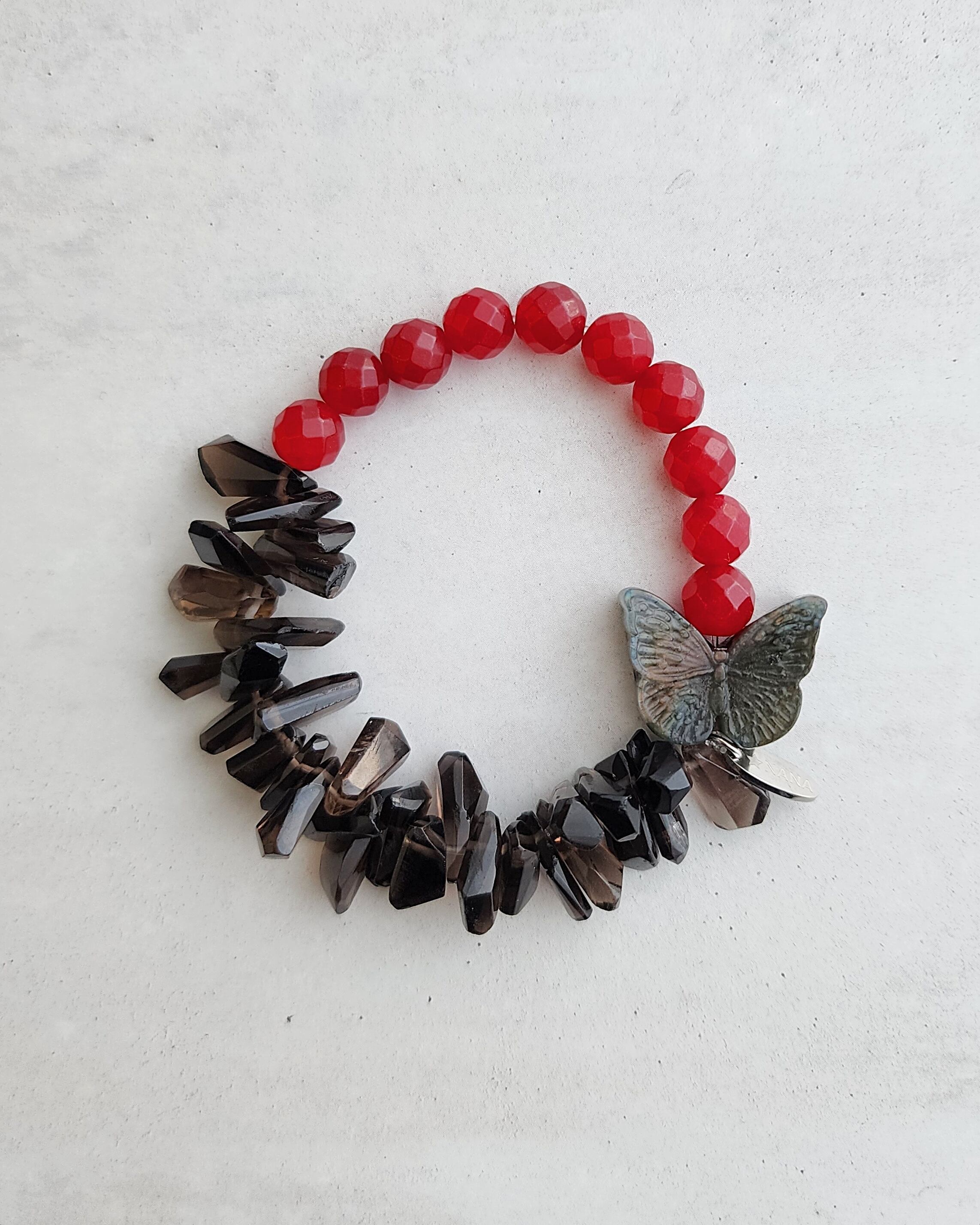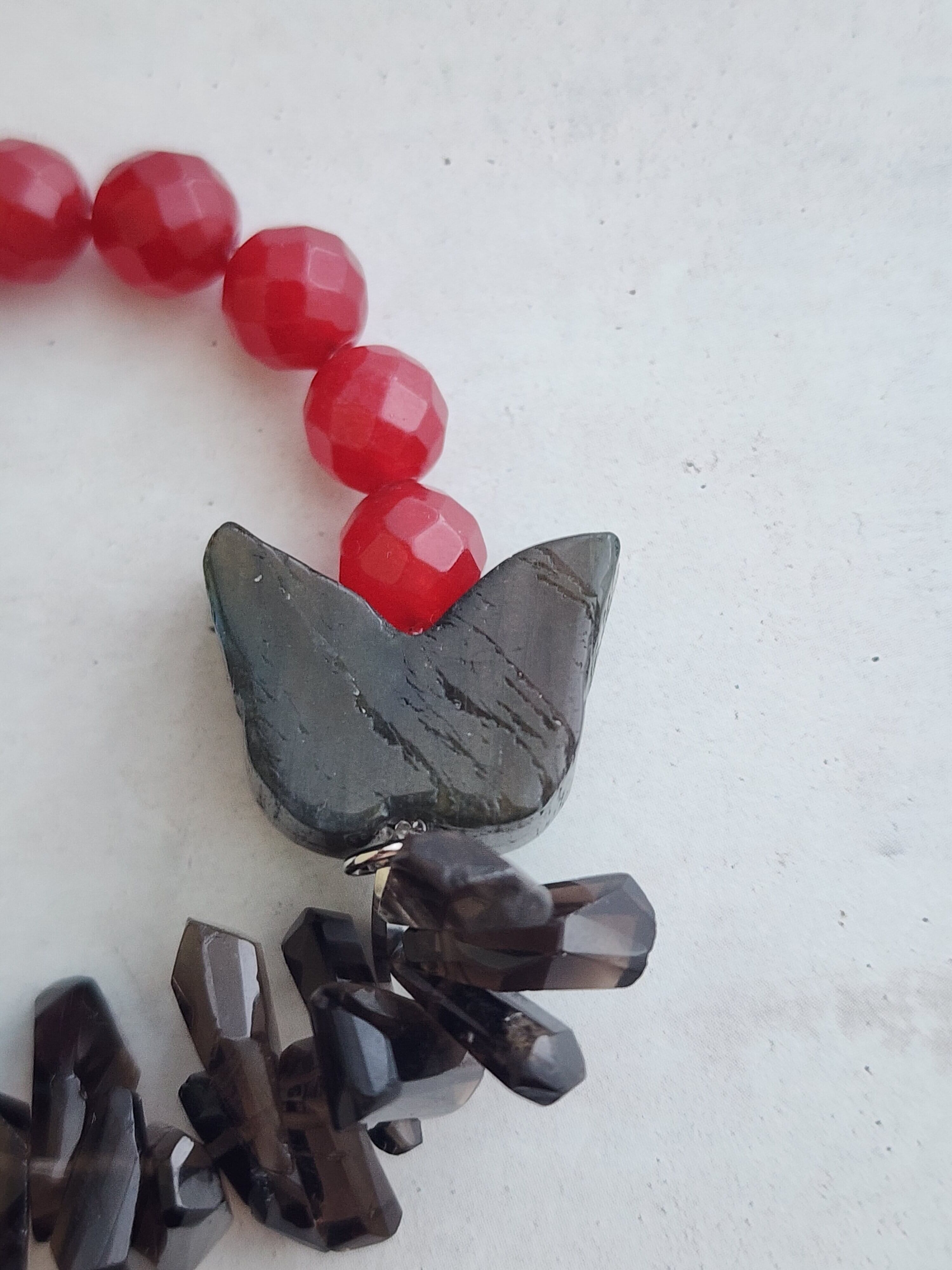 ラブラドライトの蝶、レッドアゲート、スモーキークォーツを合わせた一本です。