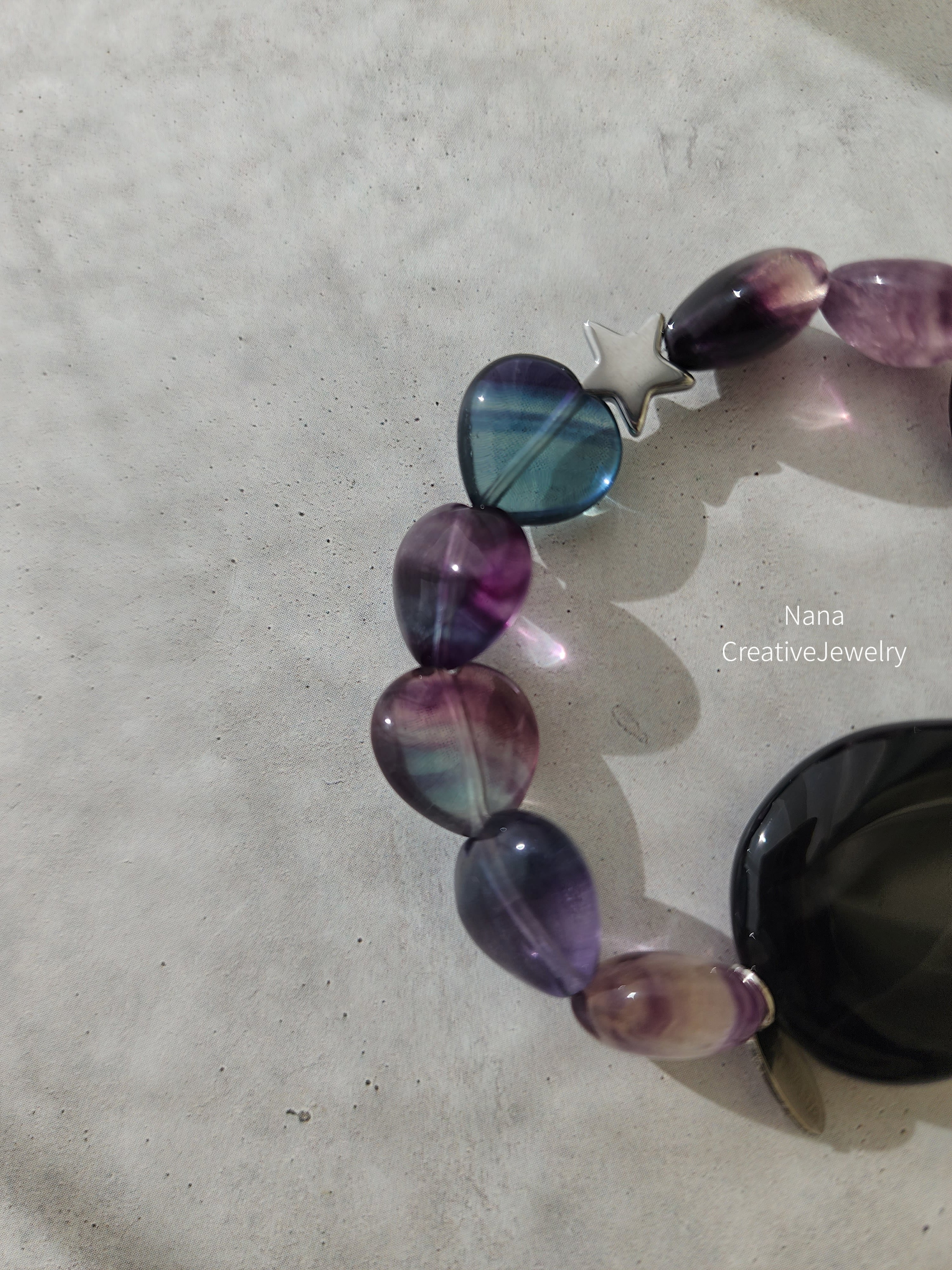 ブラックオニキスの大きなティアドロップに、プリズムみたいなフローライトのハートたち。そして、そっと寄り添うヘマタイトのスターが、夜空にひとつだけ強く光る星みたいに、視線を引き寄せます。