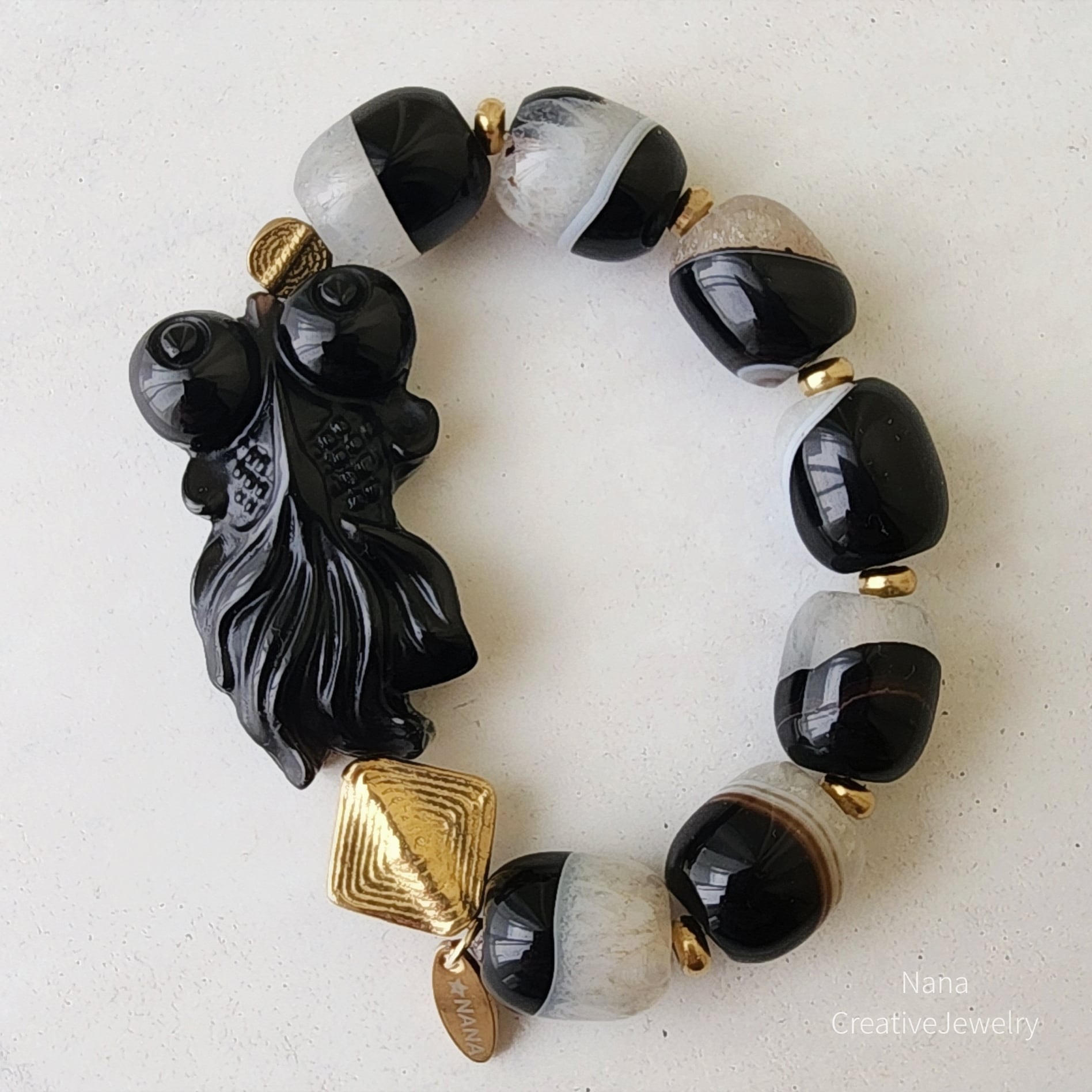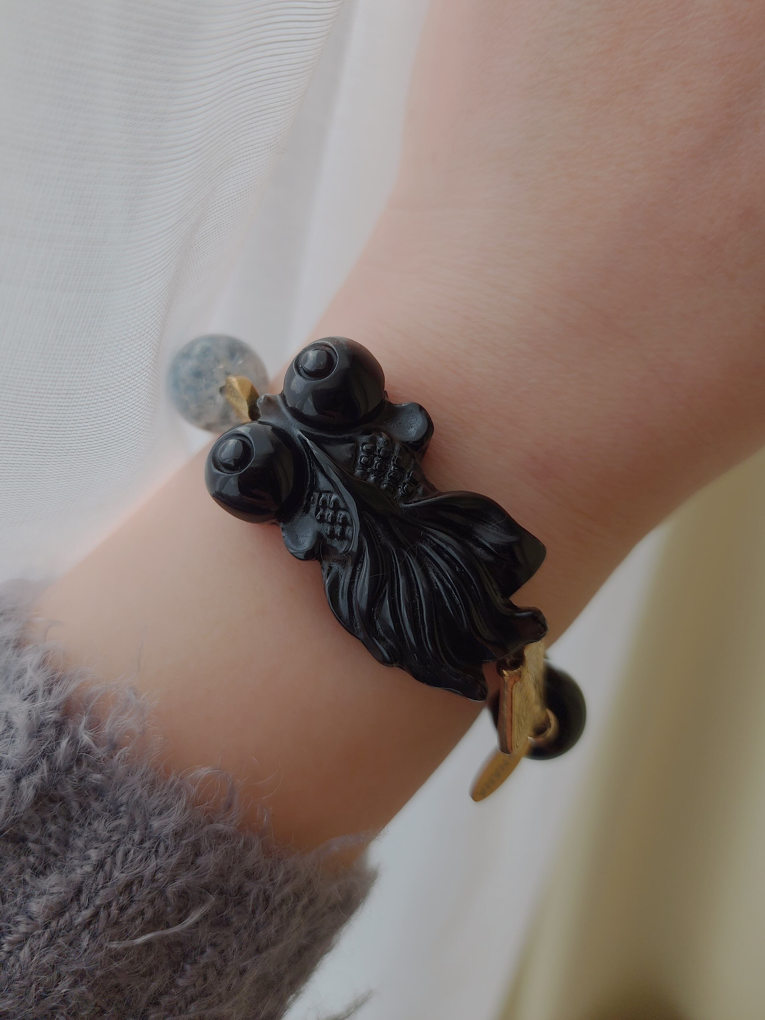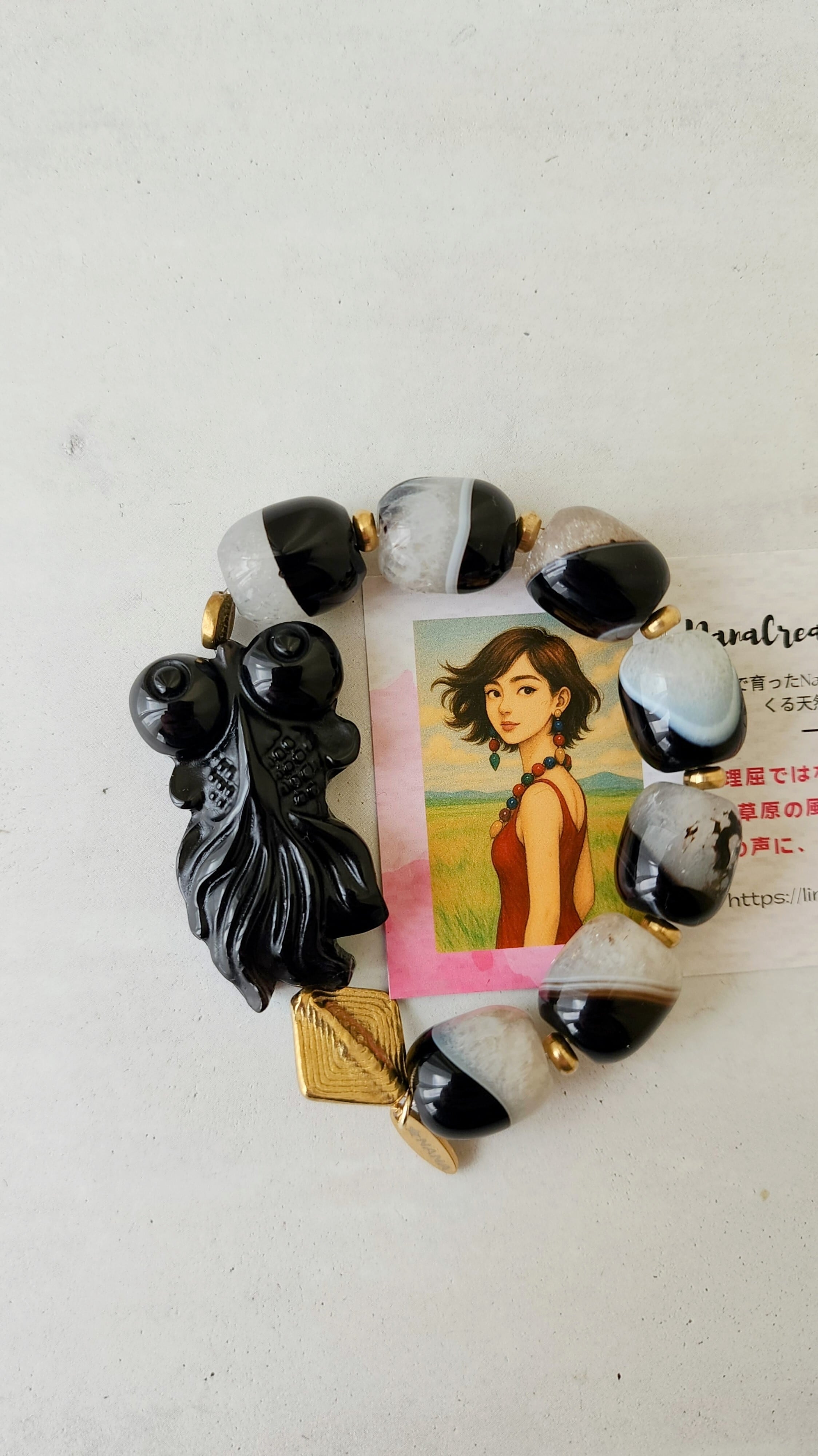モリオンで彫られた金魚に、ブラックアゲートクォーツと真鍮を合わせたブレスレットです。