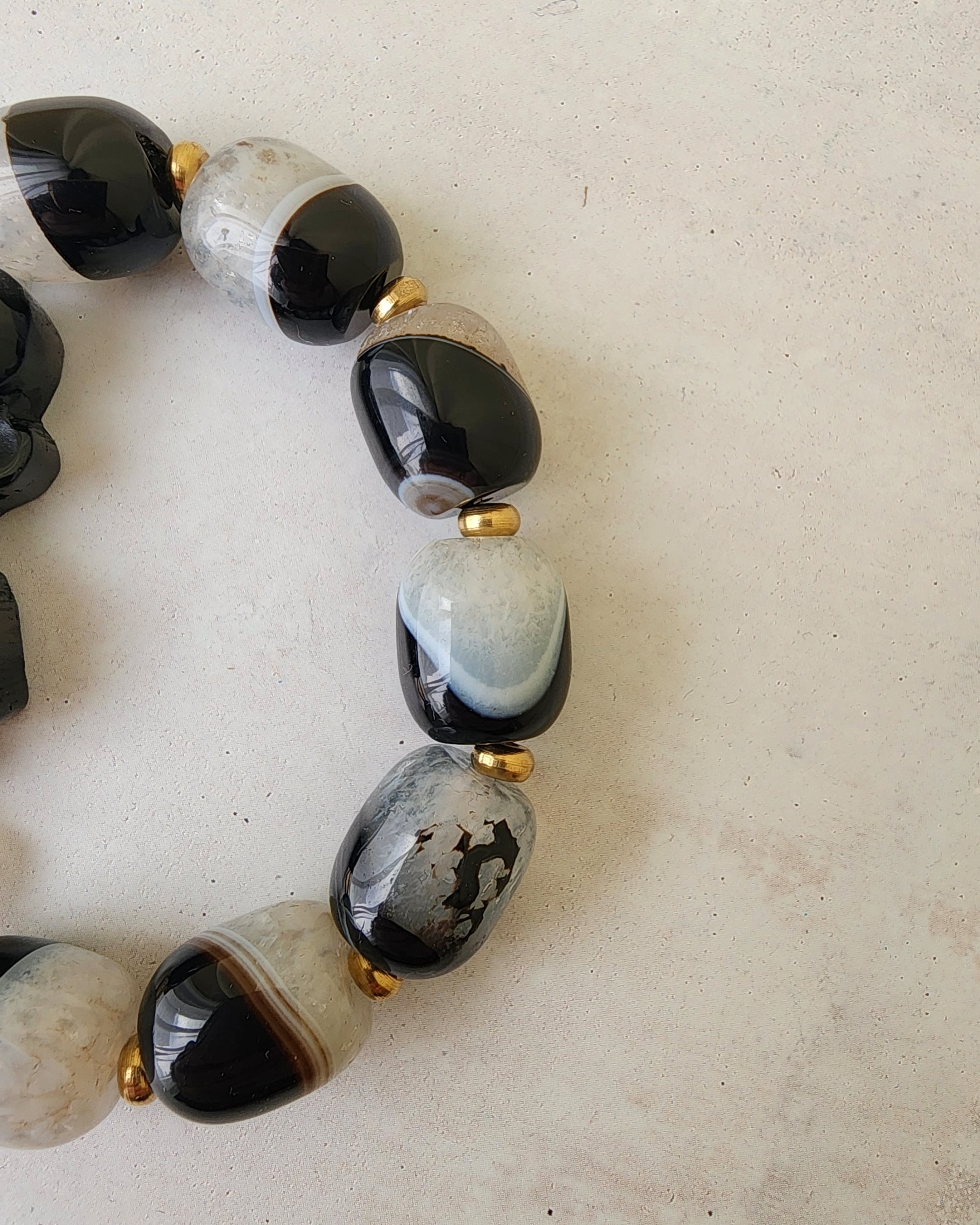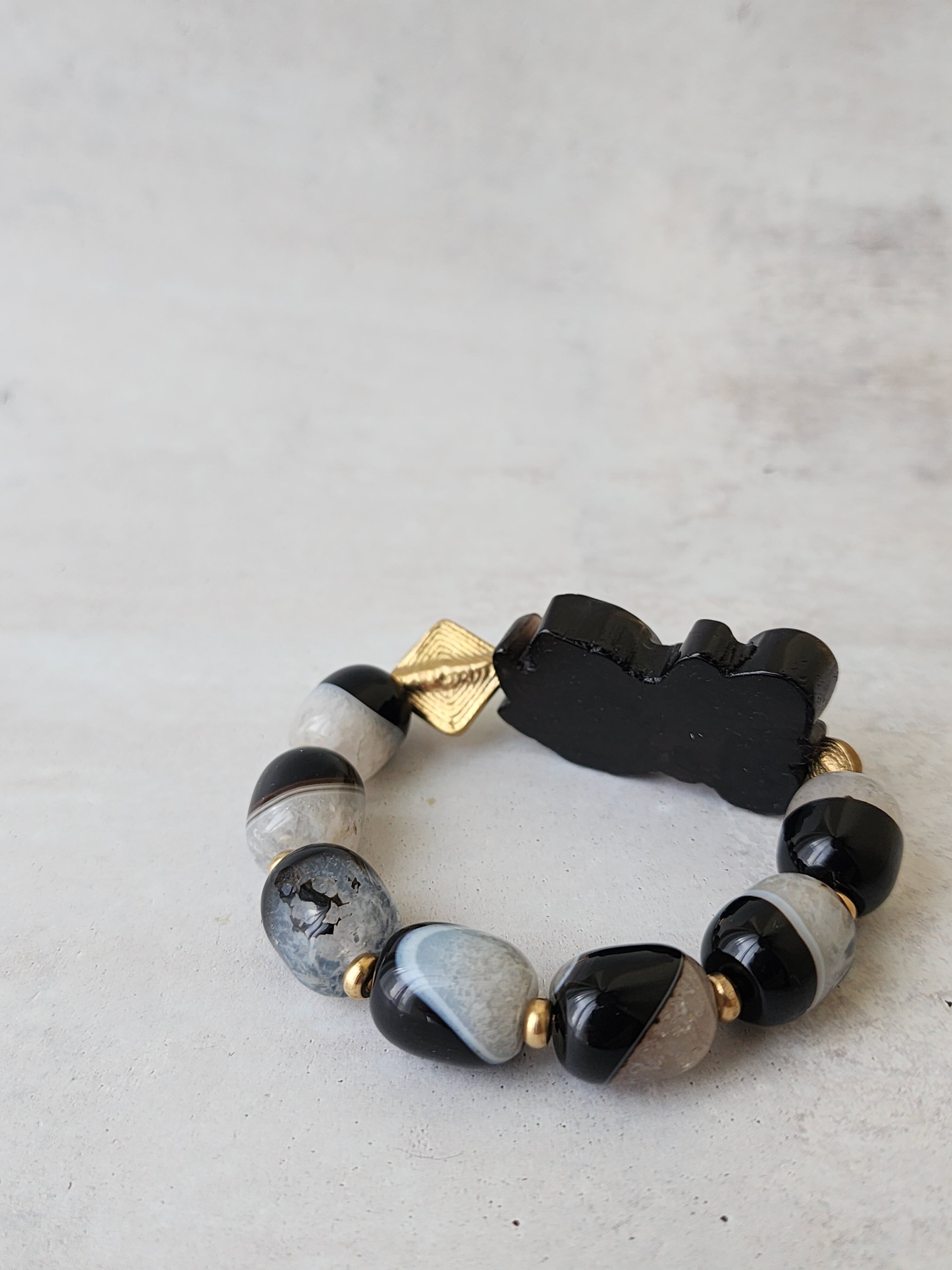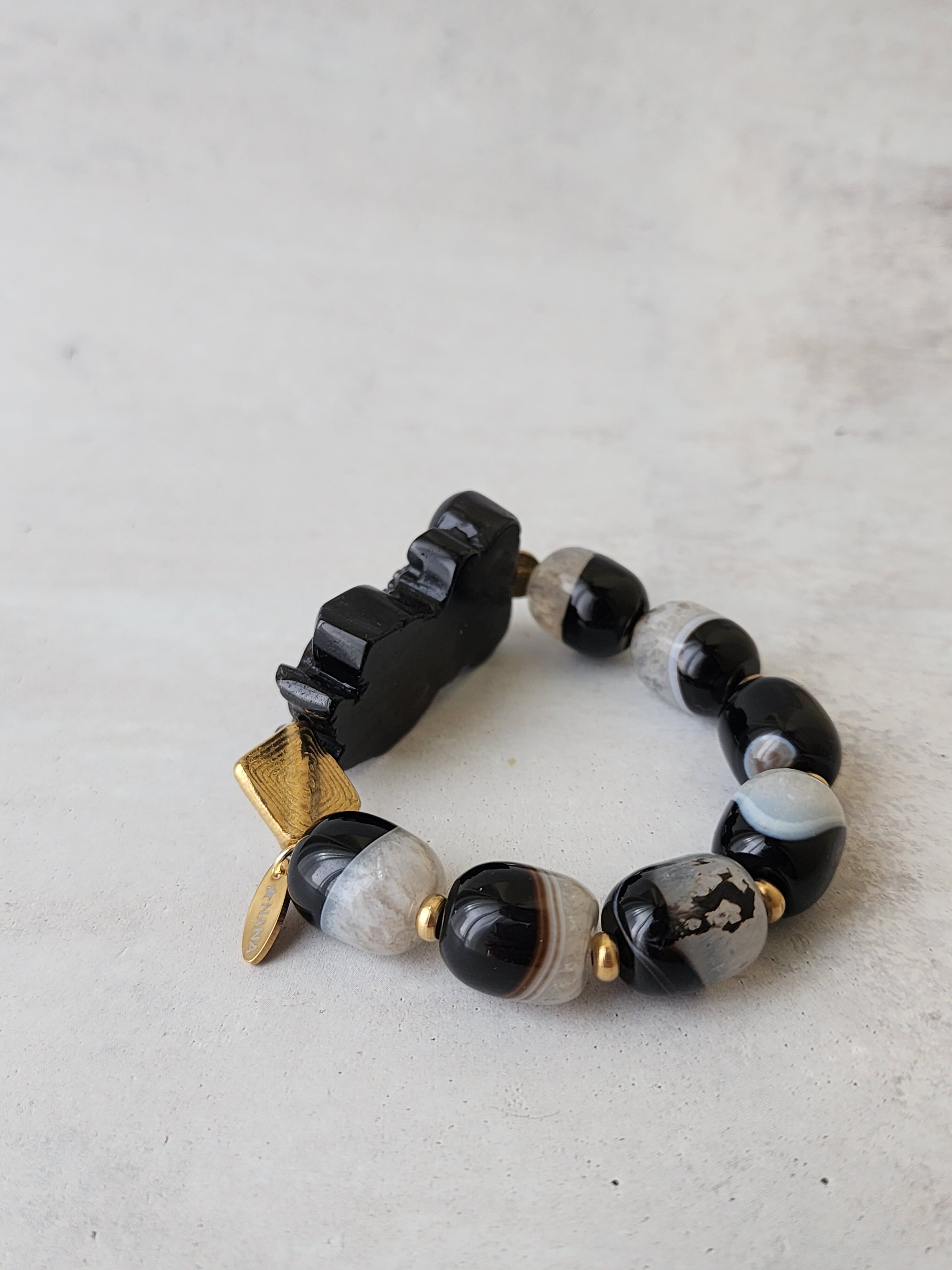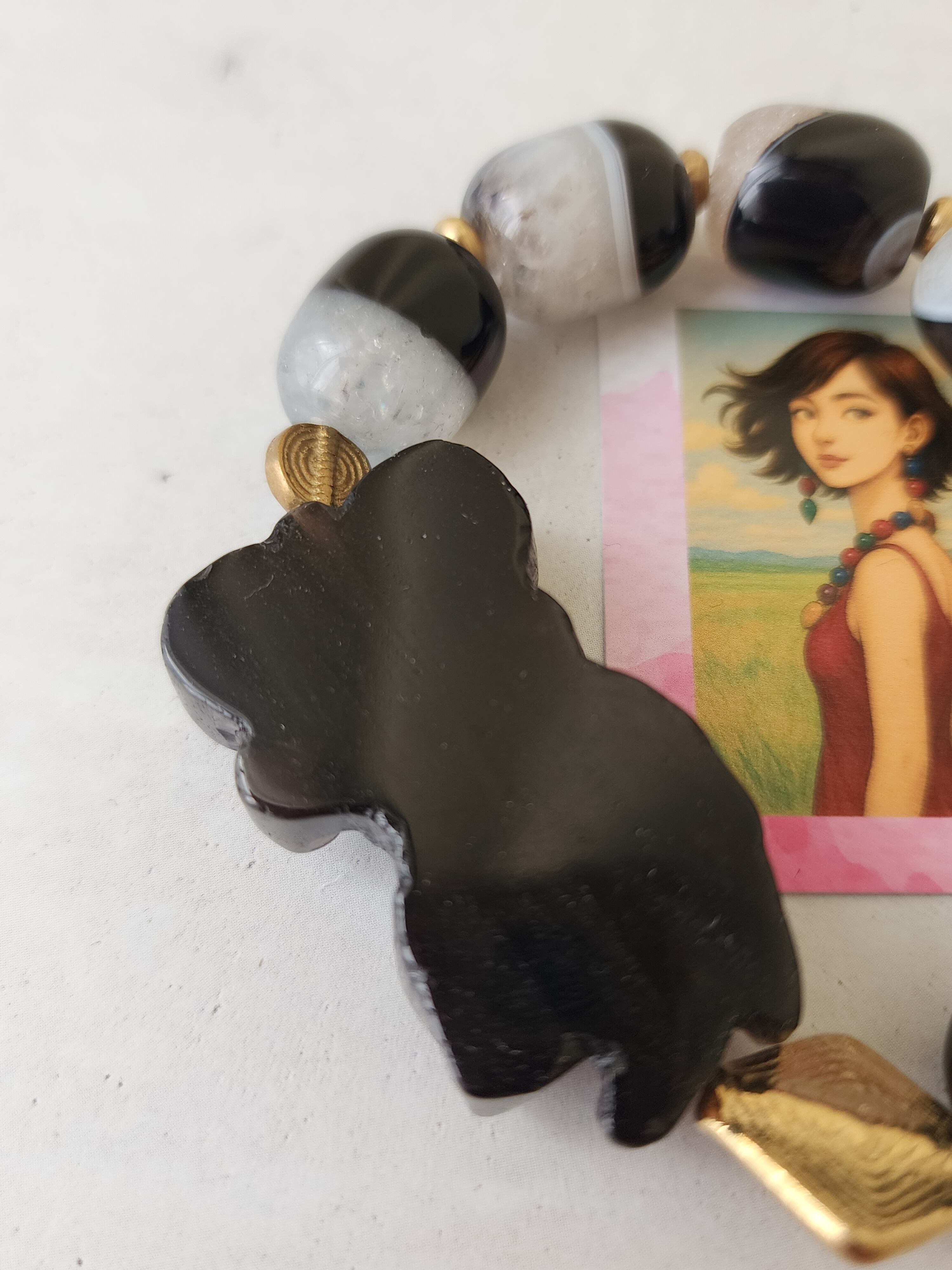 モリオンで彫られた金魚に、ブラックアゲートクォーツと真鍮を合わせたブレスレットです。