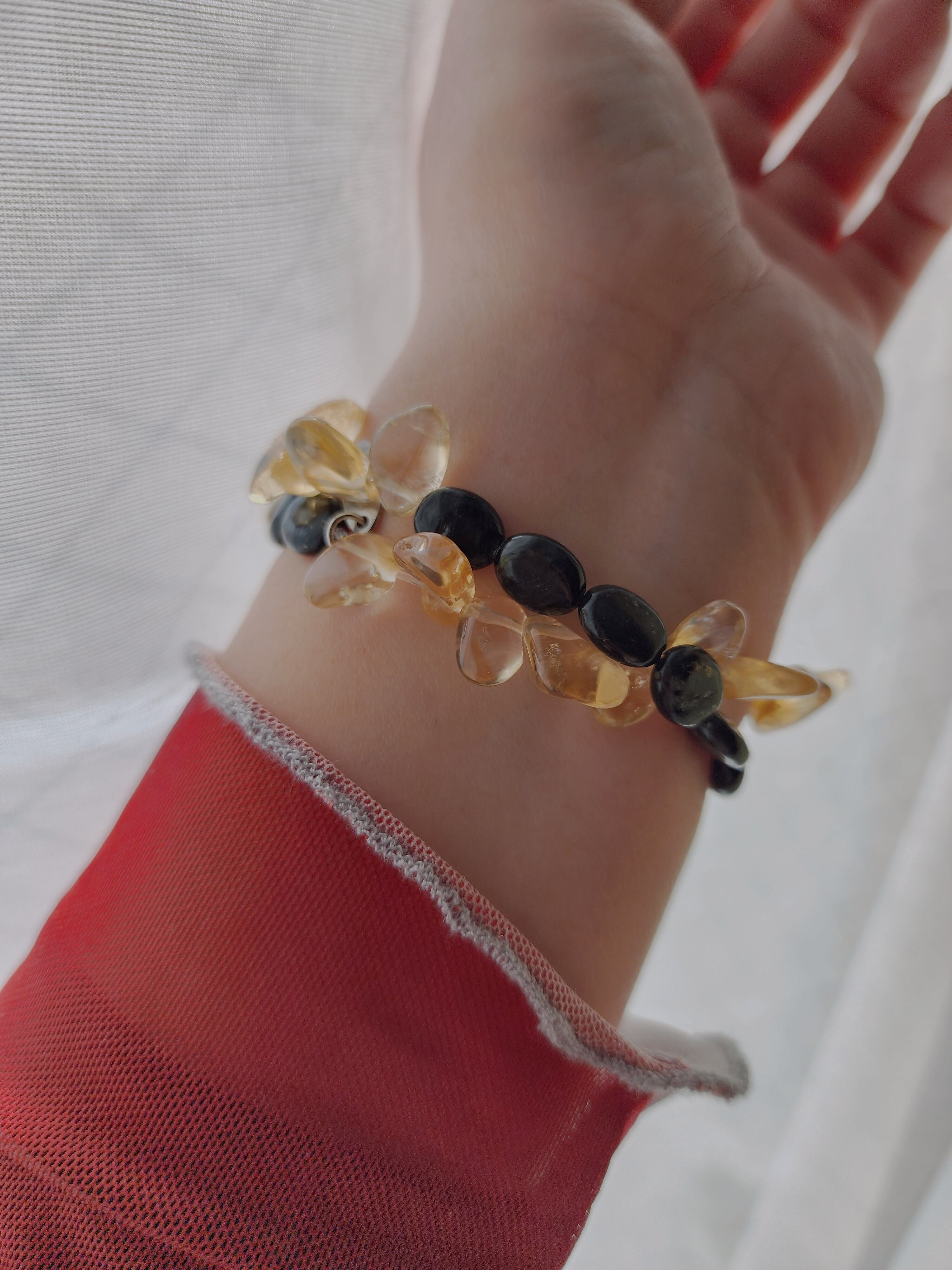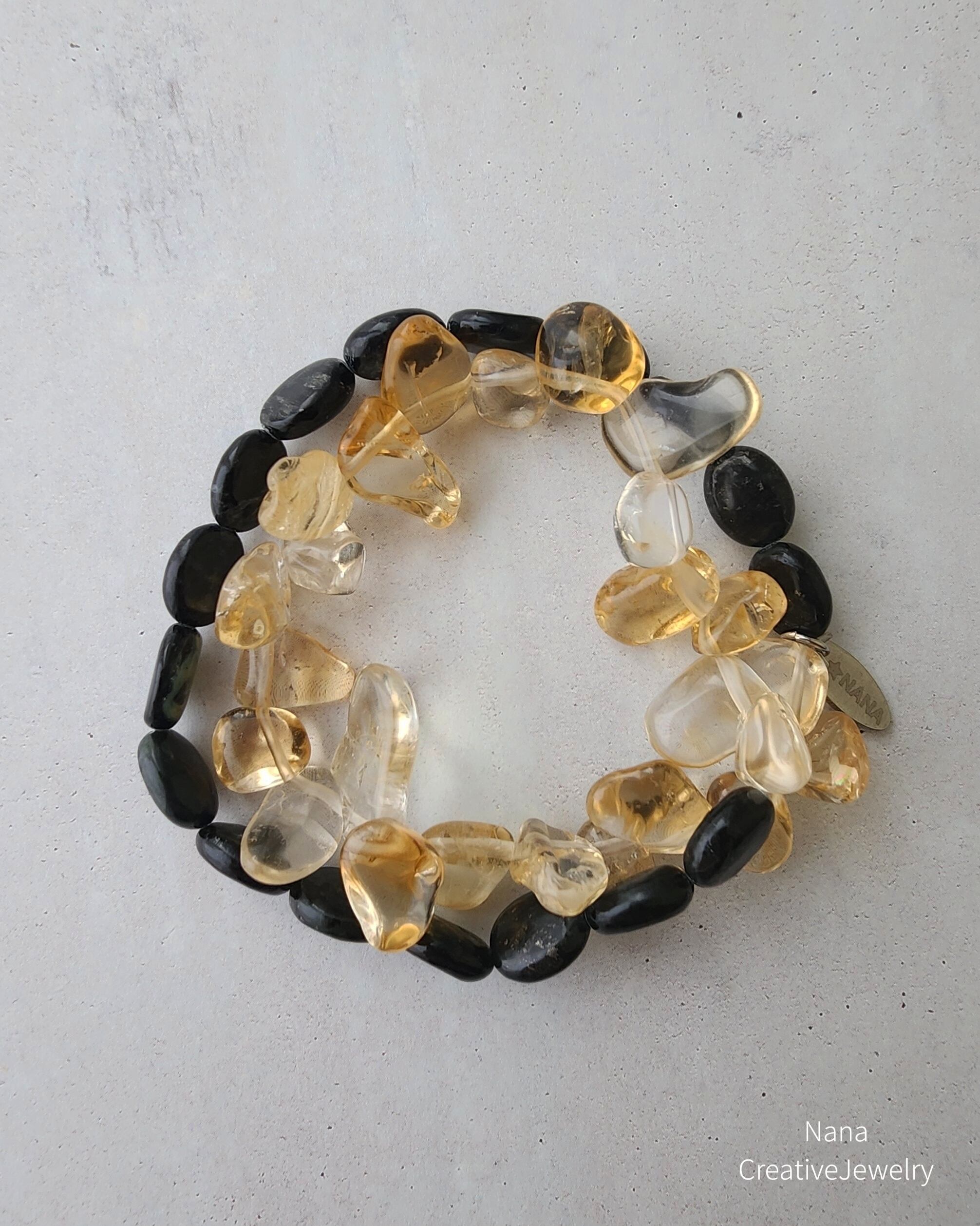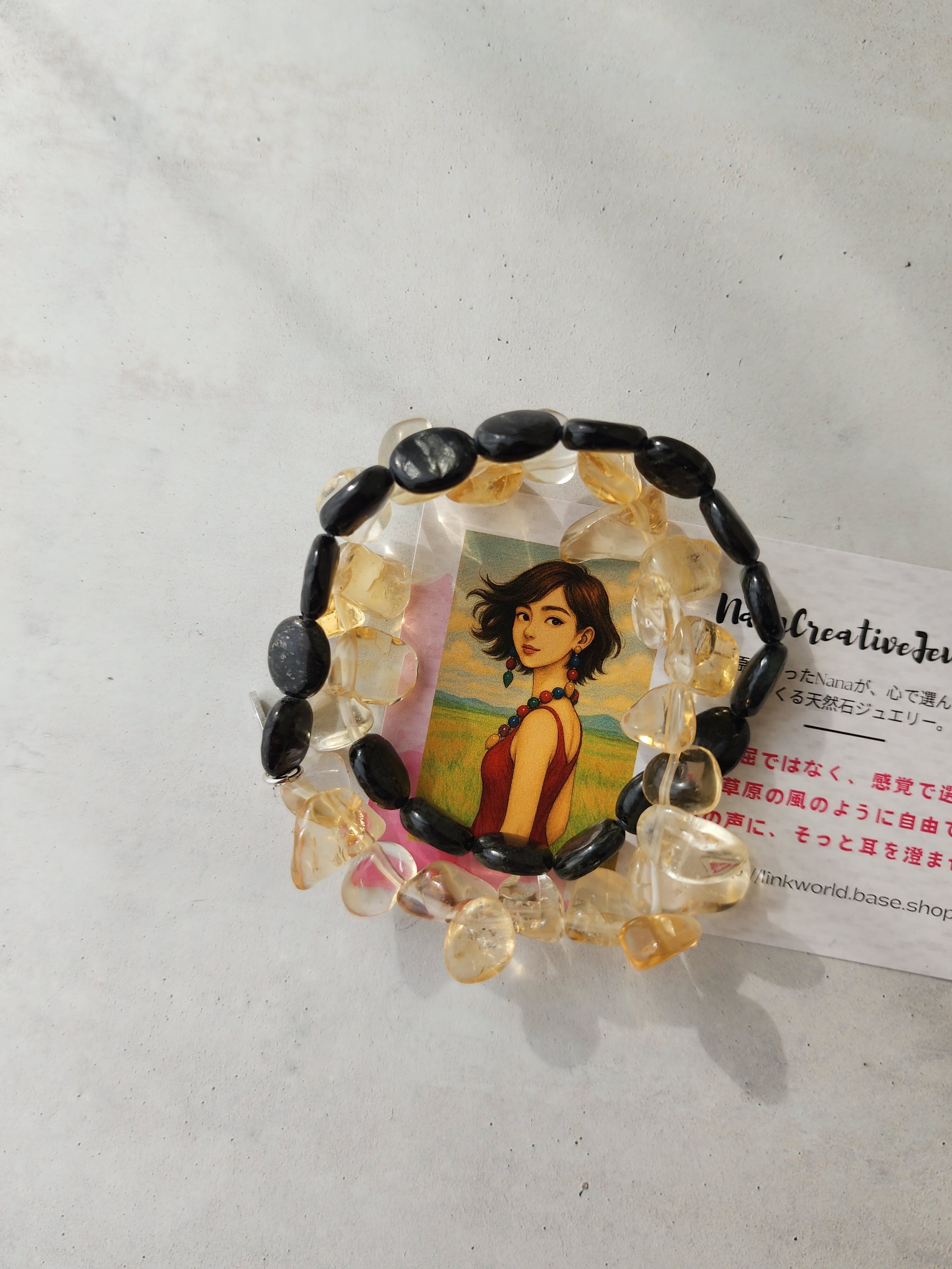 深い夜色のヌーマイトに、蜂蜜色のシトリンを重ねた二連ブレスレット。