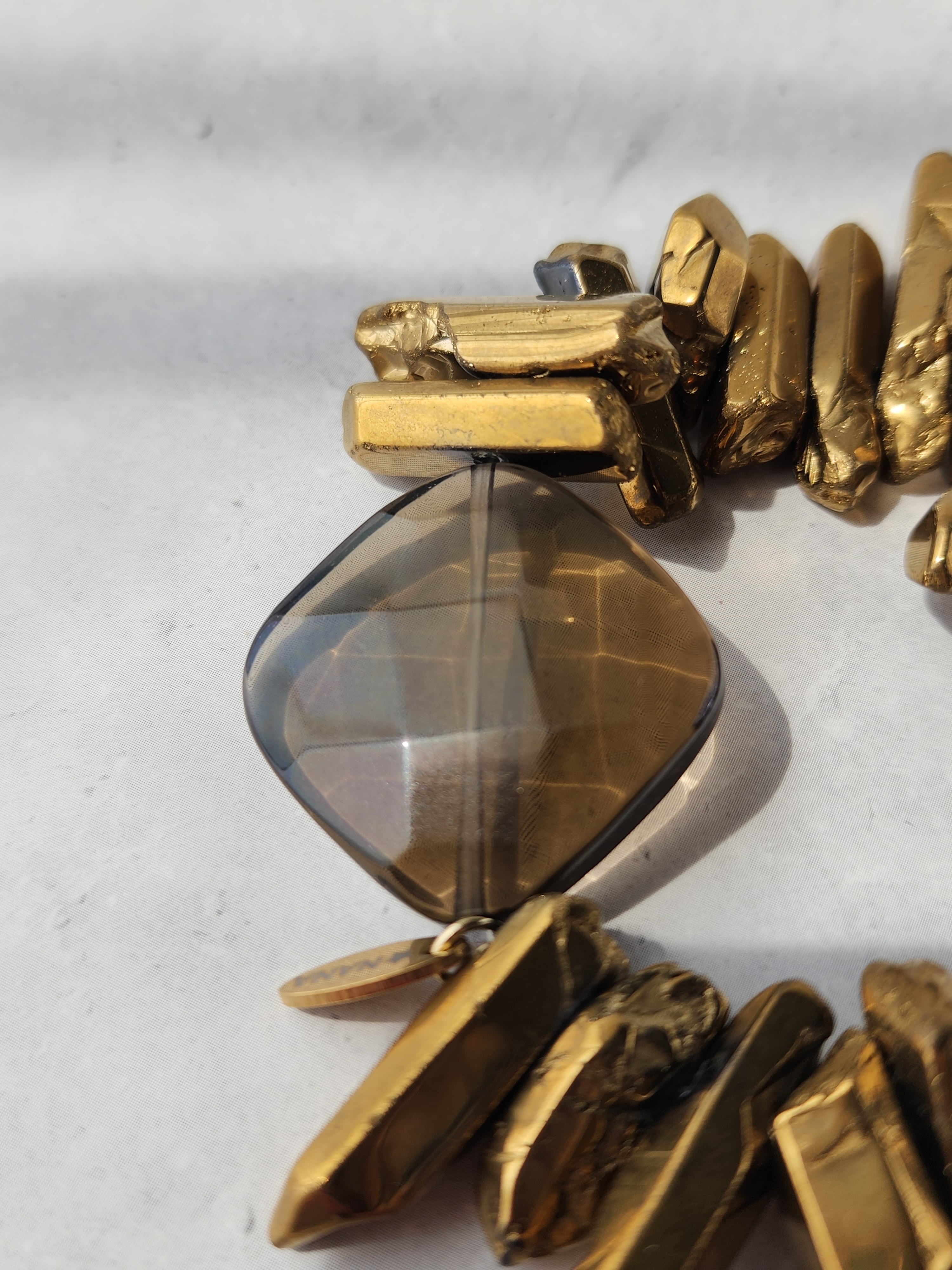 スモーキークォーツの落ち着いた透明感に、クリスタルゴールドコーティングの重厚な輝きを重ねたブレスレット。