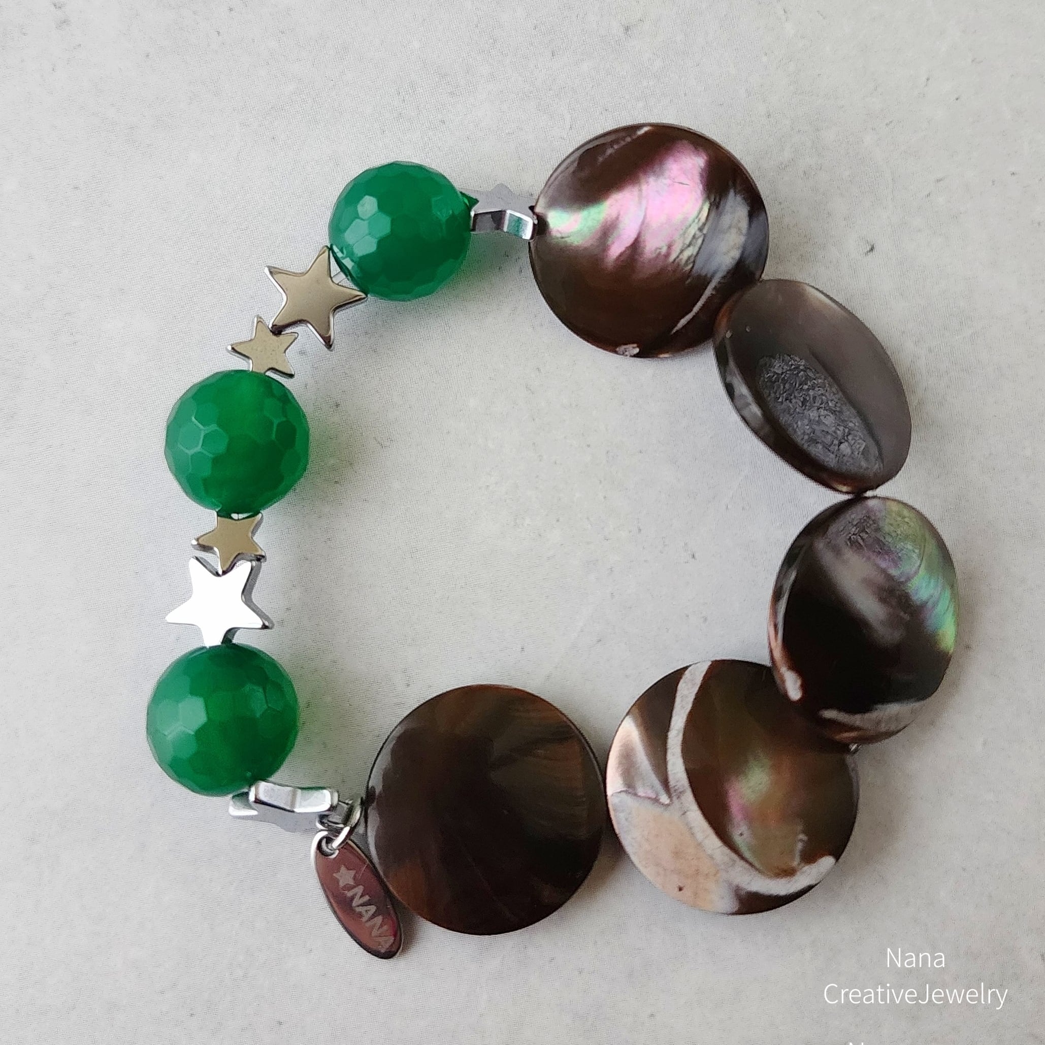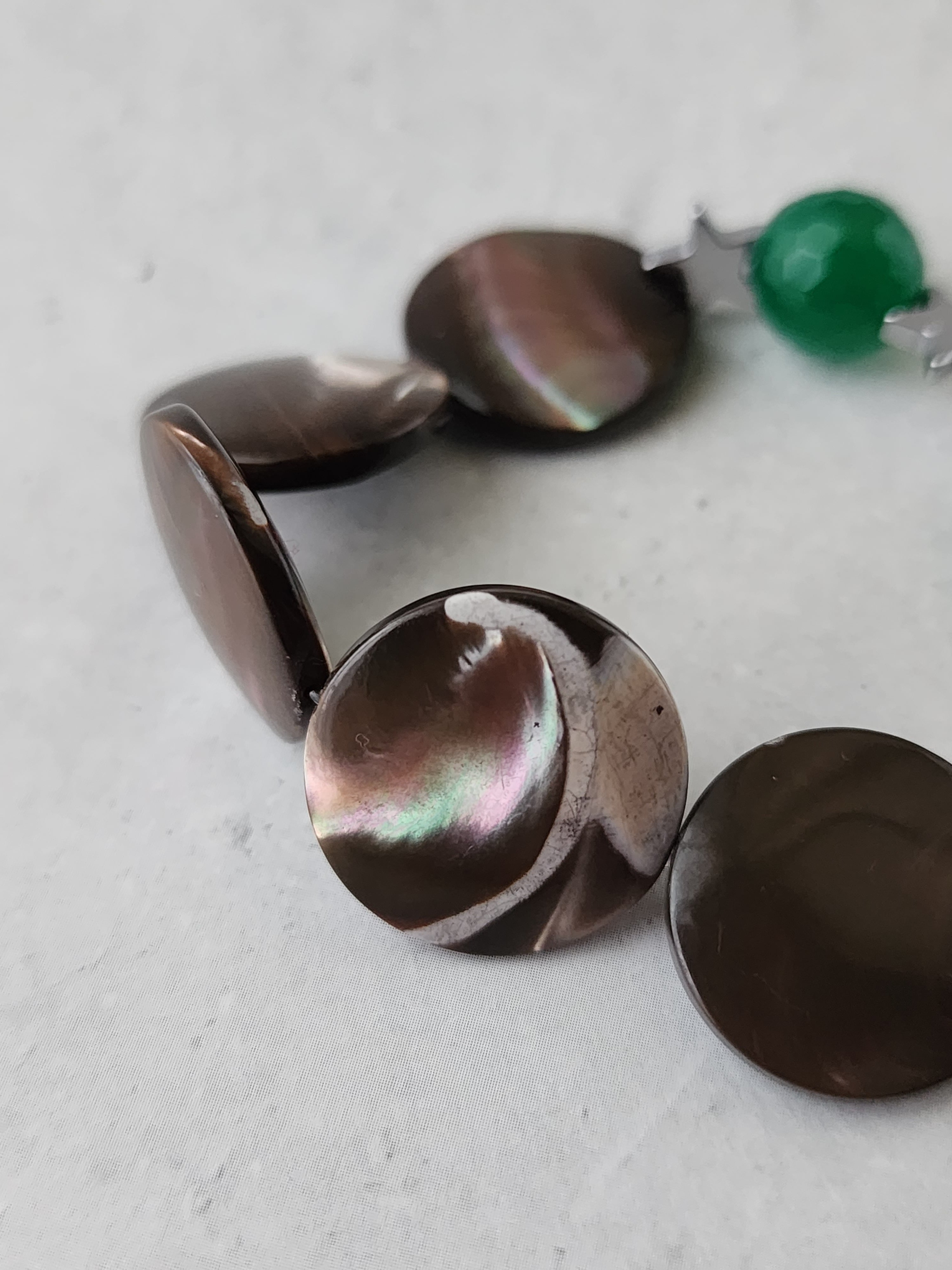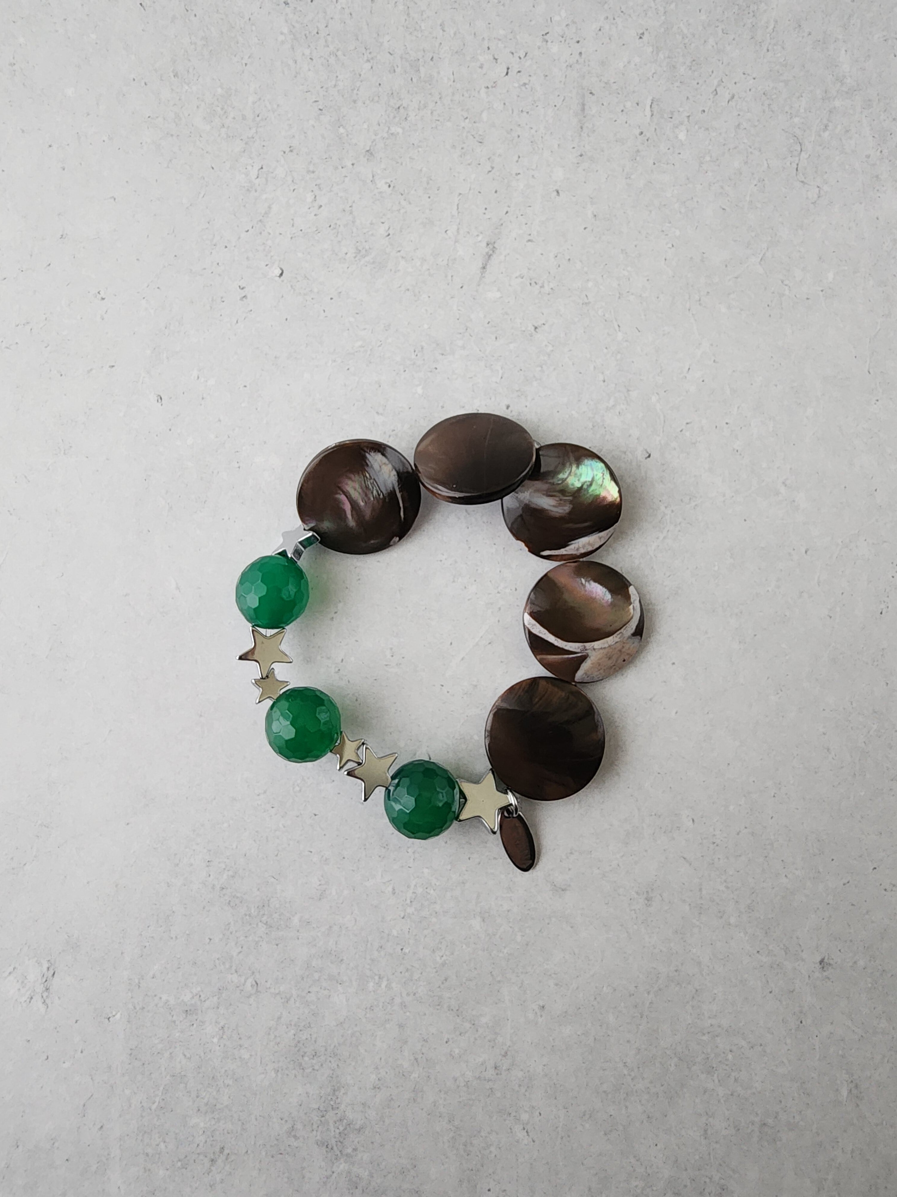 ブラウンのマザーオブパールに、鮮やかなグリーンアゲートを合わせたブレスレット。