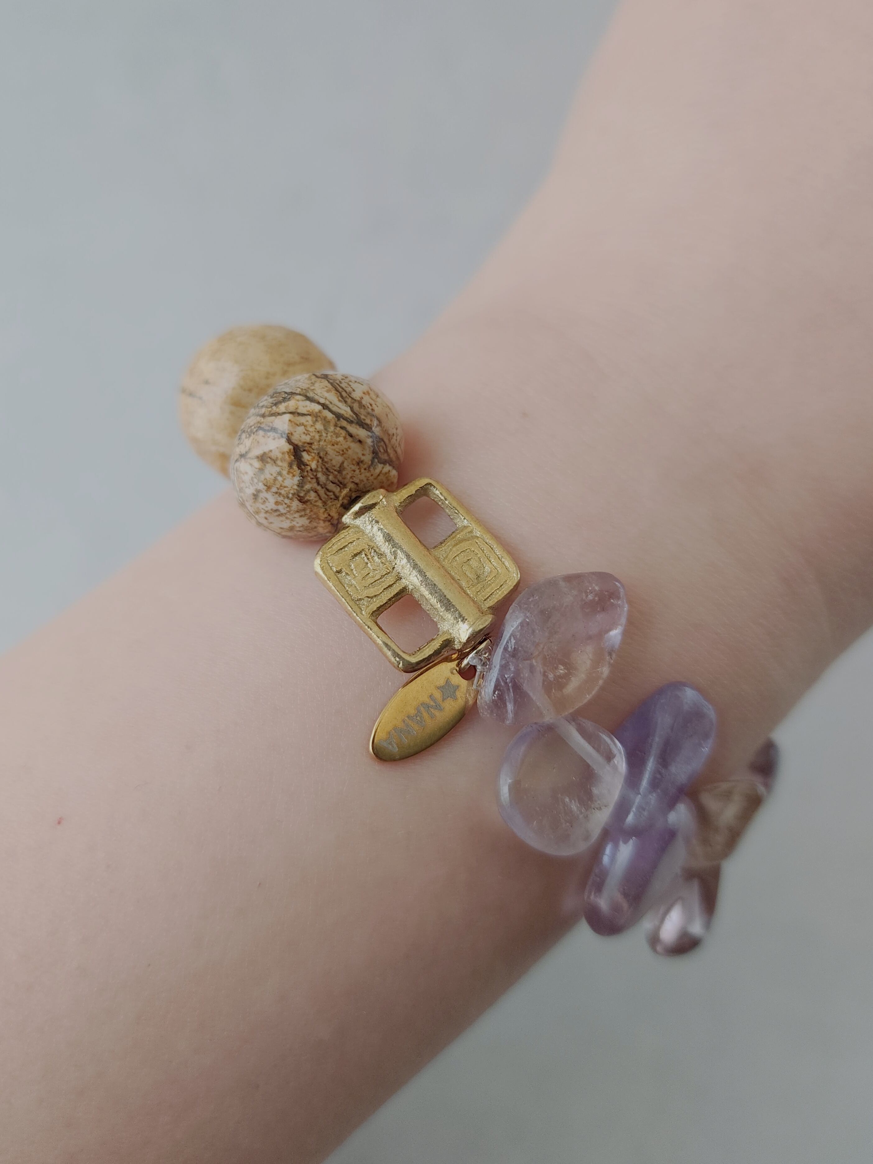 土の色を思わせるピクチャージャスパーに、アメトリンの淡い紫と蜜色の光。