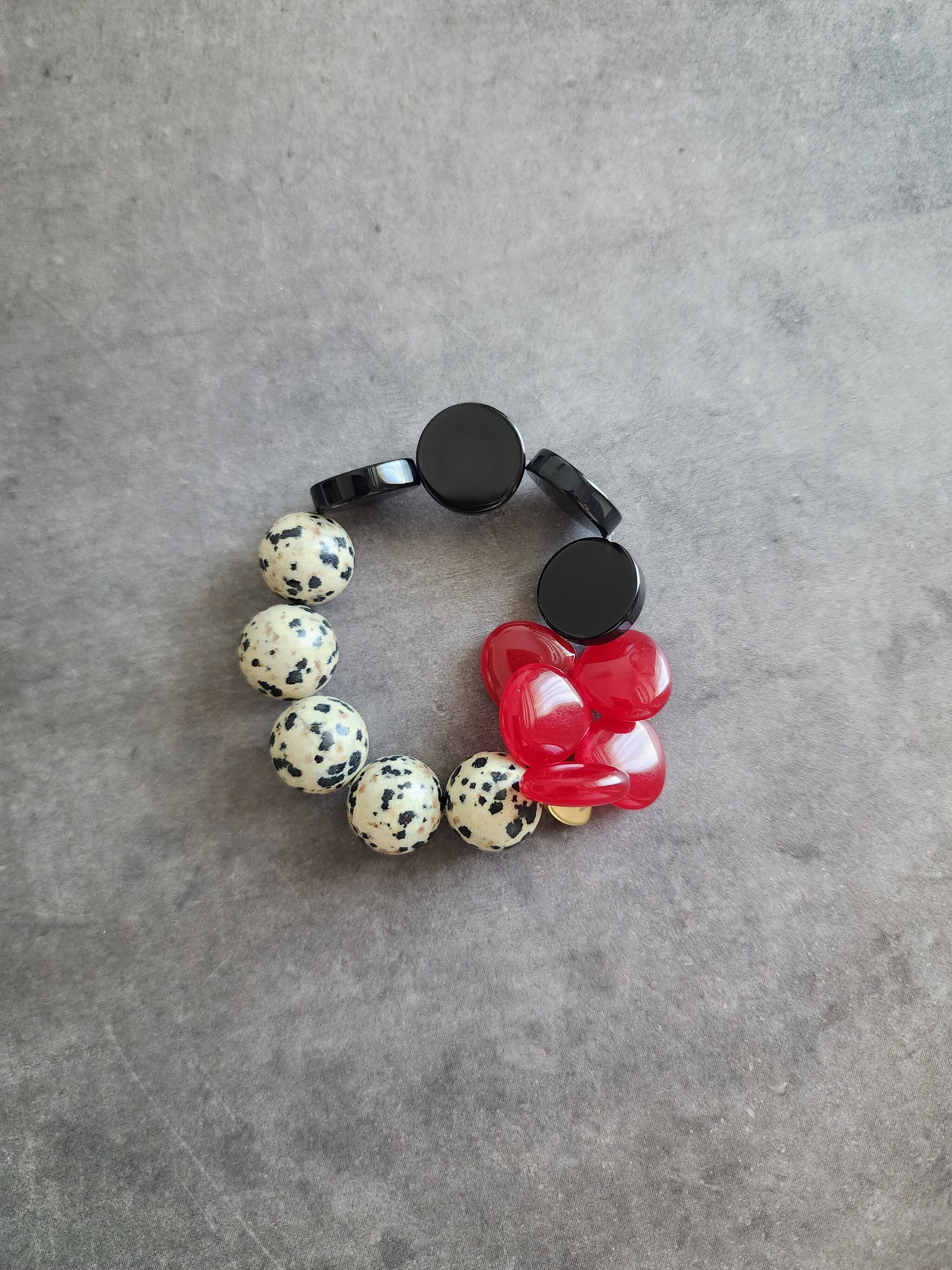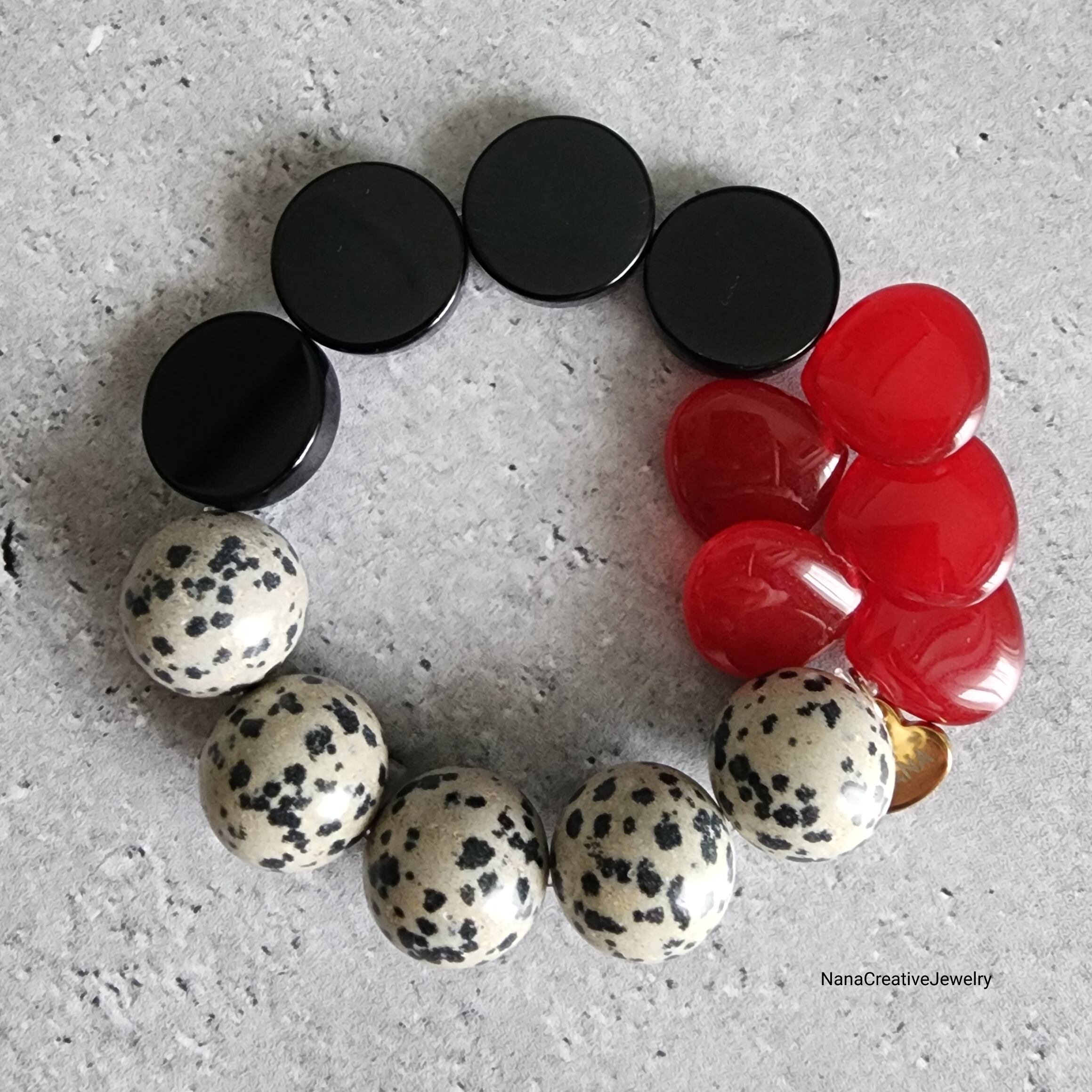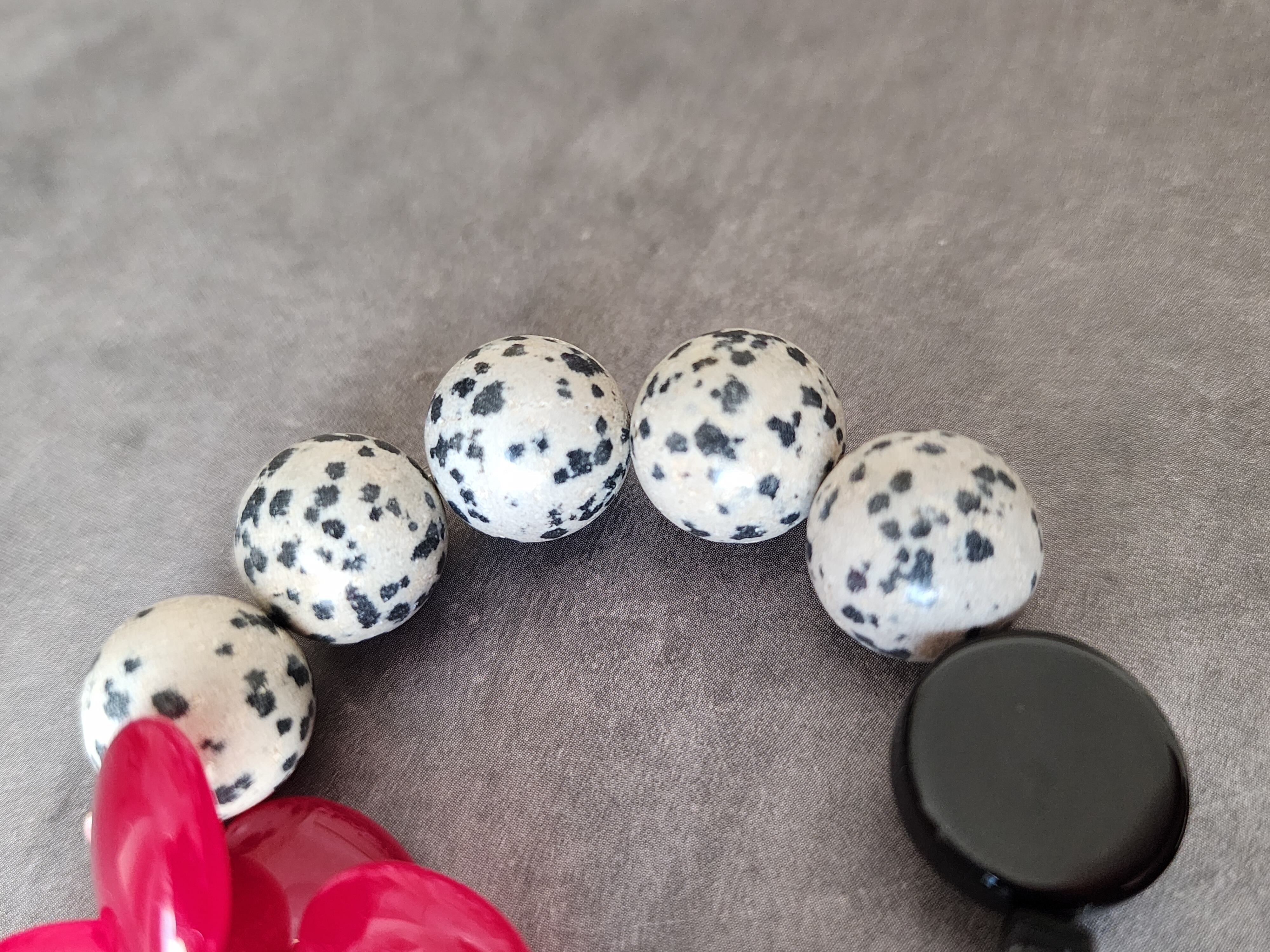キュートなダルメシアンジャスパーは存在感の大きい14mmサイズ、コイン形状のブラックオニキスと一緒に垢抜け感のあるペアに花びらのようなレッドカラージェイドをつけて、スタイリッシュで洗練された一本に。