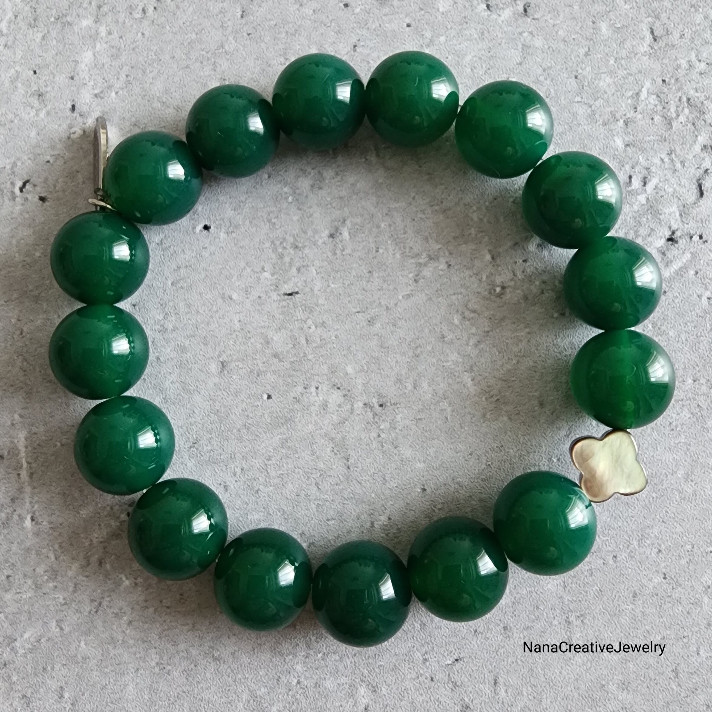濃いめグリーンが美しく奥深い魅力を解き放つグリーンアゲートのラウンドビーズを並べて、ブラックシェルの小さいお花をアクセントとして仕立てた簡潔でチャーミングなブレスレットです。