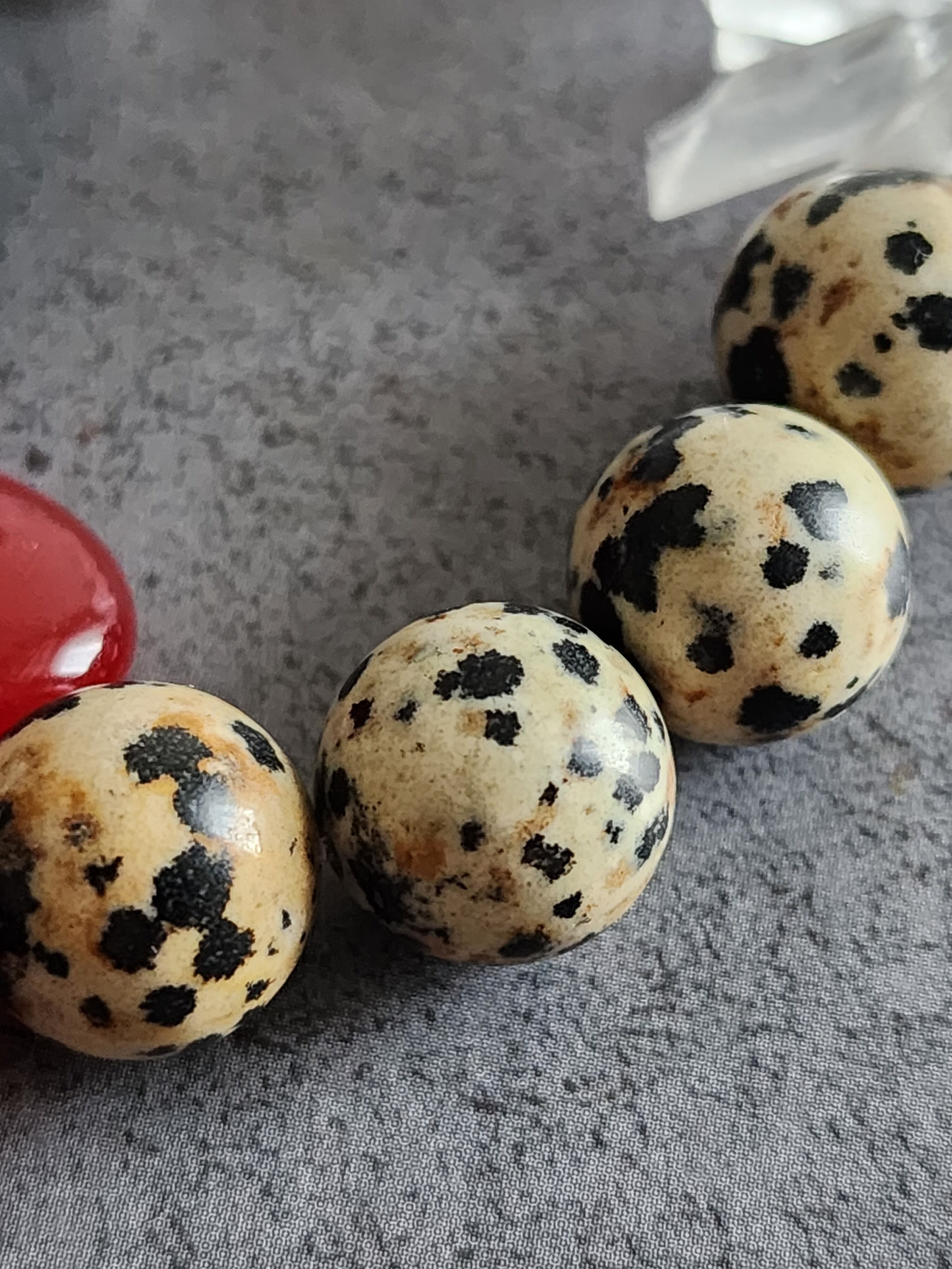 可憐な赤いマロン形ジェイドとピュアで氷のようなクリスタルでヌーマイトの上品さを引き立て、ダルメシアンジャスパーでよりスタイリッシュで洗練された印象を与えた。