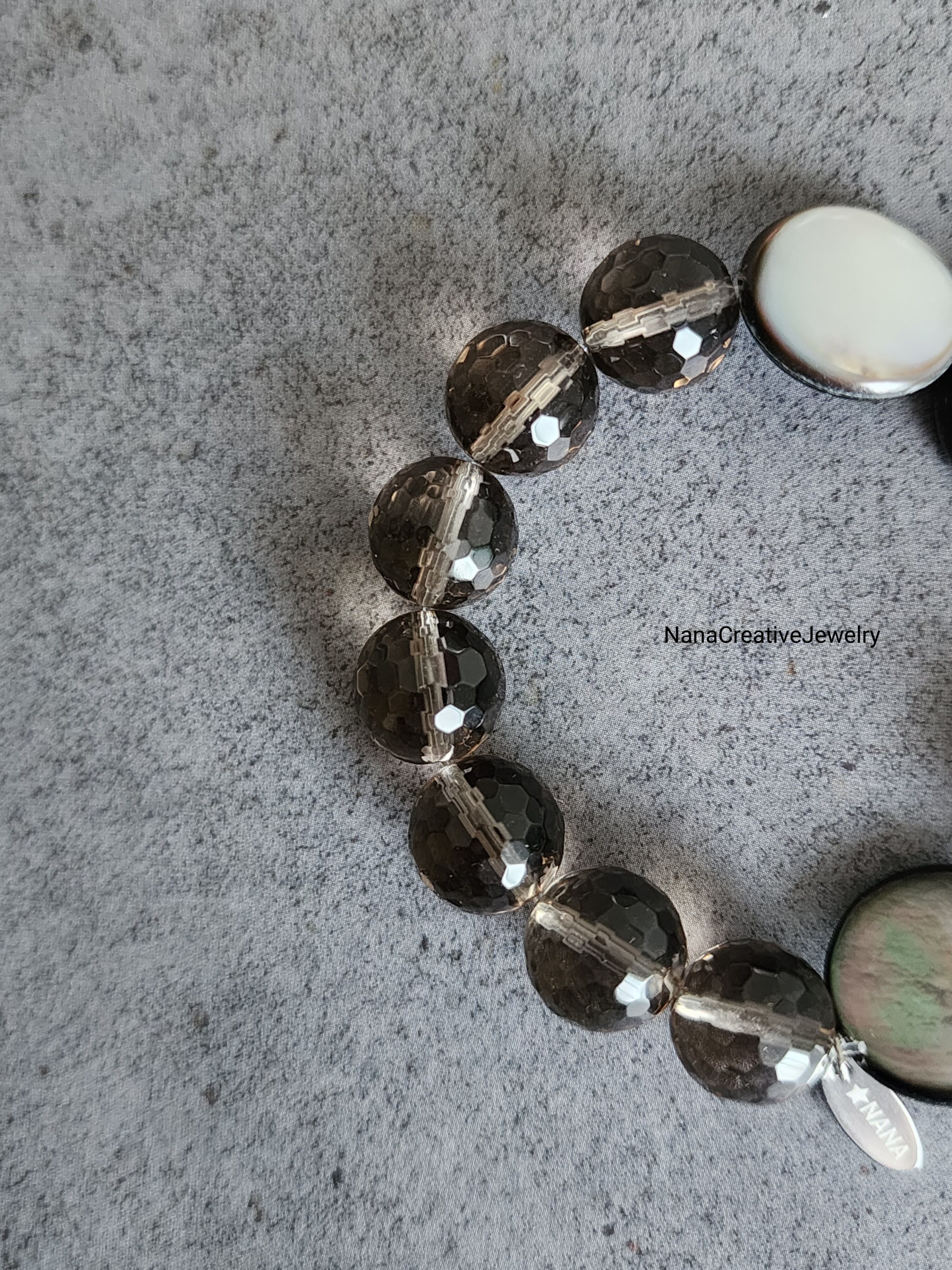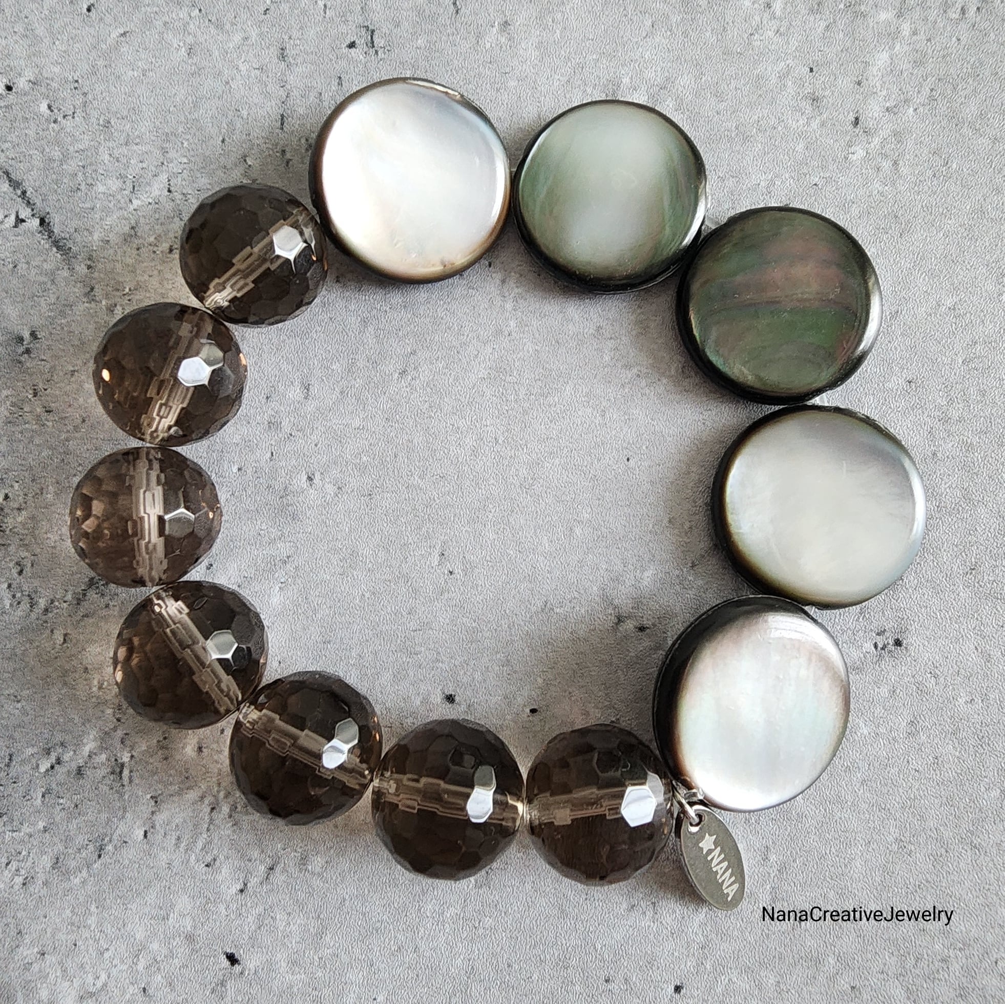 貝独特な照りが美しく、飽きない上品な虹色の輝きを持つ高品質のブラックシェルとシックで透明感の高いスモーキークォーツの多面カットのペアは心を落ち着かせ、奥深い魅力を漂う神秘的雰囲気のブレスレットです。