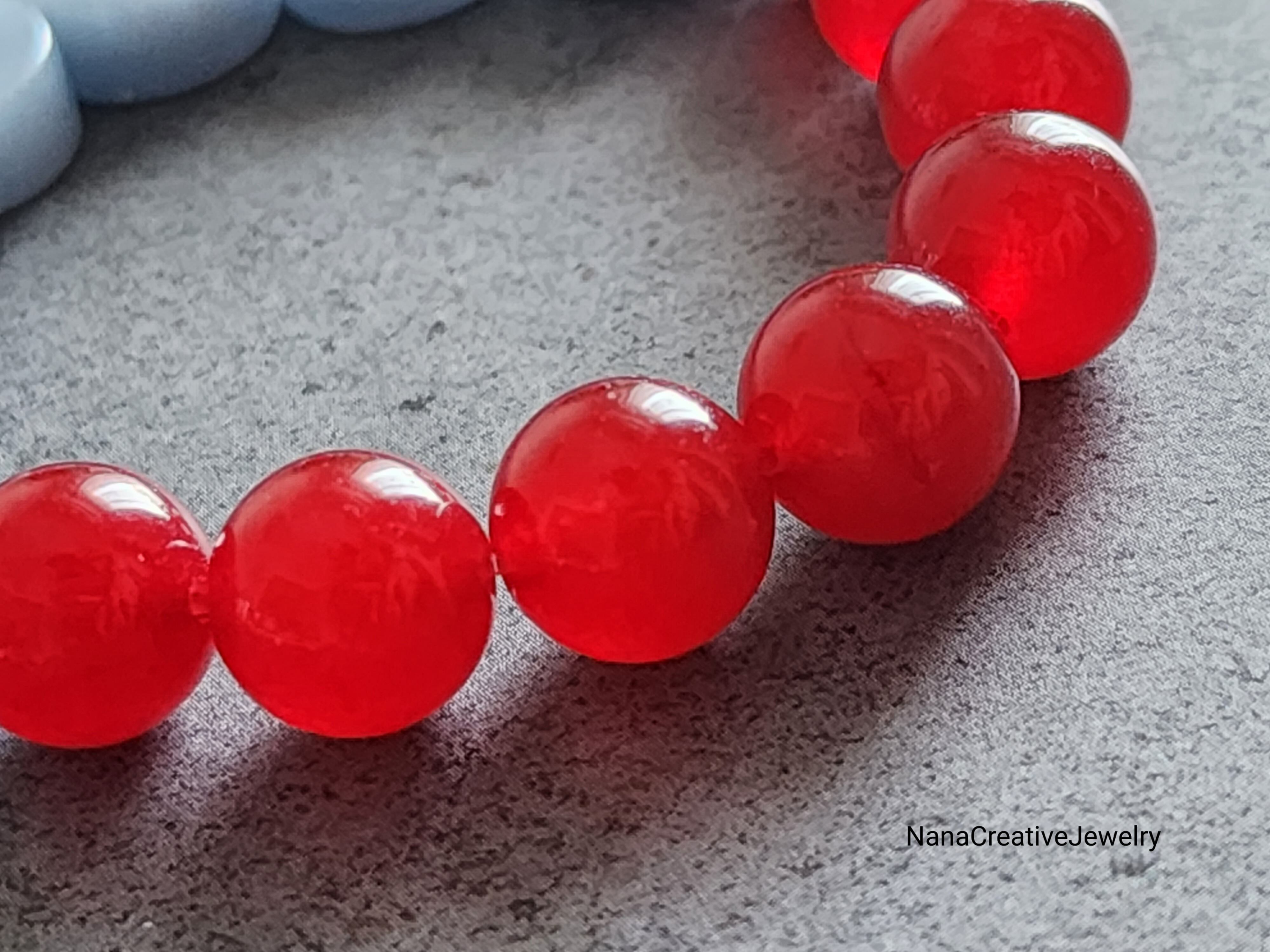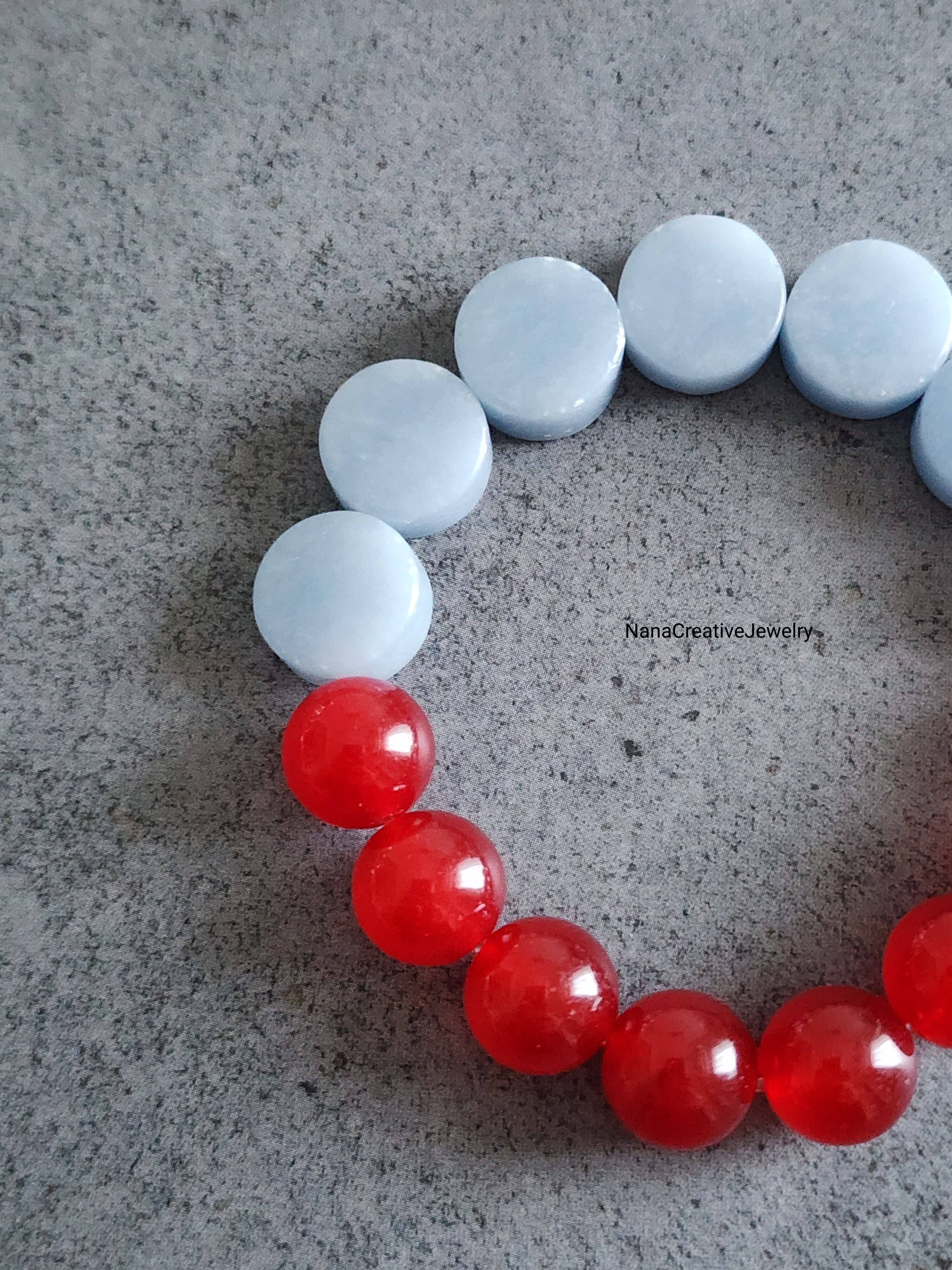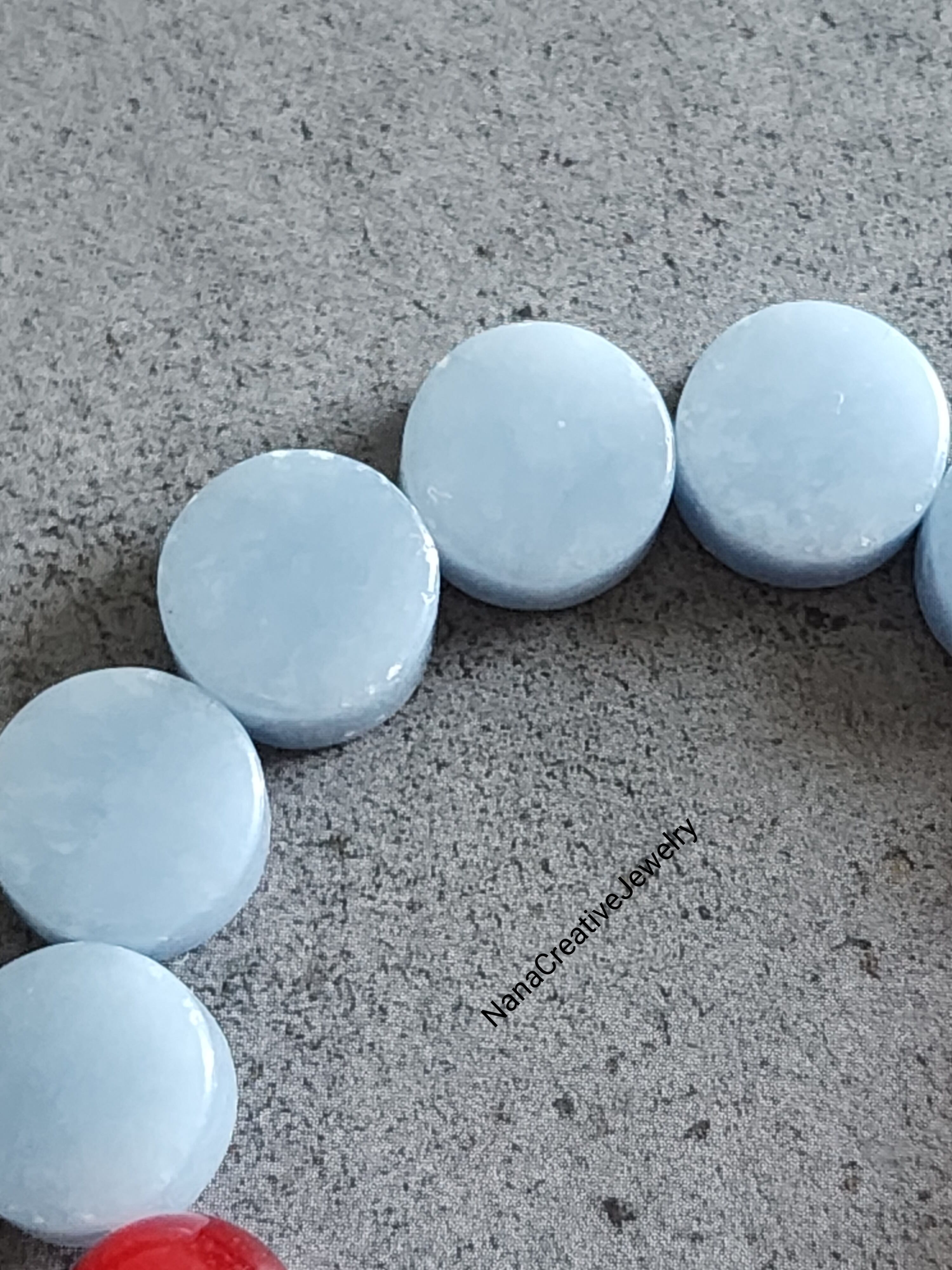 ジューシーな色合いと艶感が美しいレッドジェイドと優しいブルーカラーのキュートなエンジェライトコインのコンビネーションです。見る人の心をすぐに虜にするチャーミングな一本です。