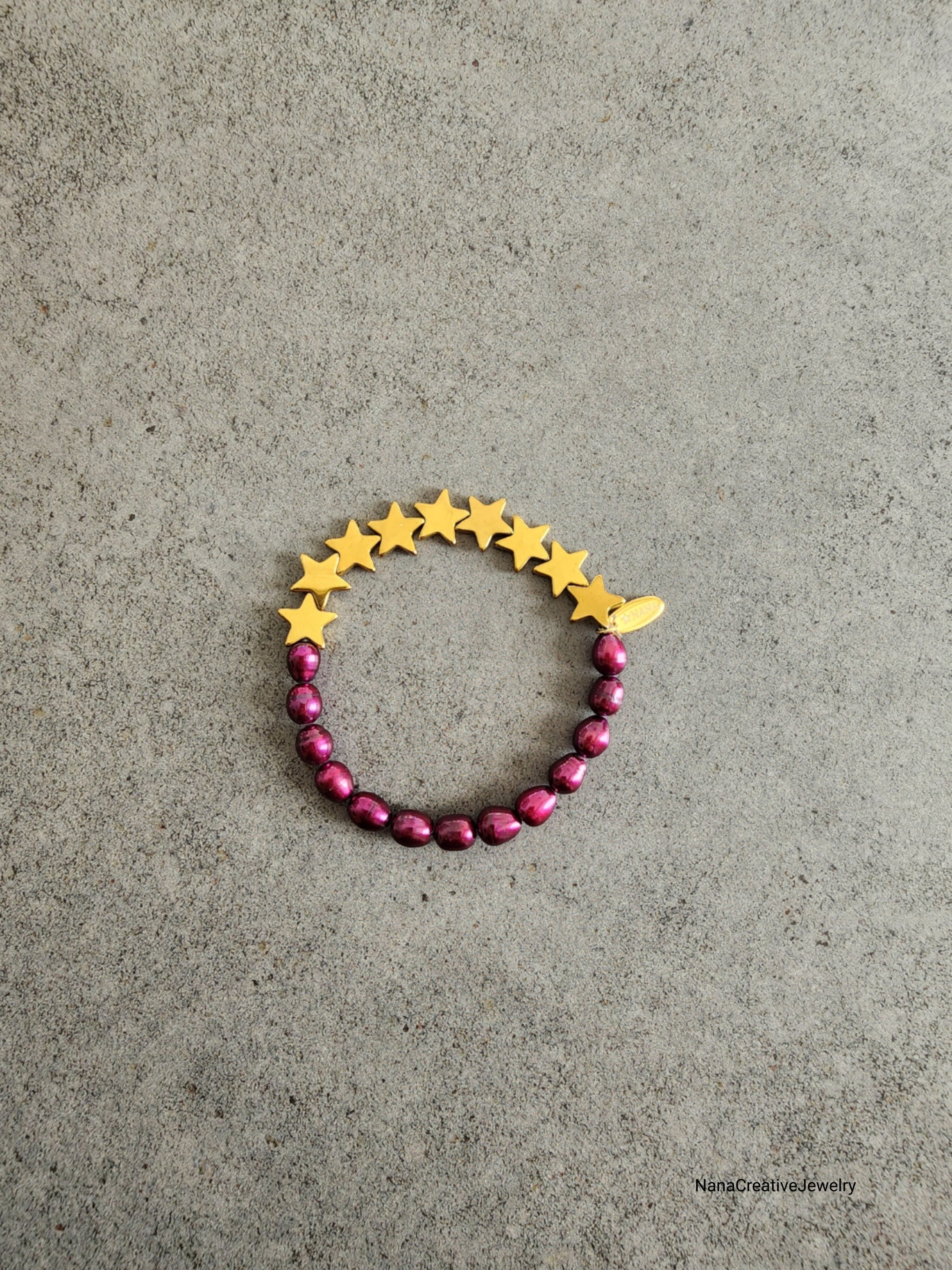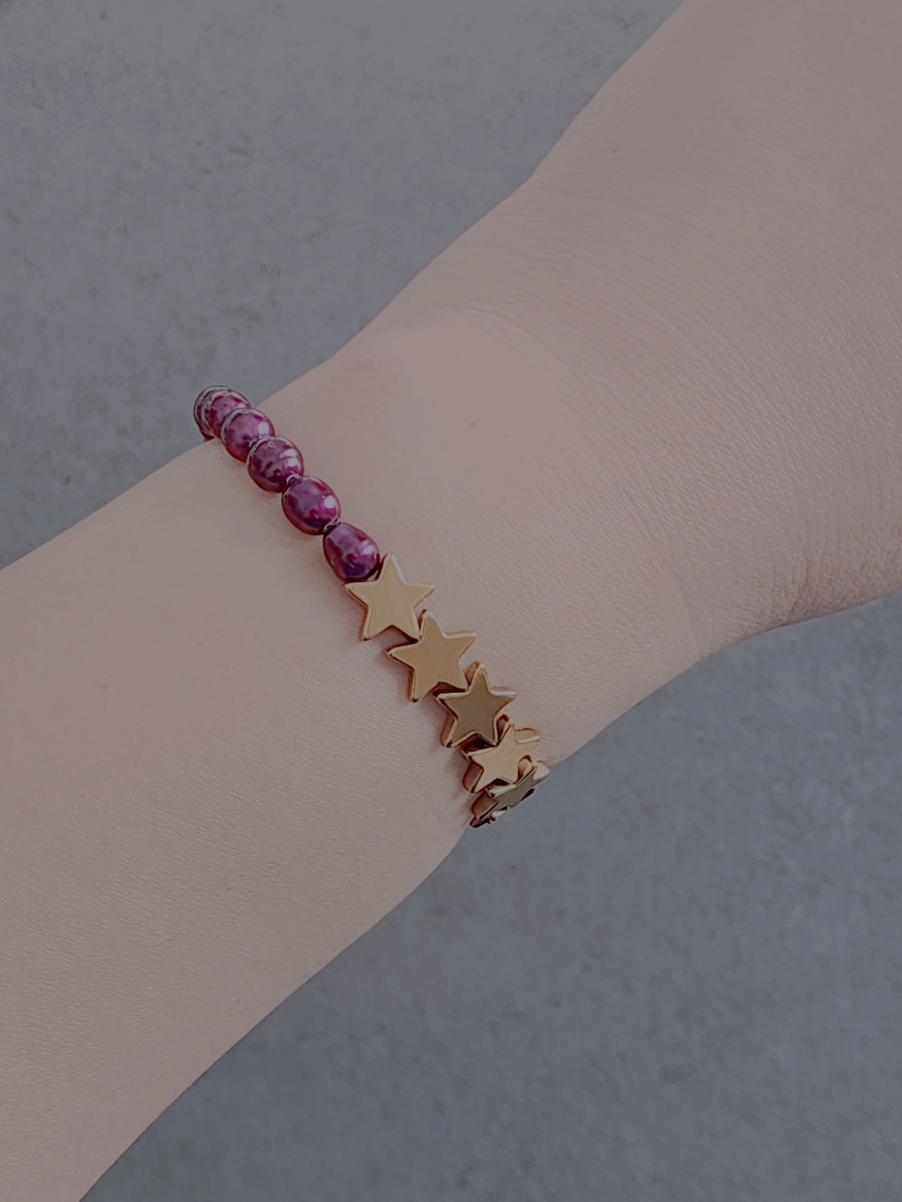 メタリックピンクの珍しい発色の淡水パールはシックな艶感で心の深い部分を癒してくれる。ゴールドカラーのヘマタイトスターを合わせて、高級感が漂い、これからの季節に合わせやすい色合いを持つブレスレットに。