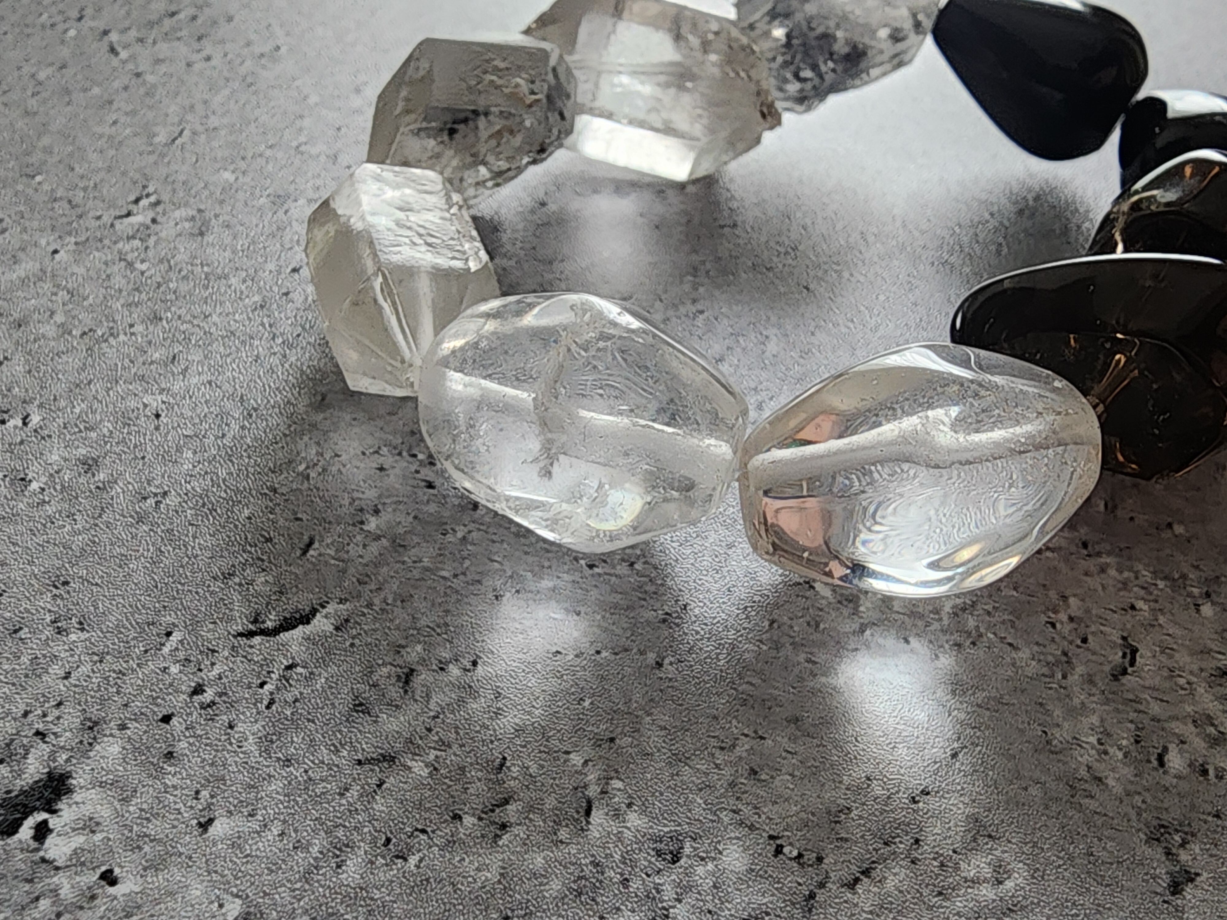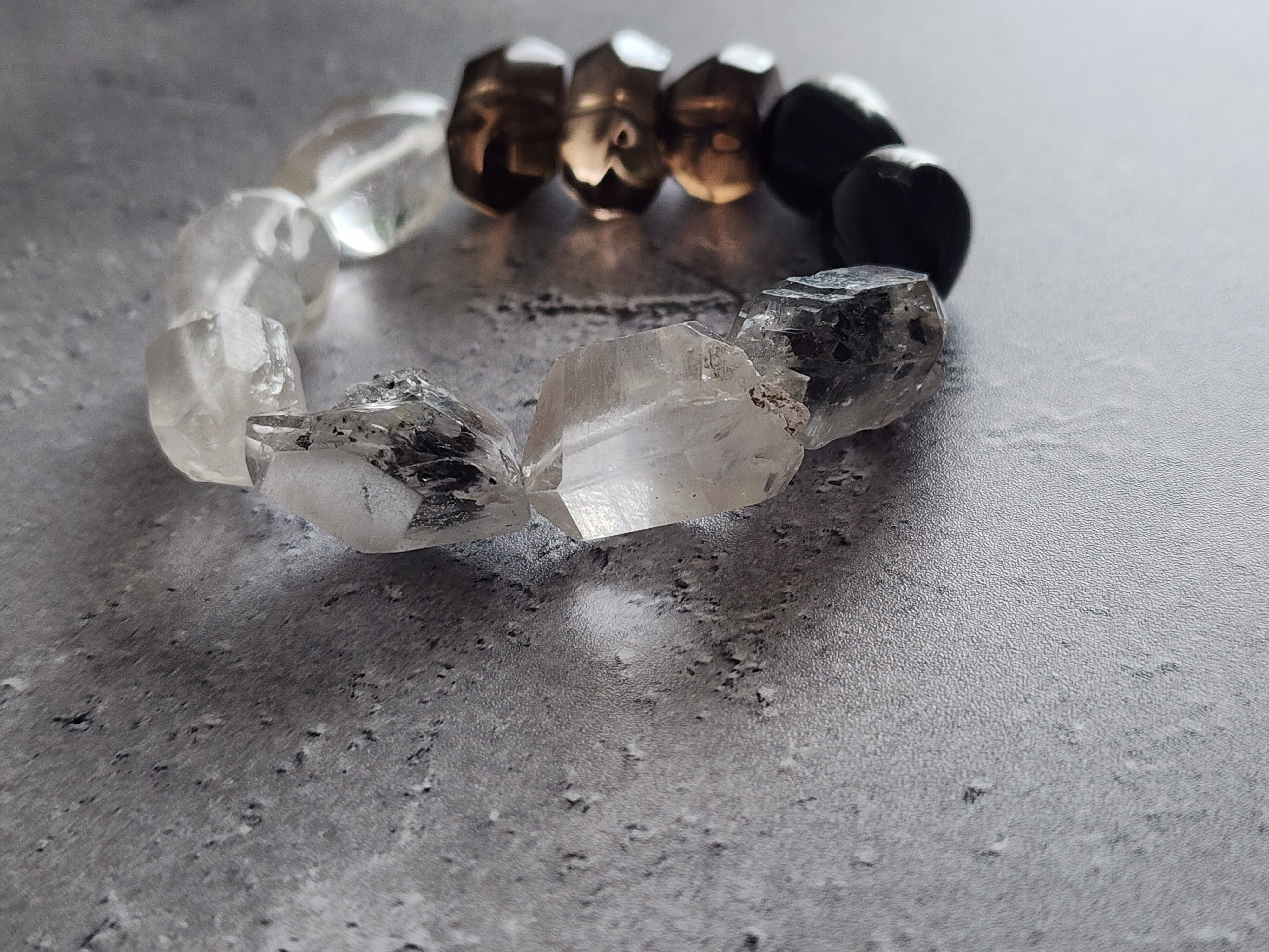 クールなブラックカラーのインクルージョン(タール)が程よく入っていて、原石の結晶をそのまま活かしたアフガニスタン水晶と内包物が少なくクリアなクリスタルの大粒タンブルカットのペアに、ダンディーなスモーキークォーツタンブルとブラックオニキスドロップを加えて、どんなおしゃれにも馴染みやすいシックでハンサムなブレスレットに。