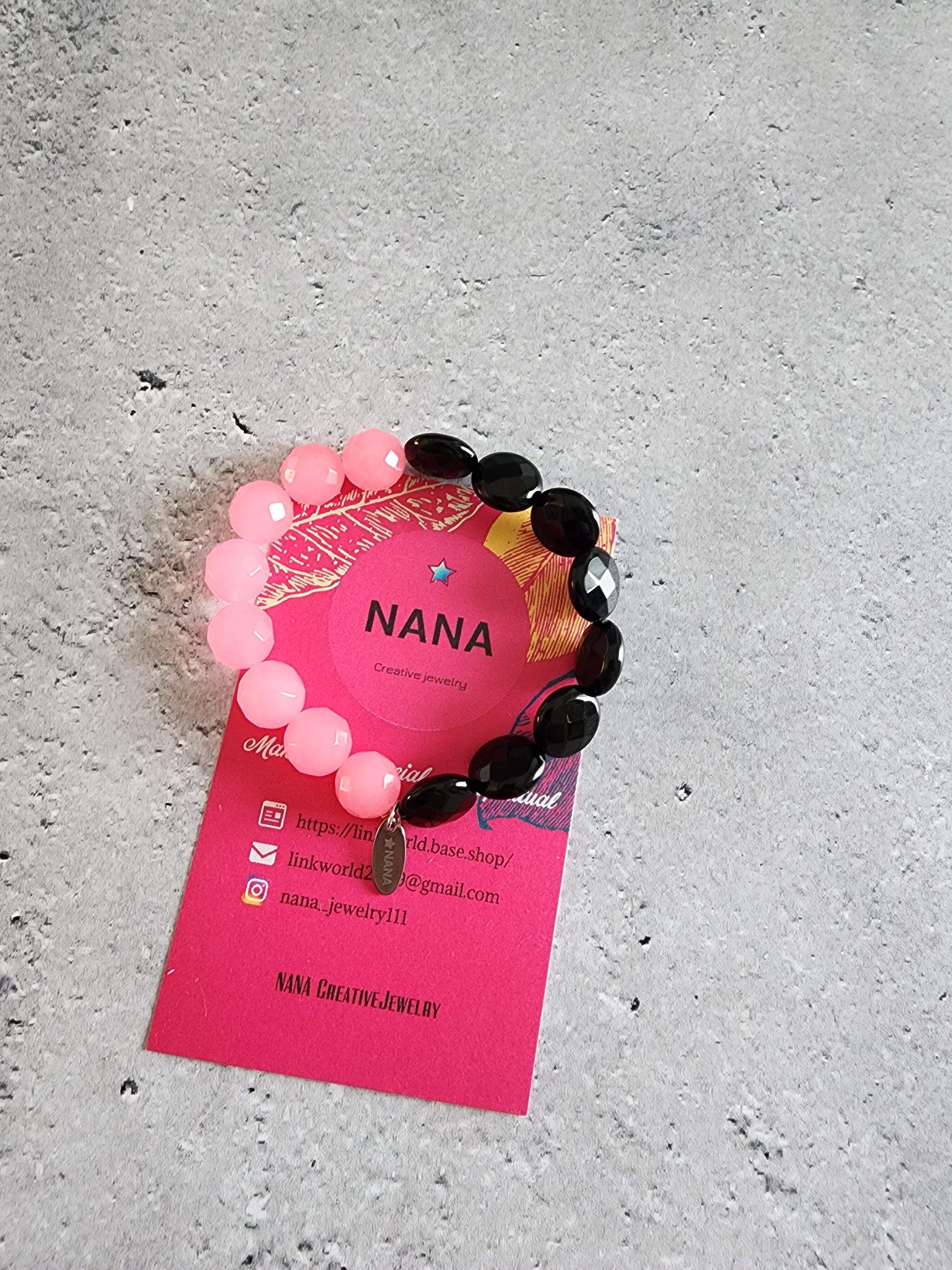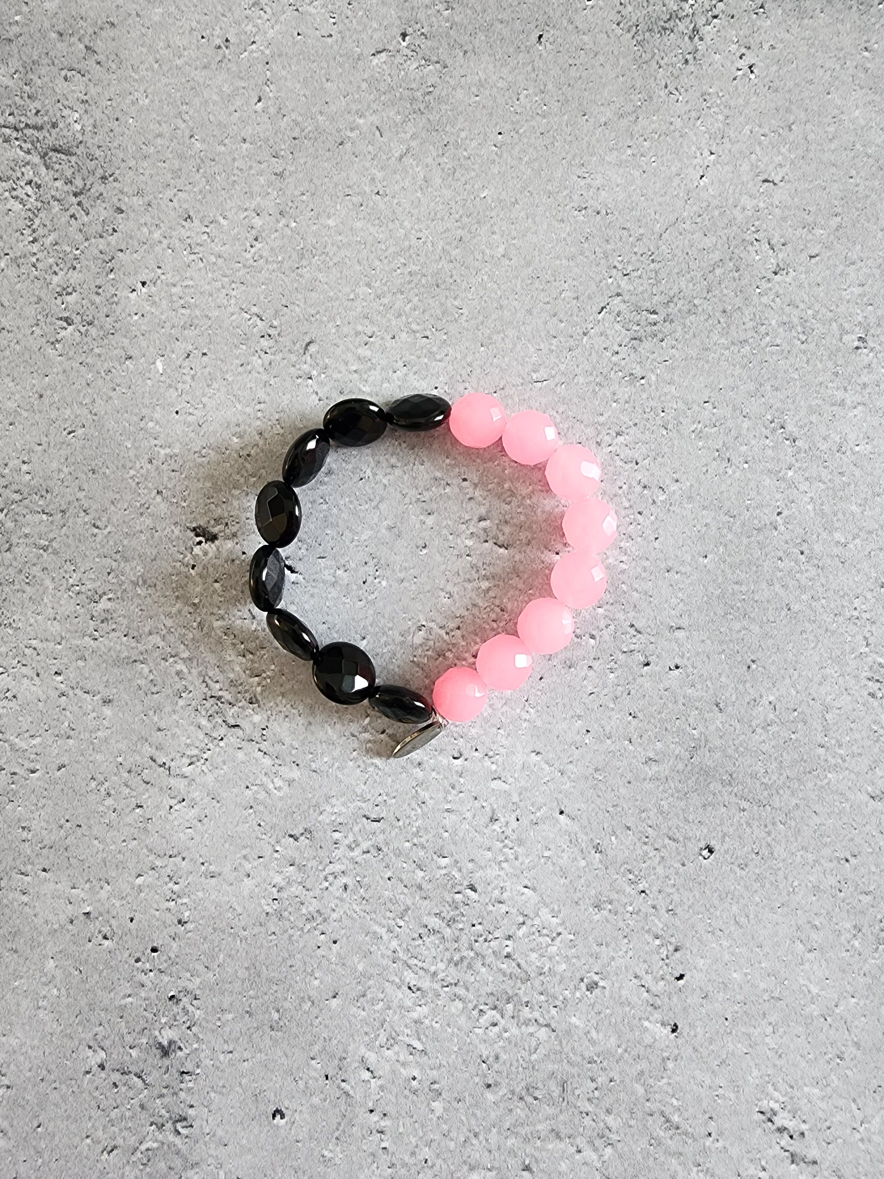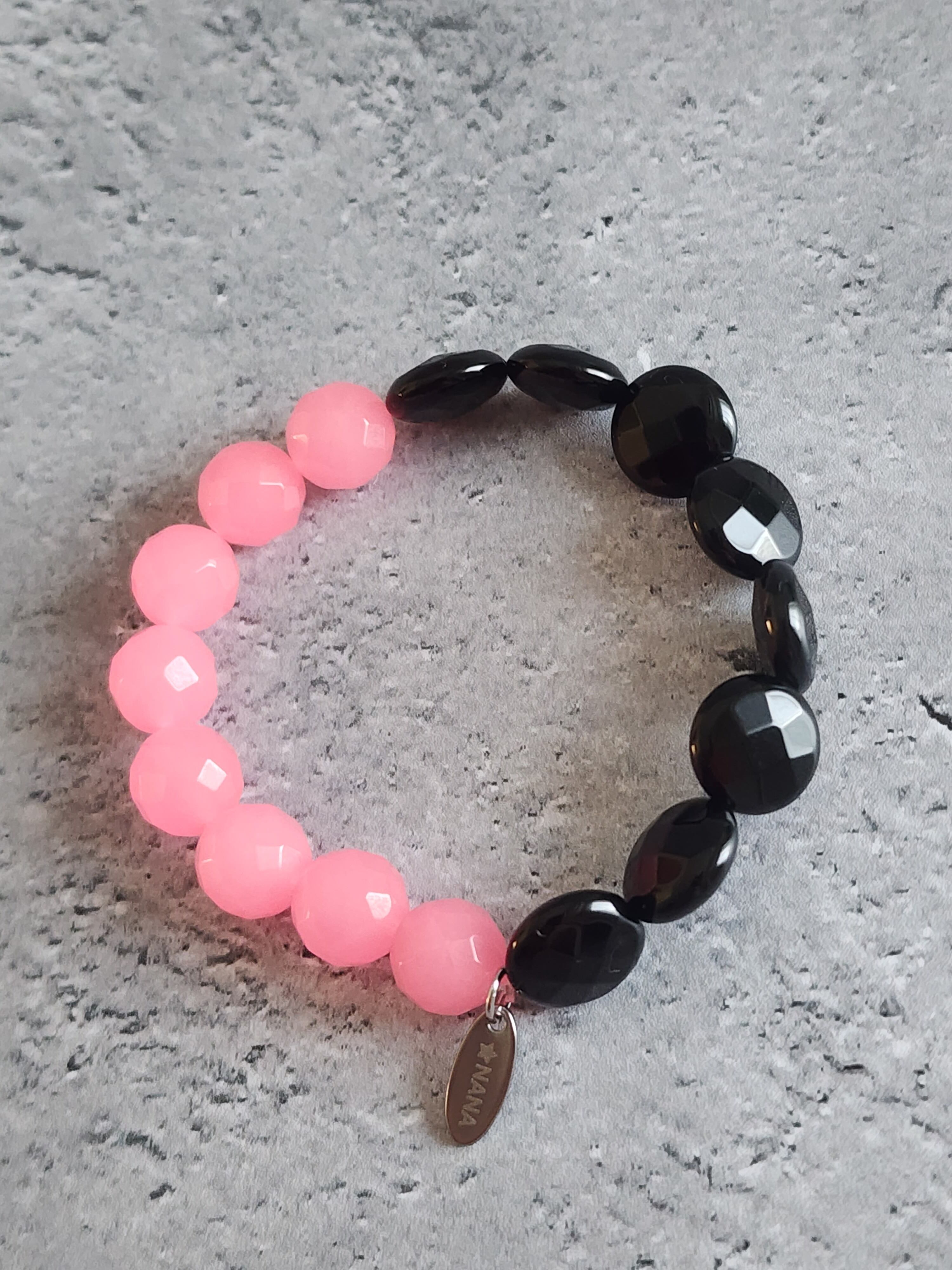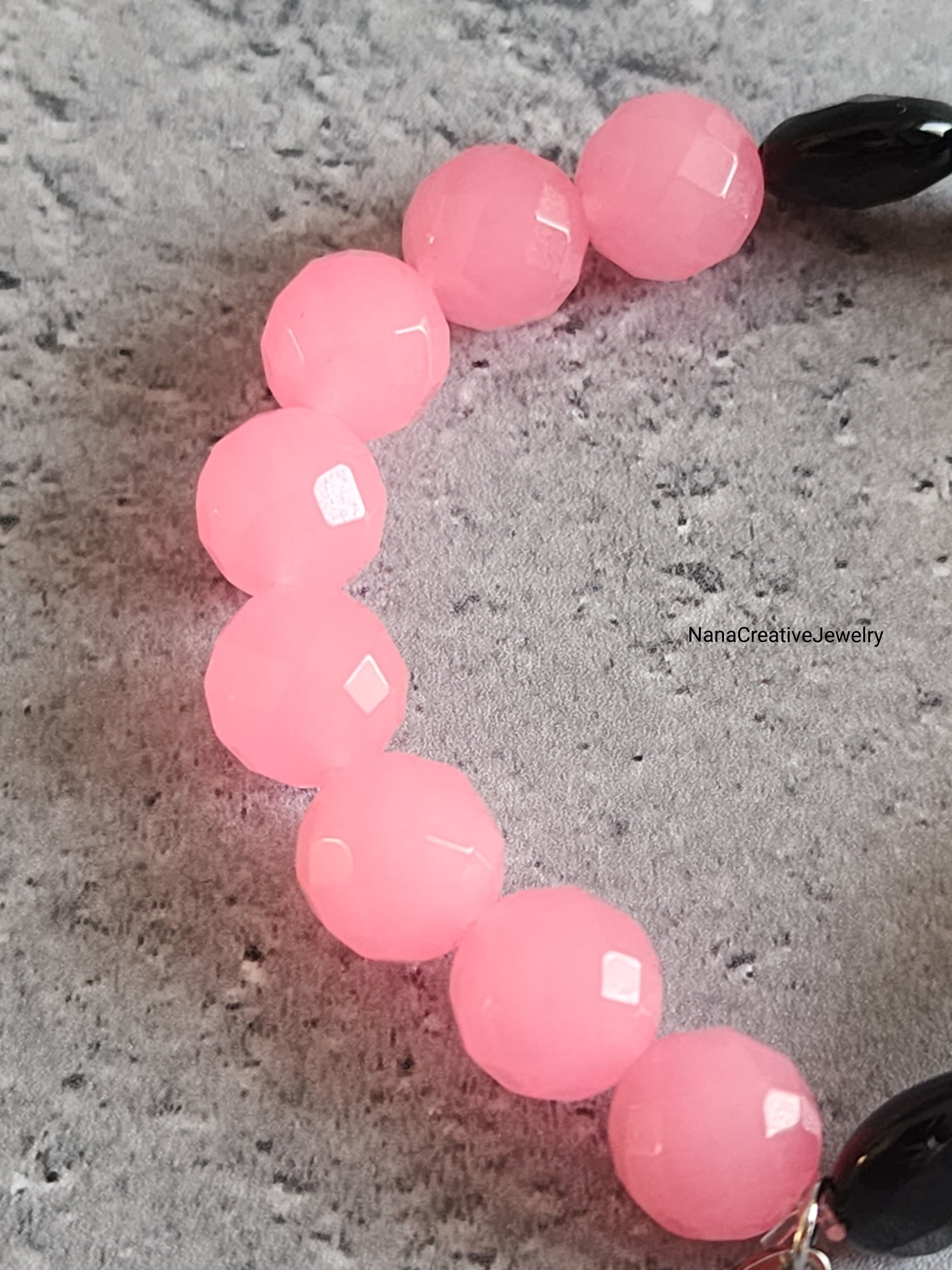 うっすらと透明感のあるピンクジェードラウンドカットと小ぶりなコイン形ブラックオニキスのシンプルでシックな組み合わせです。