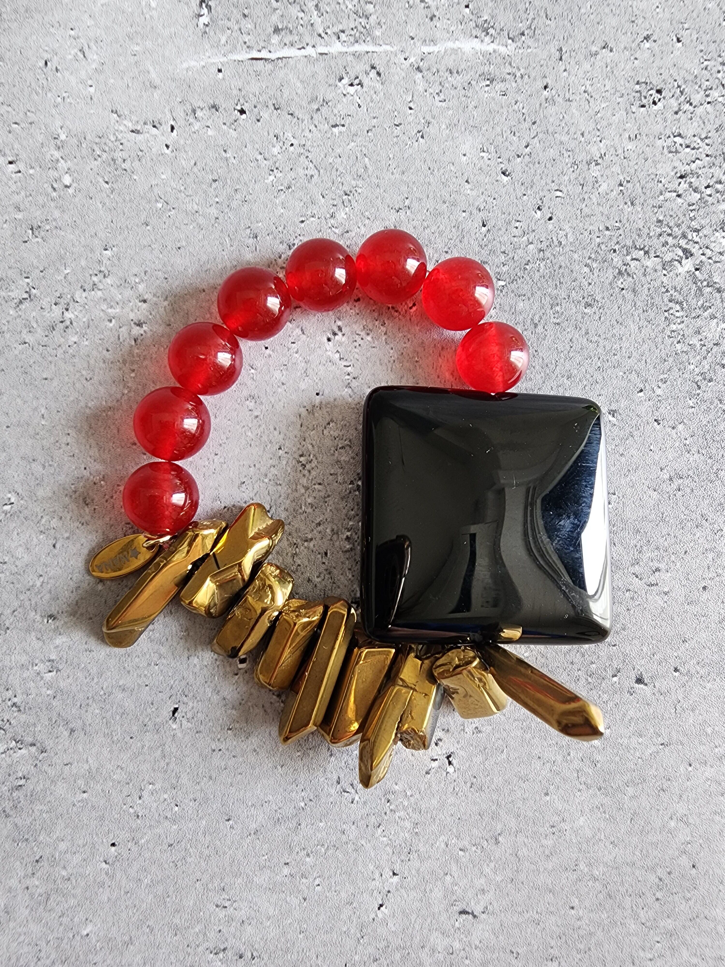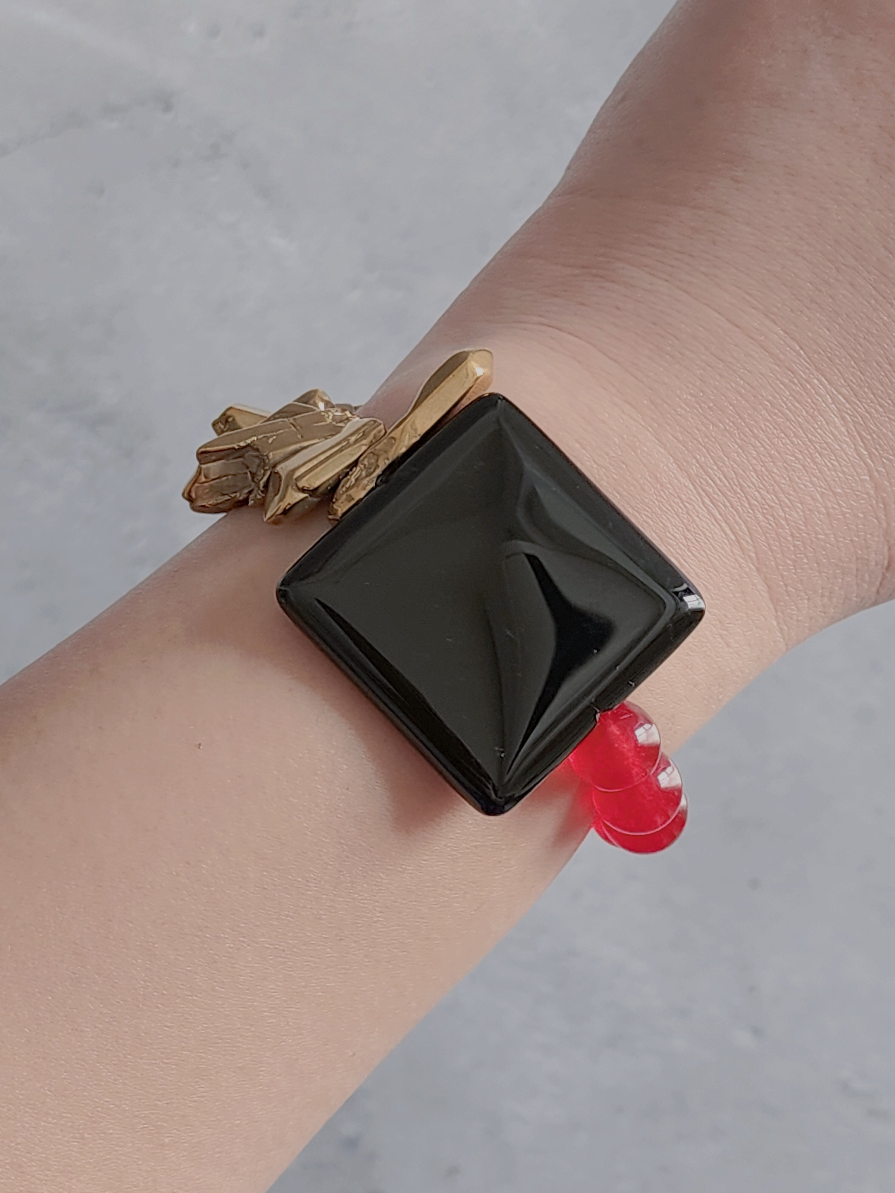 存在感抜群な大ぶりブラックオニキスのスクエアはブラックカラーなのに、輝かしい艶をご覧になれます。妖艶なレッドジェードとインパクトが強いゴールドコーティングクリスタルを合わせて、類いない魅力を激しく主張する主役級のアイテムです。