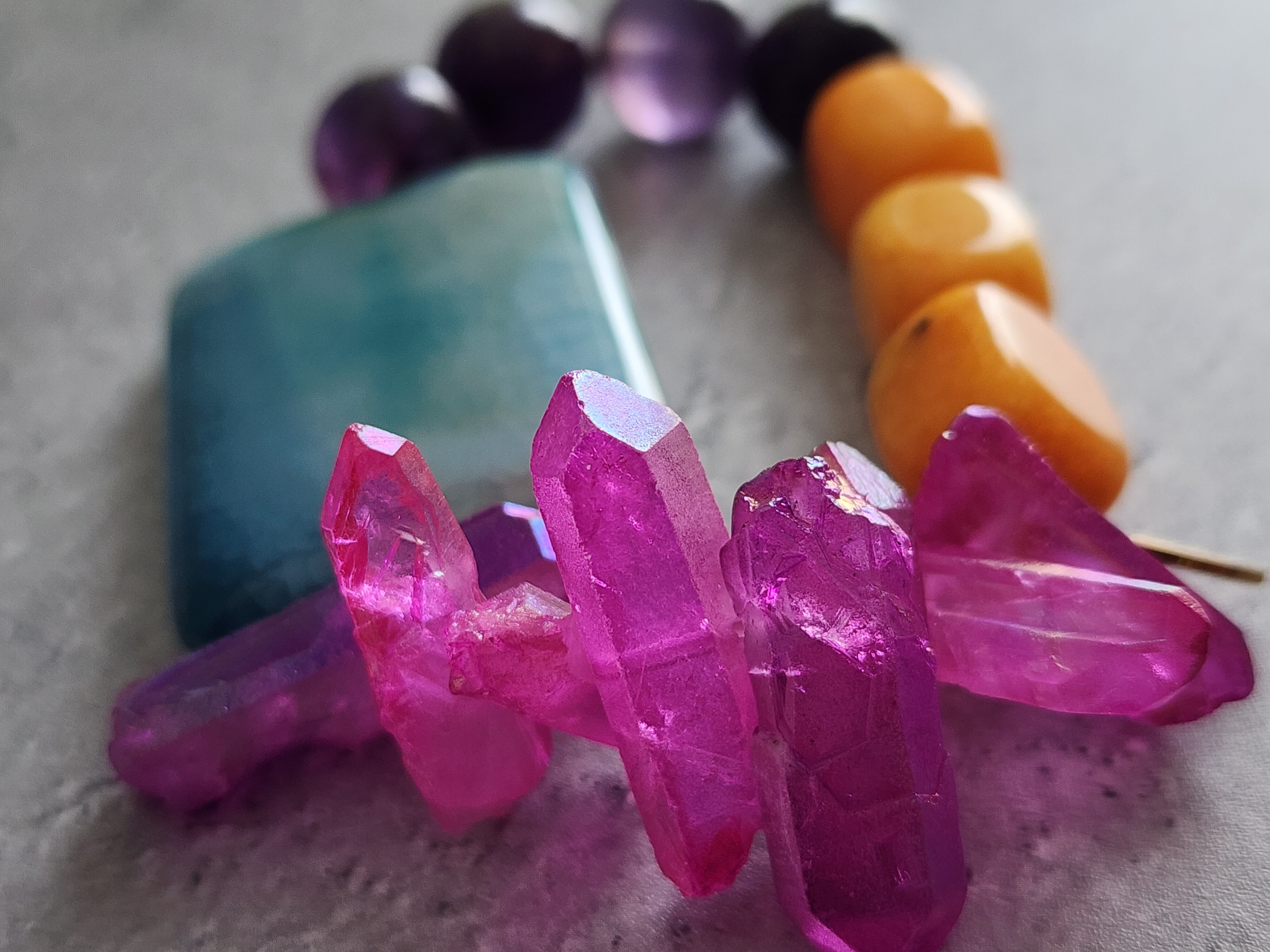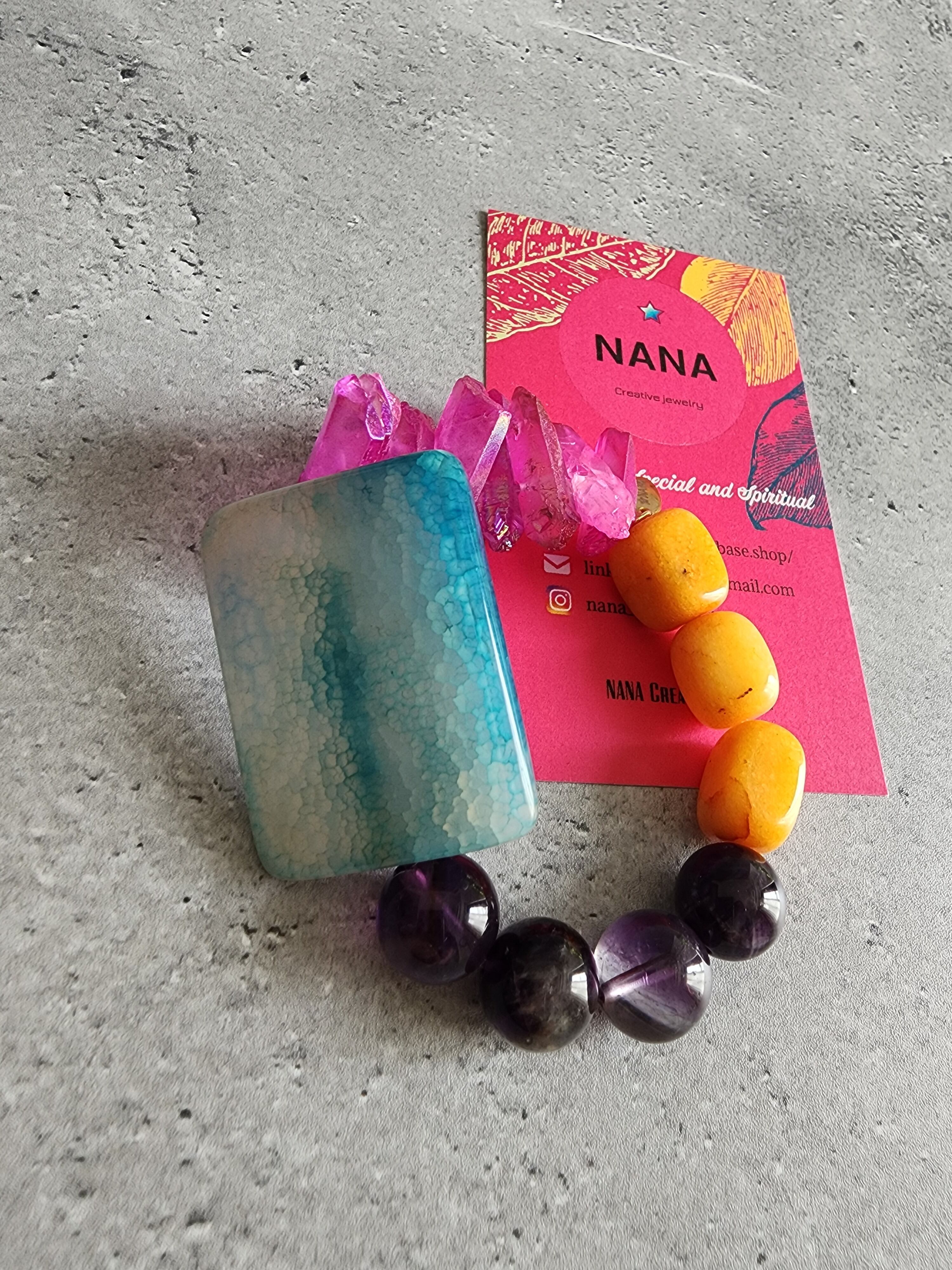 NanaCreativeJewelry 定番のブルーファイヤーアゲートが主役のオレンジカラージャスパー、奥深いパープルのアメジストとビビッドなピンククリスタルの大胆なカラーコーディネーションによる躍動感のあるアイテムです。