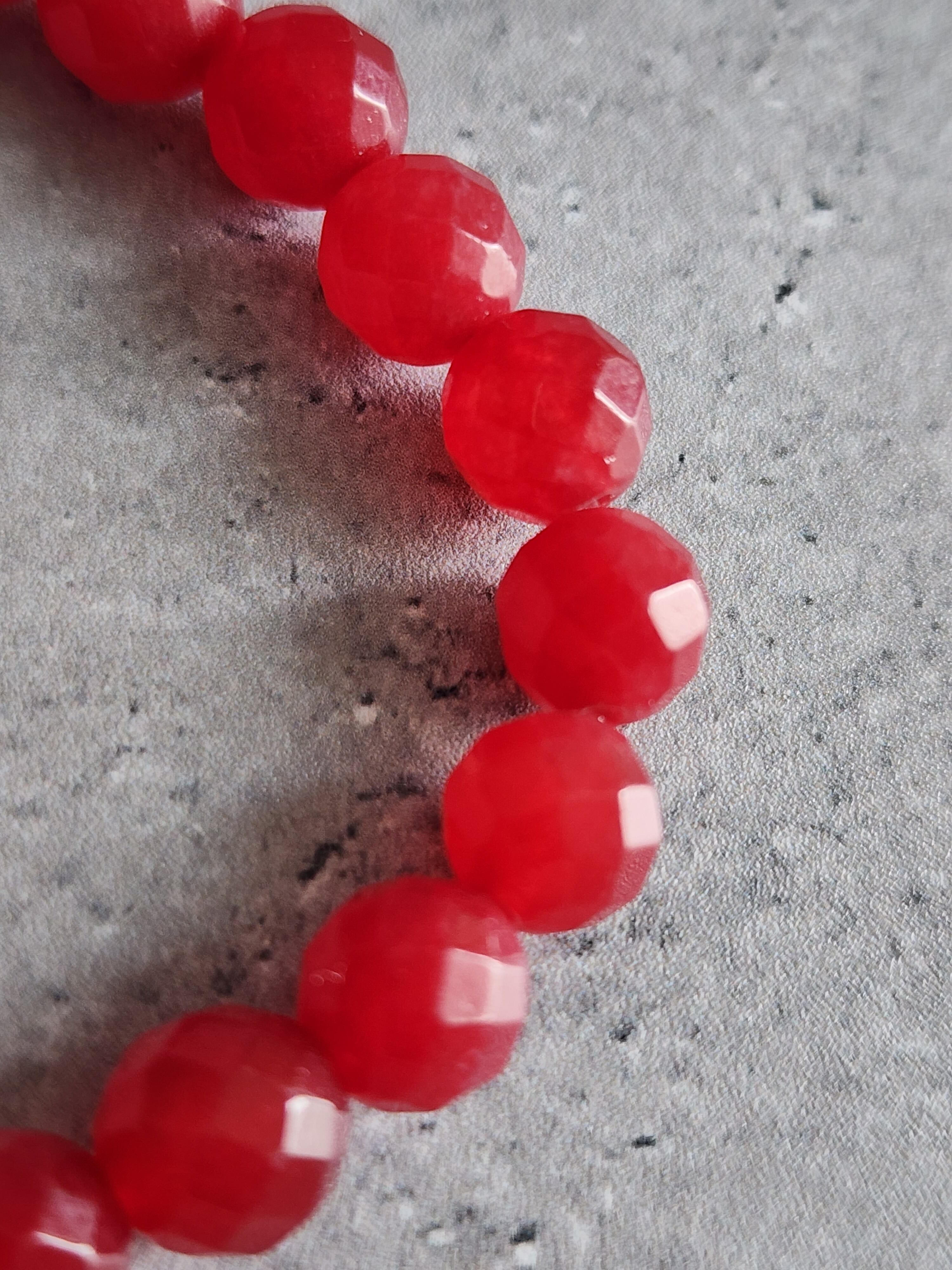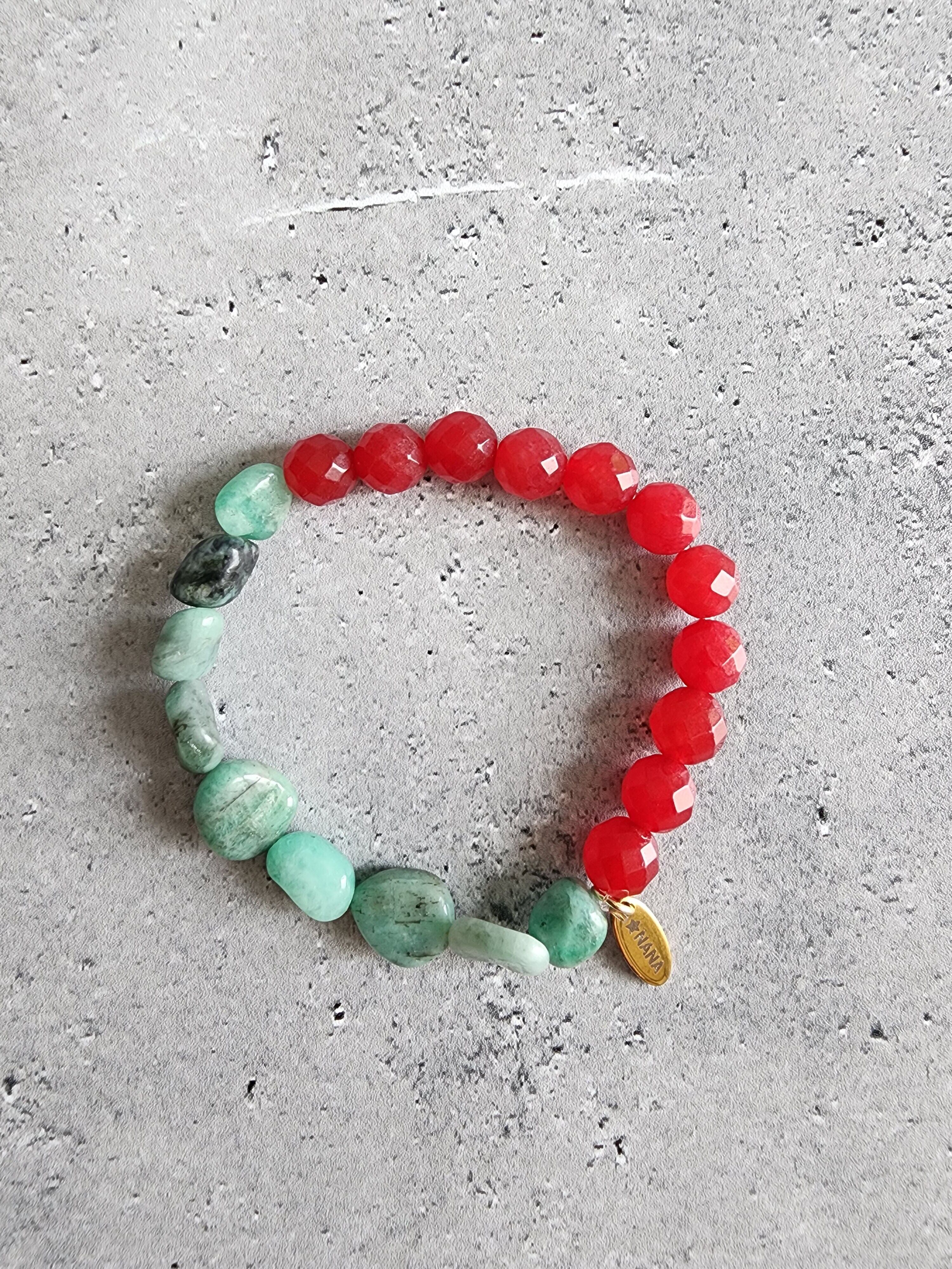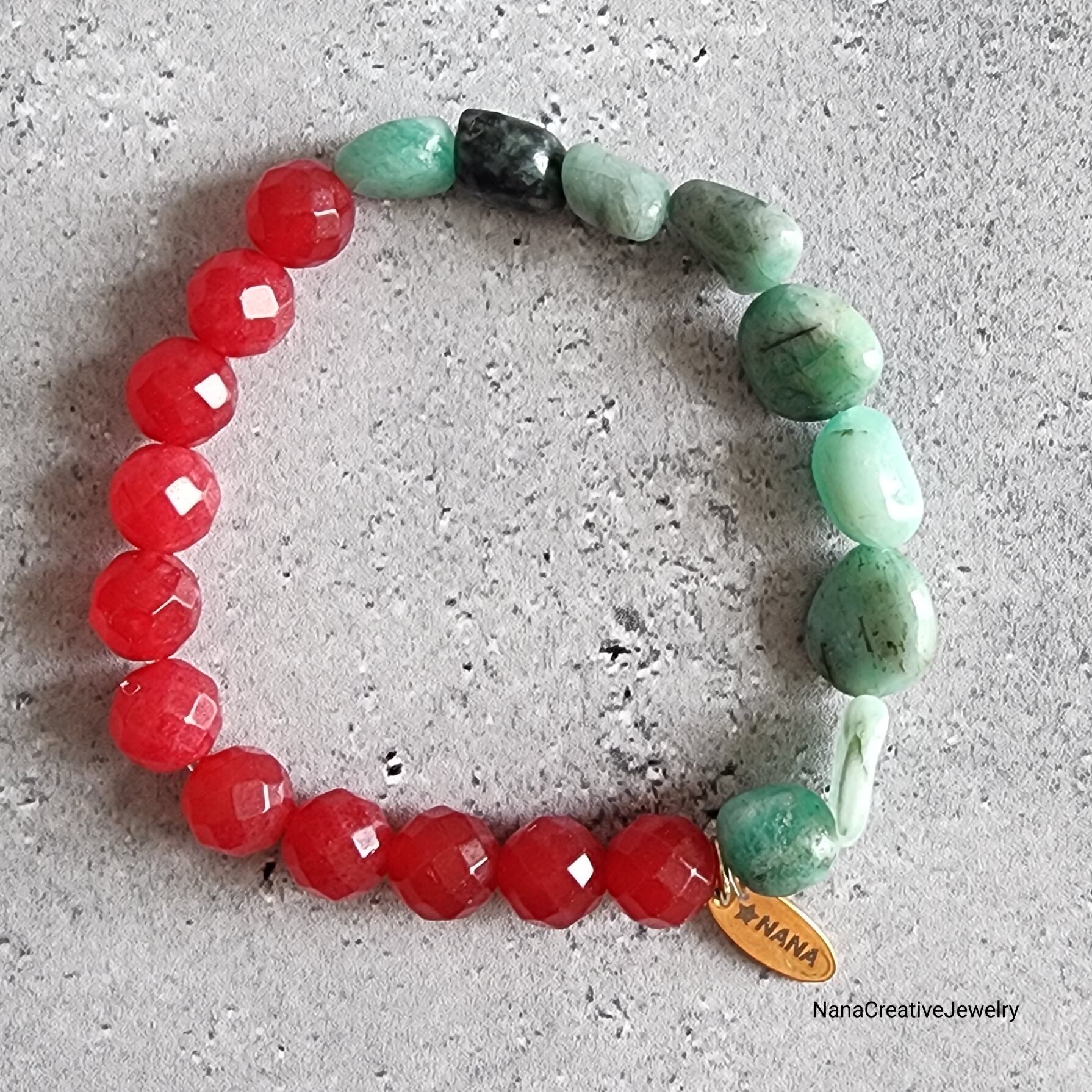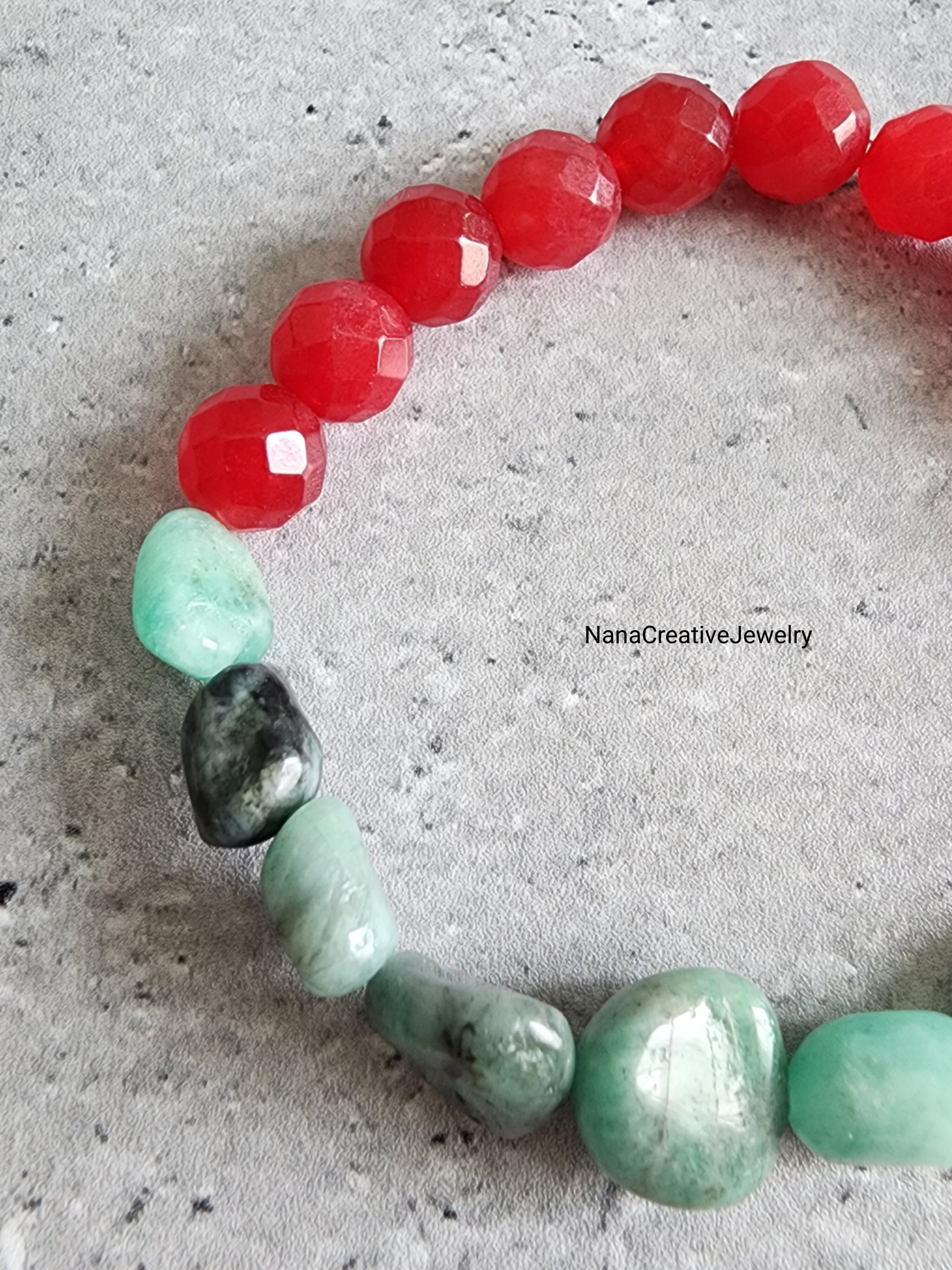 エメラルド原石と程よい輝きをきらめくレッドジェード多面カットとの鮮やかな暖色系コンビネーションです。