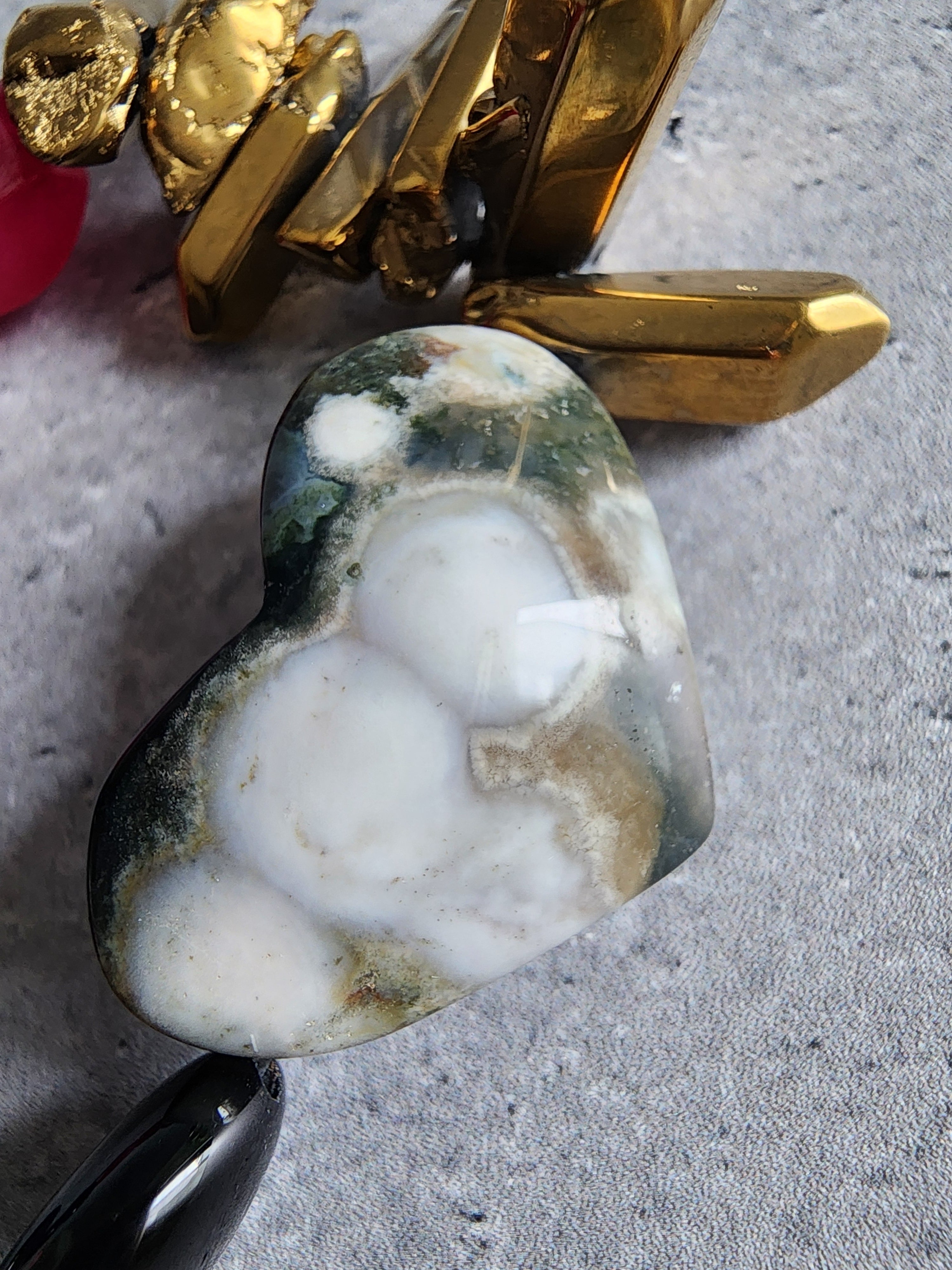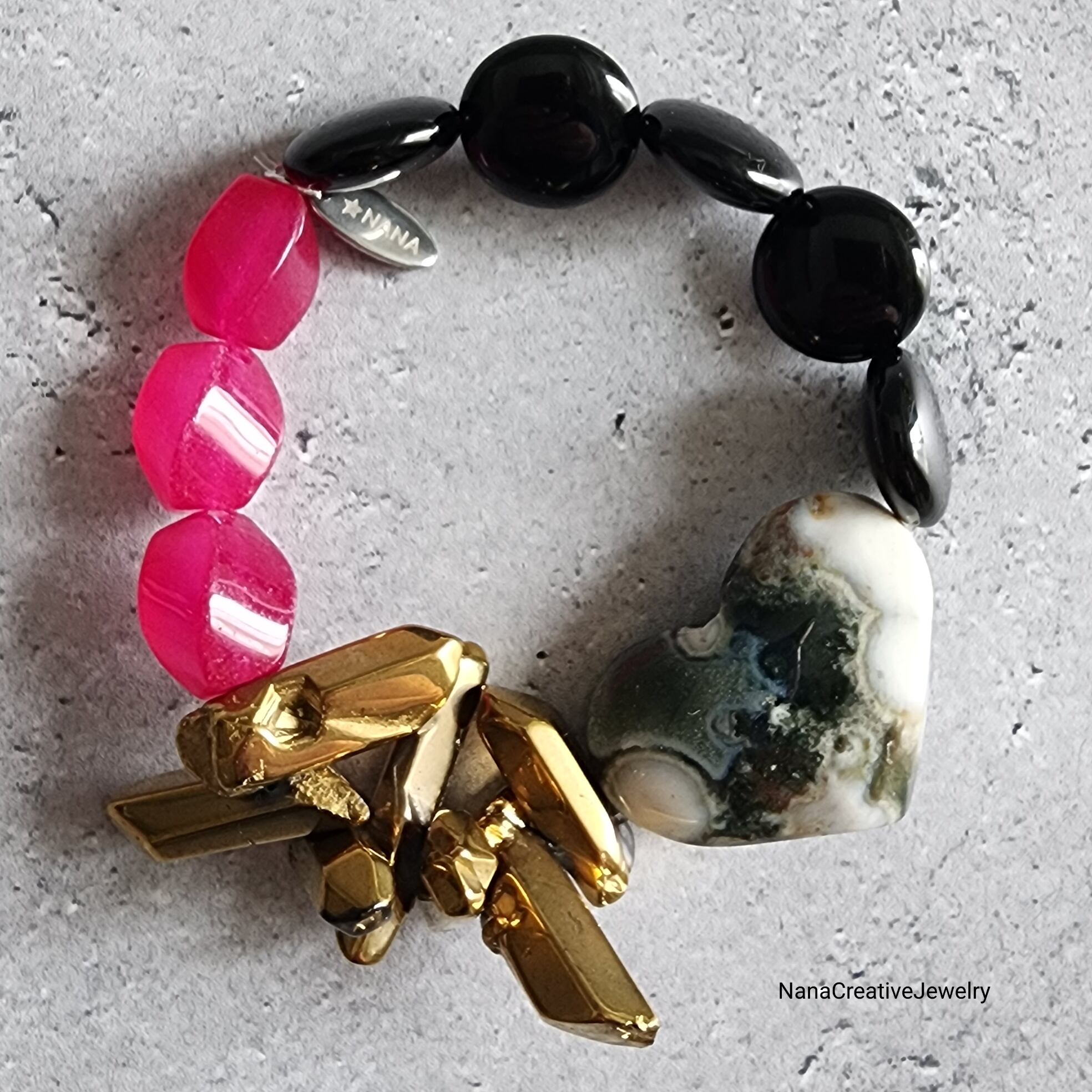 大自然の織り成す神秘の絵画のようなハート型にカットされたオーシャンジャスパー。華やかさを演出するパープルレッドのジェードとゴールドコーティングのクリスタルを合わせてオーシャンジャスパーのダイナミックの模様と化学反応でエキゾチックな感じに、垢抜け感をもたらすブラックオニキスコインで全体の雰囲気をよりシックに調う。