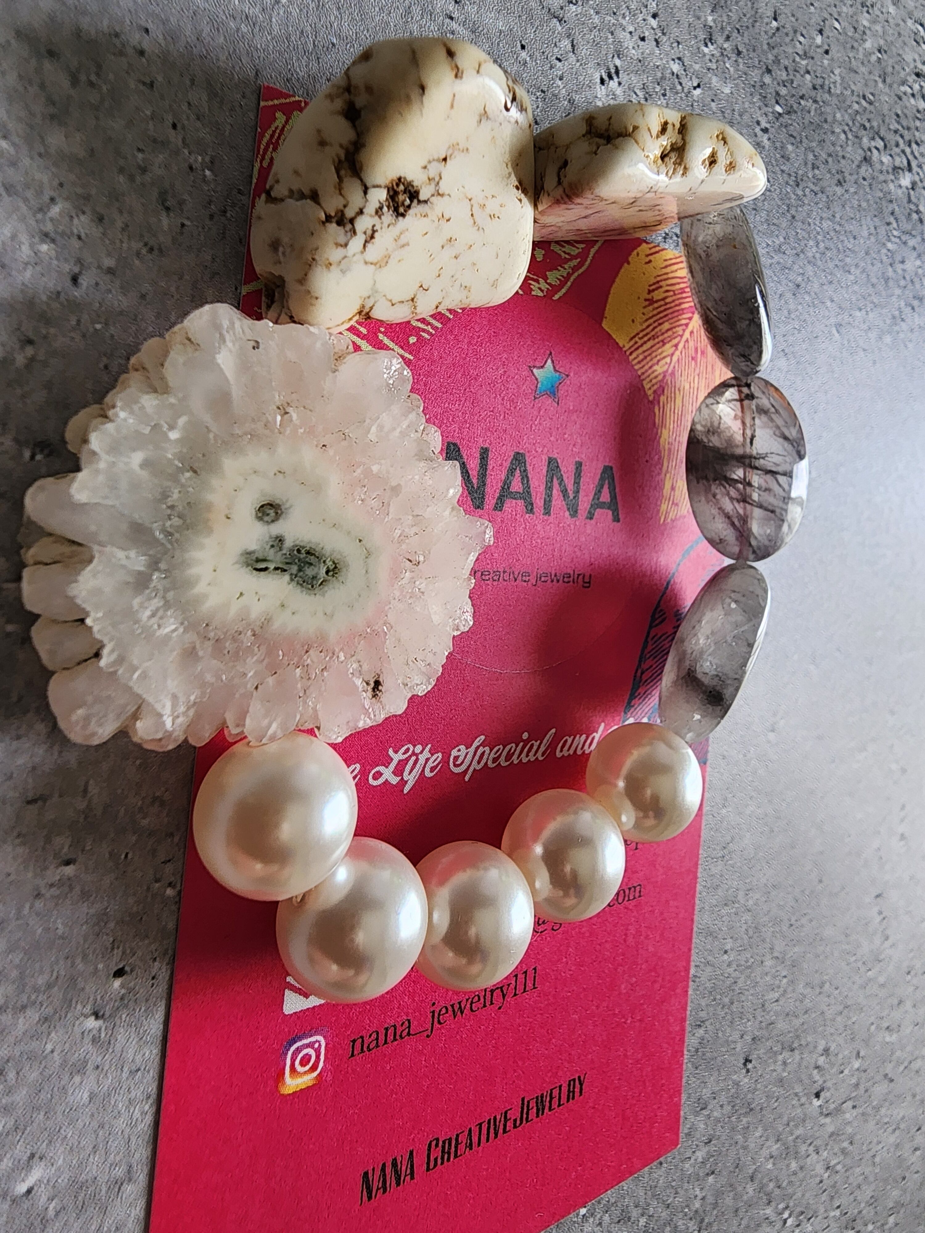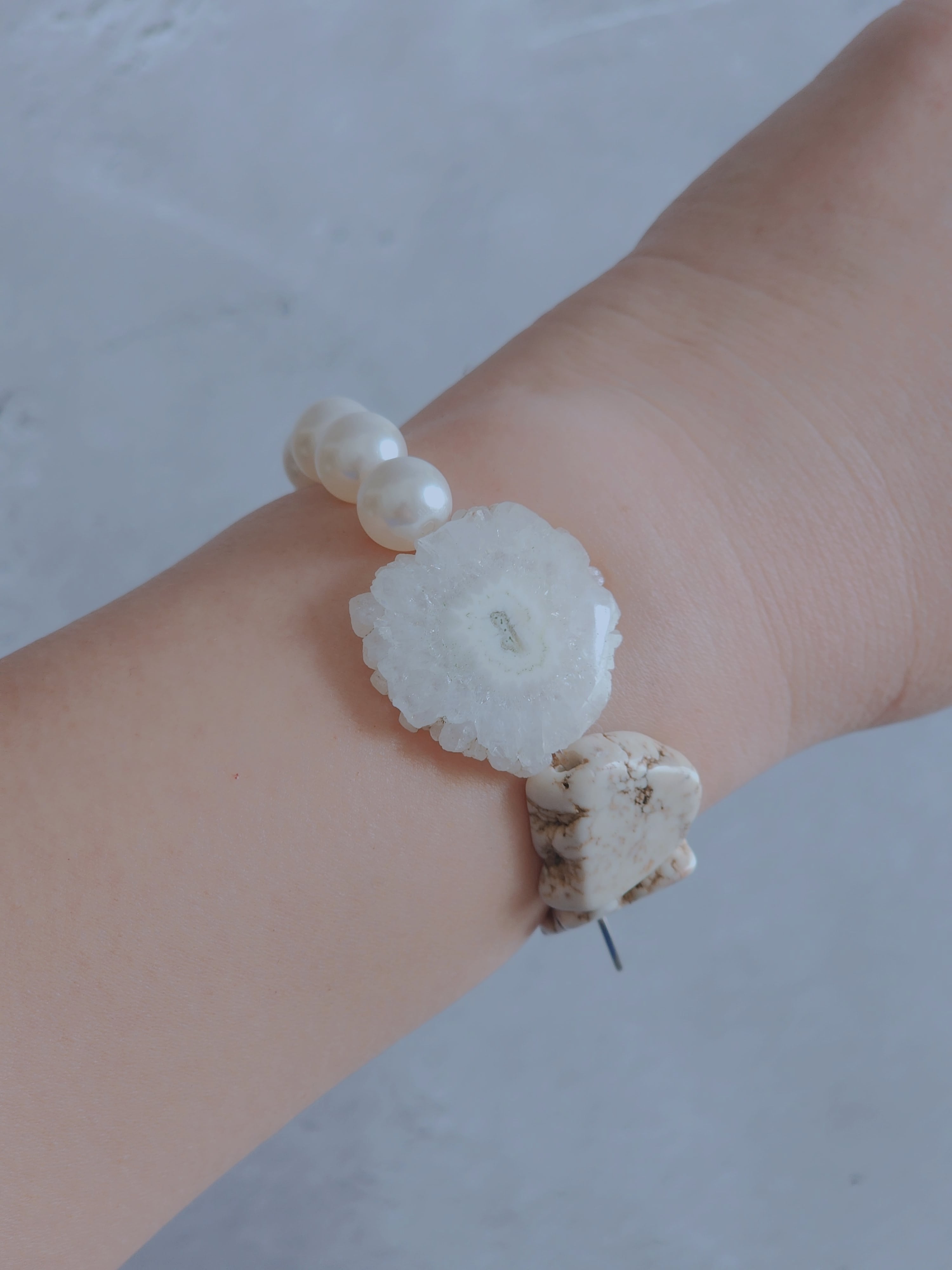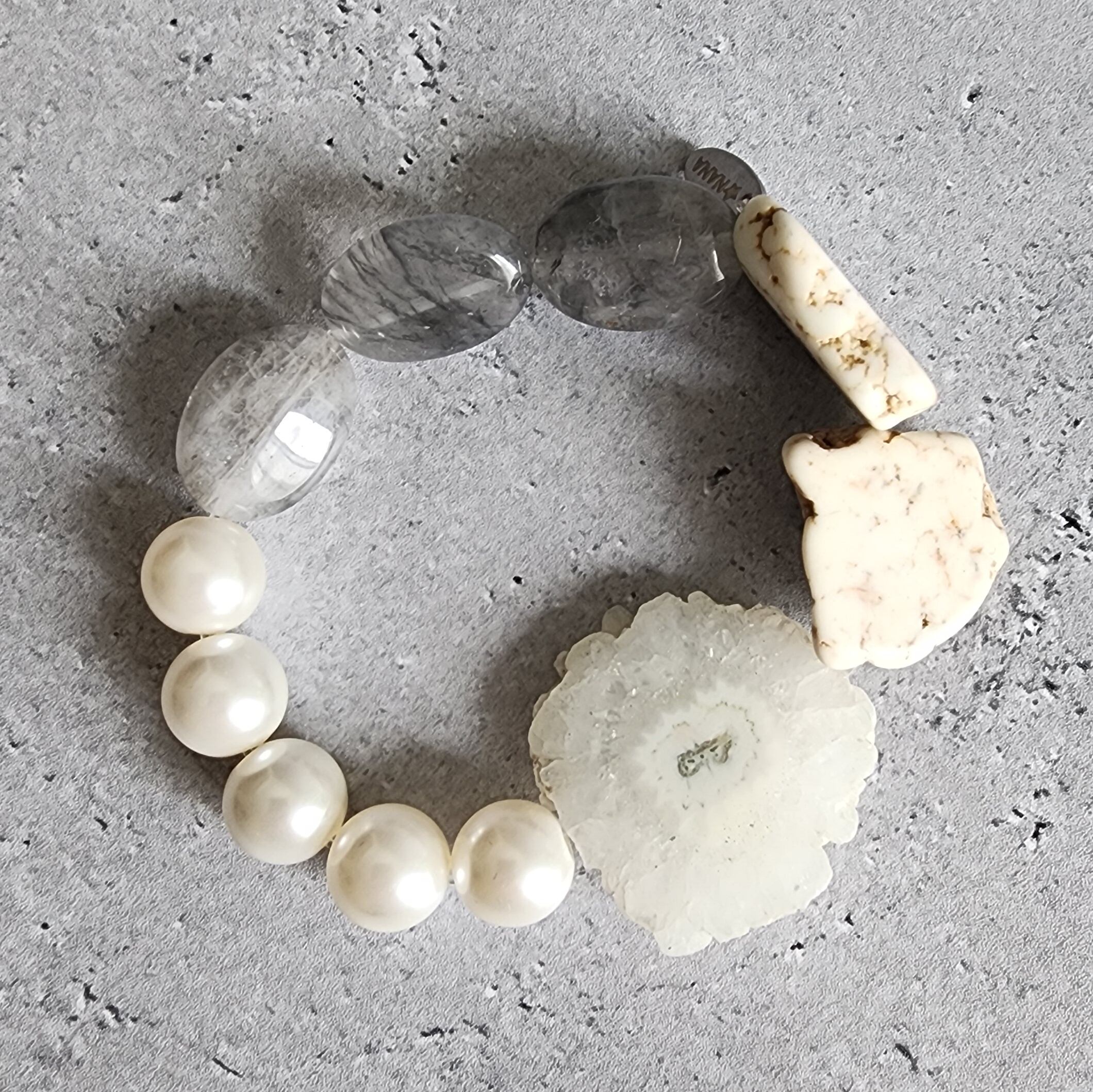 神秘的な見た目と力を持つソーラークォーツを中心に、クラウディクォーツのオーバル、マグネサイトのナゲットと美しい艶を放つ貝パールで組み合わせたシックで女性らしいワントーンブレスレットです。