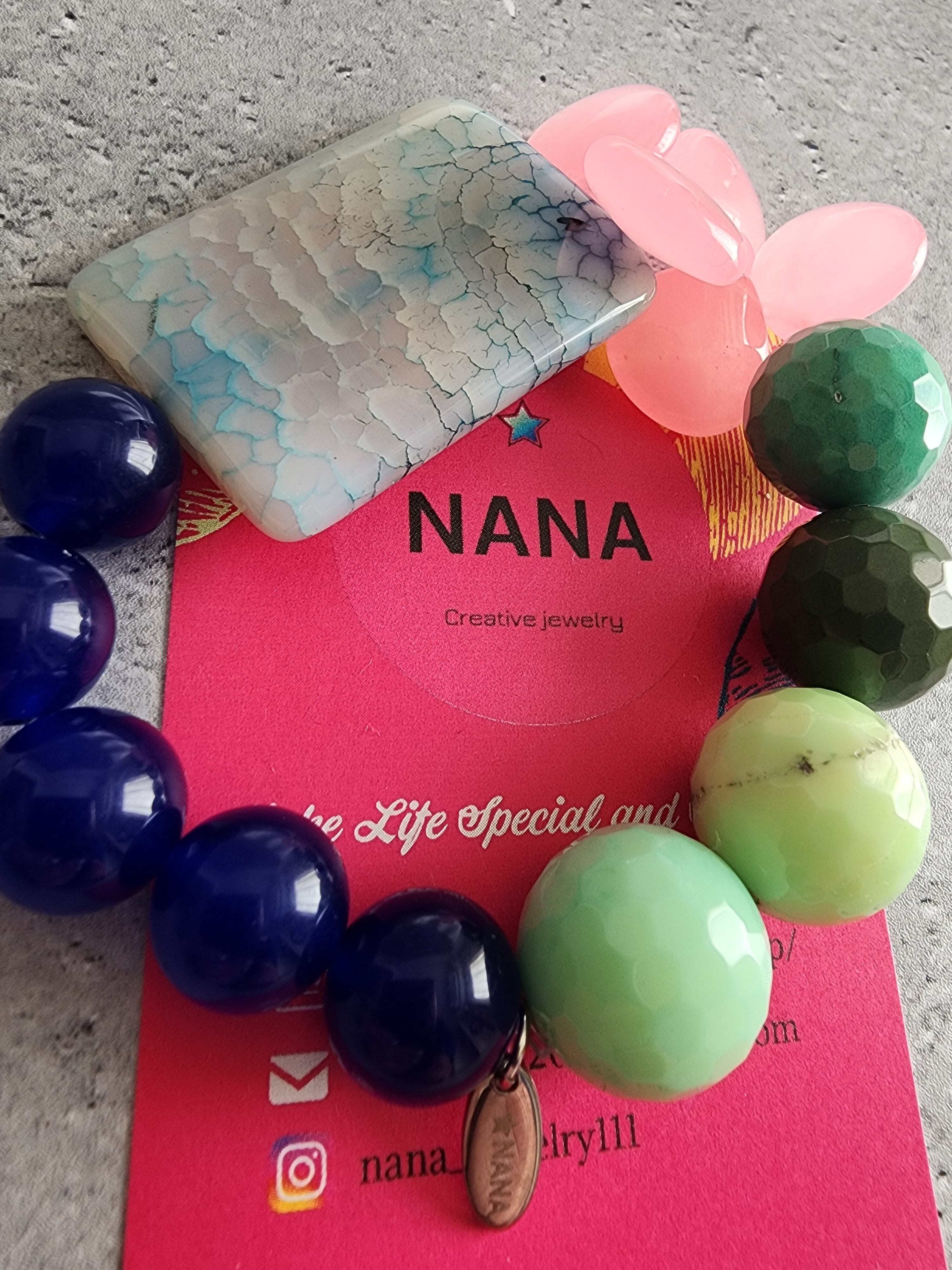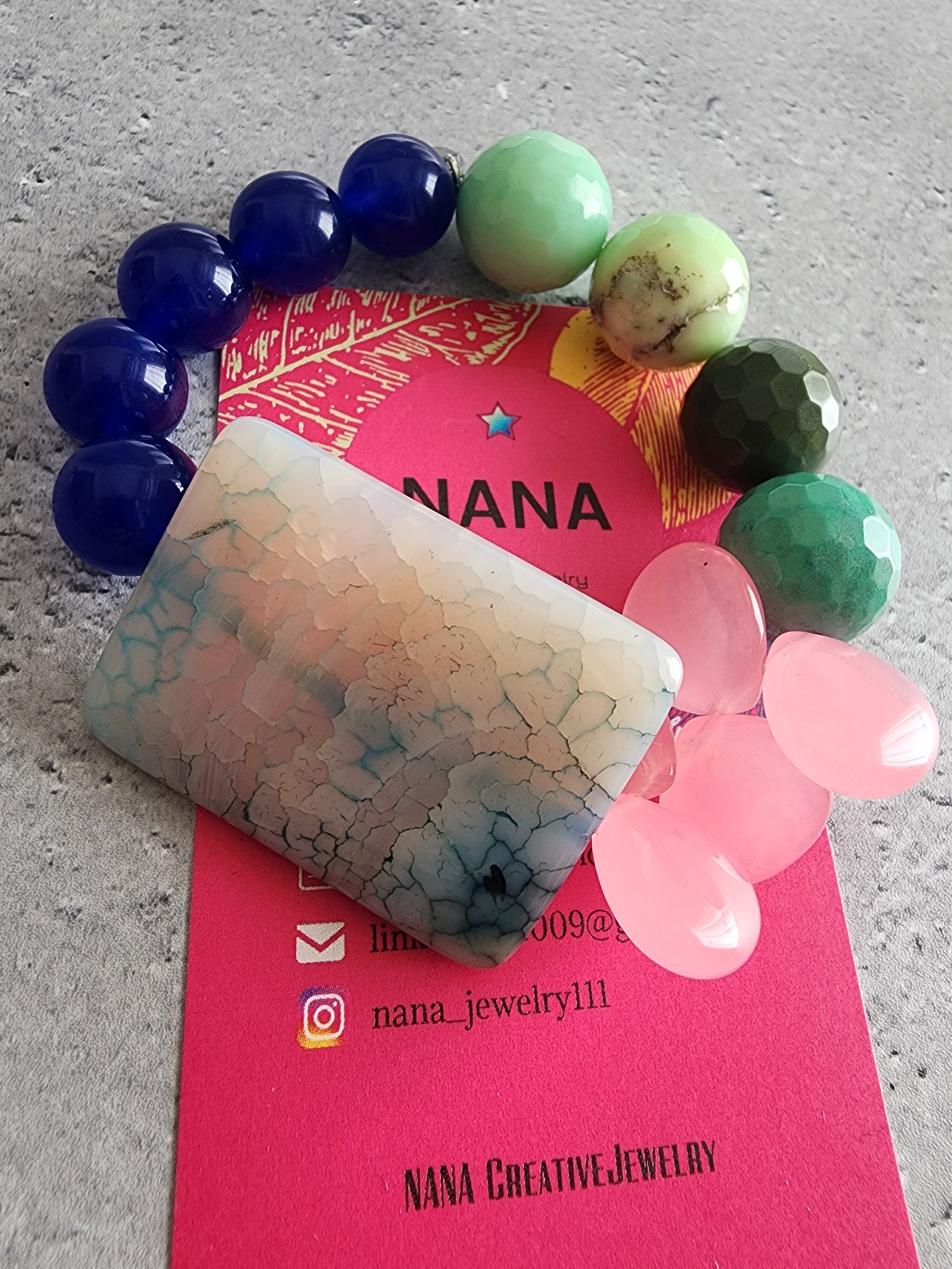 当店人気なブルーファイヤーアゲートが主役の早春らしい、ロイヤルブルー、ベビーピンク、グリーンを大胆に合わせた彩りなブレスレットです。