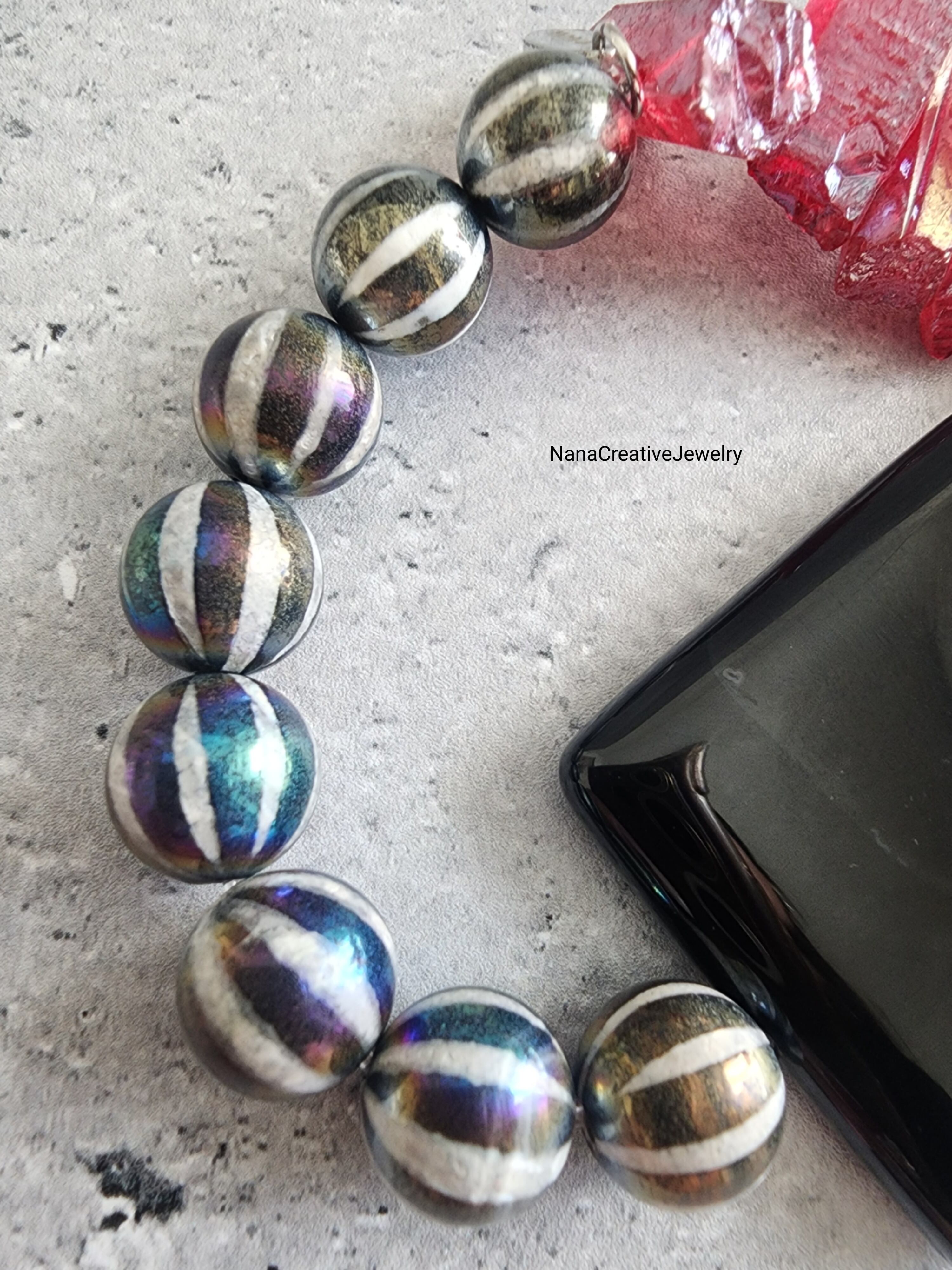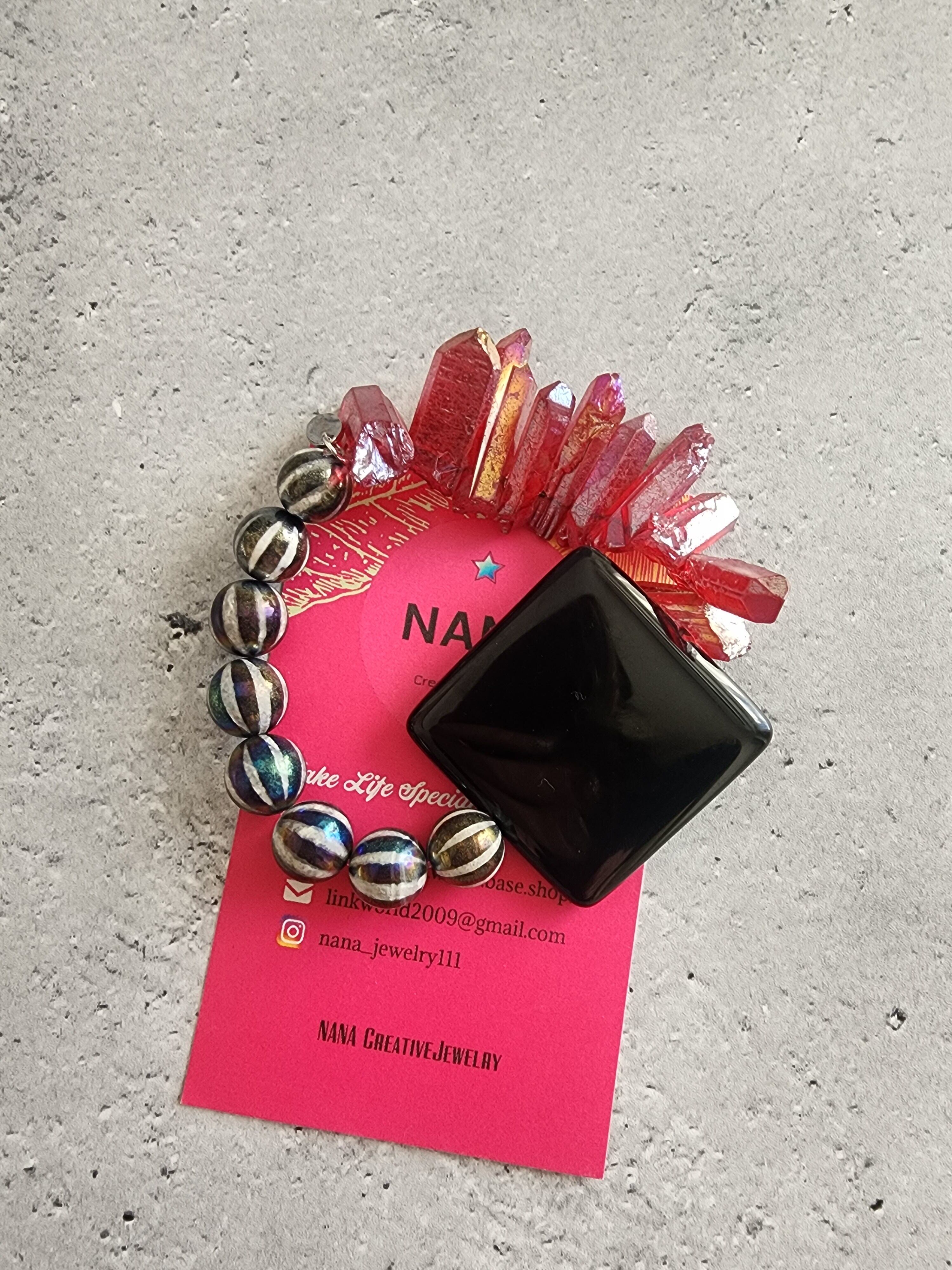 漆黑なブラックオニキスが放つシックな艶とくすみレッドのクリスタル氷柱の組み合わせにメタリックカラーのコーティングとライン状の模様を施した遊び心いっぱいのアゲートを合わせて。