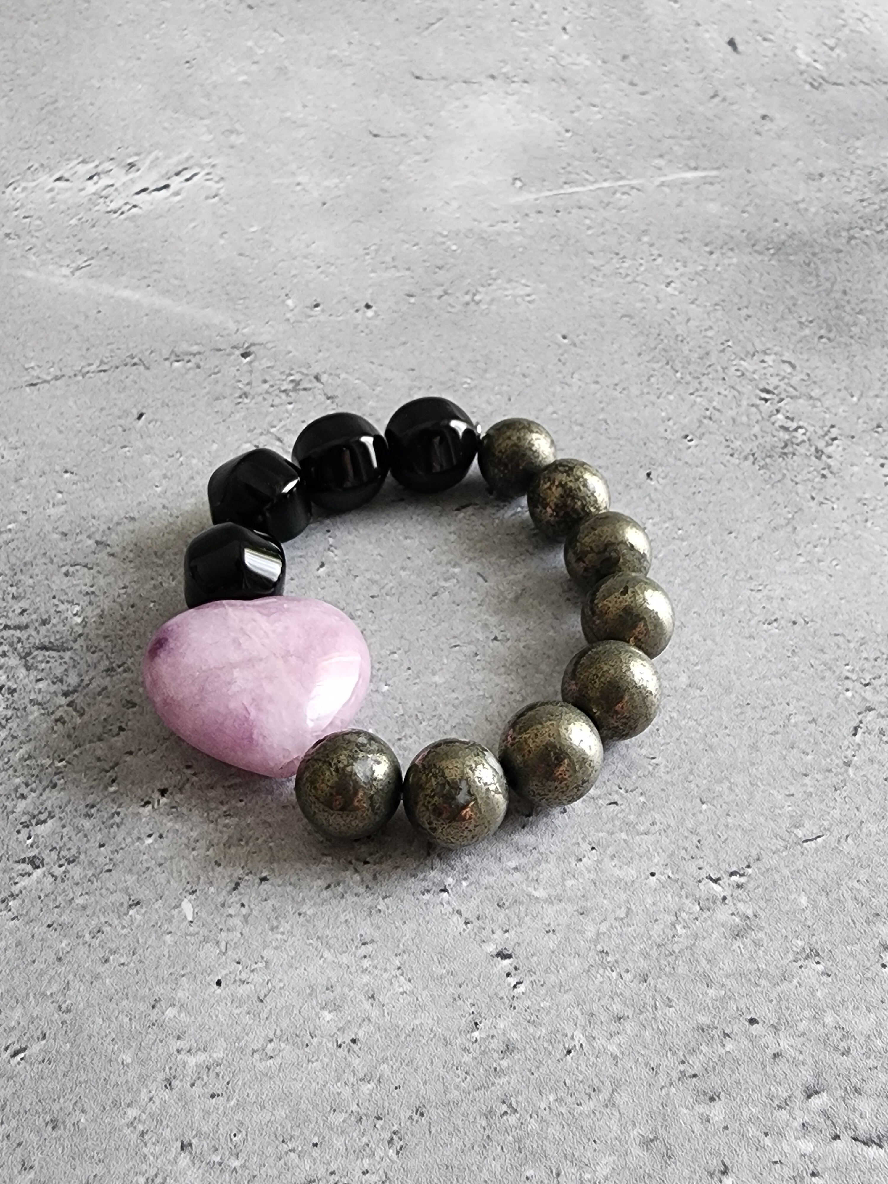 大きいサイズのレピドライトハートを主役に、真っ直ぐなブラックの艶を放つブラックオニキスとマットなゴールド光沢のパイライトを合わせたエレガントな雰囲気のブレスレットです。