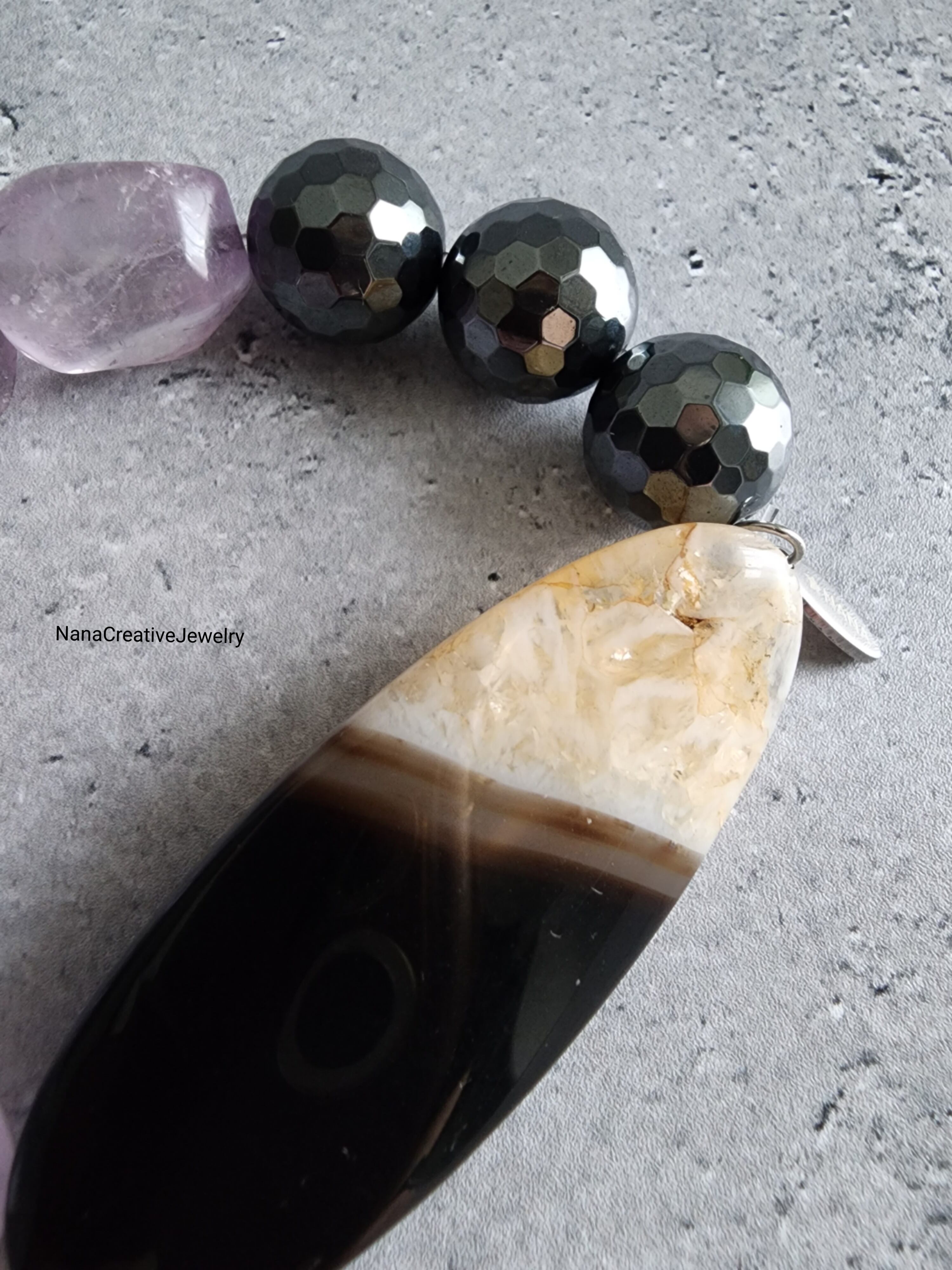 淡いパープルのアメジストタンブルカットと強い輝きを放つヘマティーン多面カットの組み合わせ。