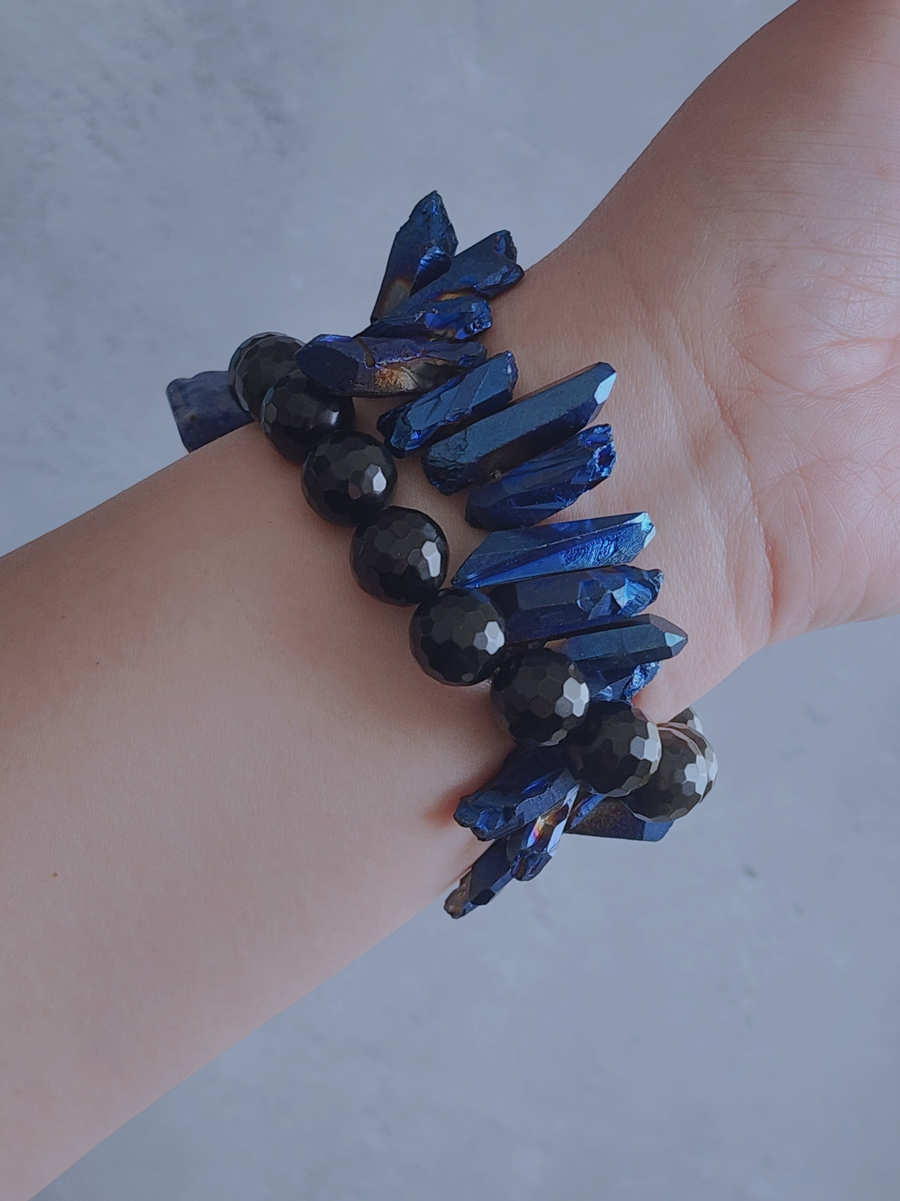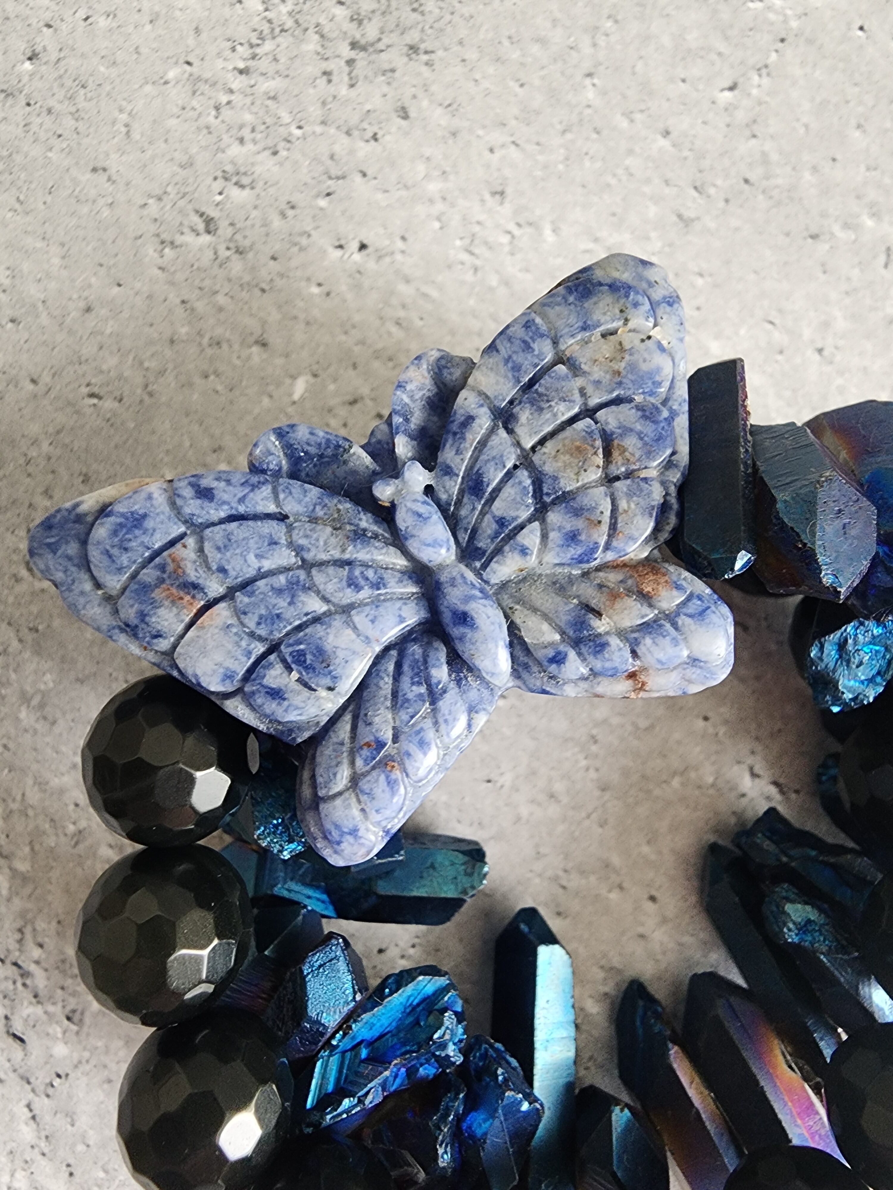 強力な護符として知られるソーダライトの蝶は魔除けとして機能するだけではなく、心身のバランスを保つ中で美、変身、進化ももたらしてくれます。落ち着いた雰囲気のレインボーオブシディアンと華やかなブルーコーティングクリスタルを合わせて、存在感と野生が溢れるアイテムに。