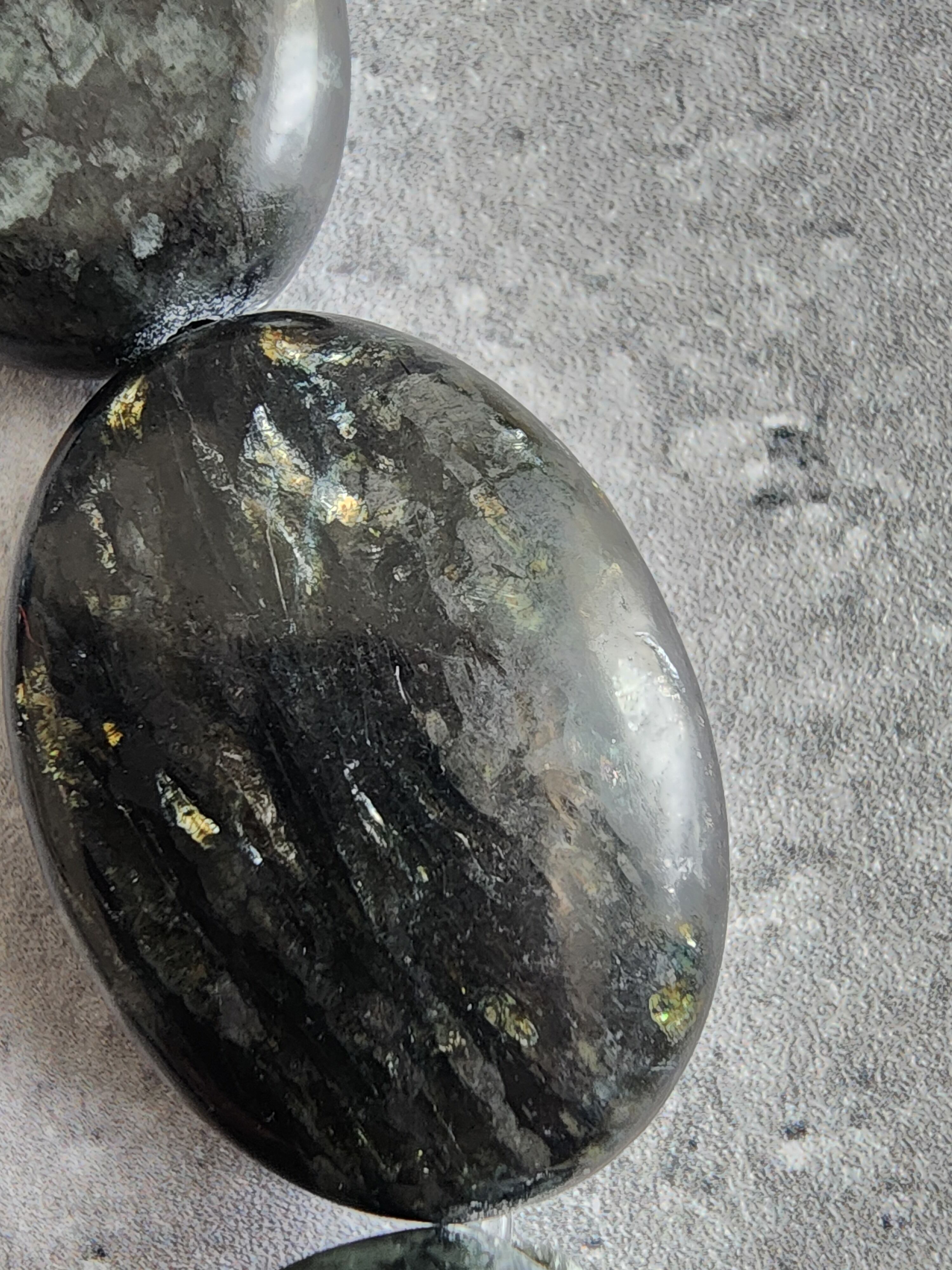 ヌーマイトはブラックカラーをベースに、クォーツによる透明な部分や他の鉱物によるブラウン、グレー部分を含み、 線状のピーターサイトのような輝き、金色の内包物、色合い豊富な味わいと神秘的な美しさを持つ石です。 鑑別士によると、こちらのヌーマイトは複数の鉱物の混合石とのことです。 主要な3つの鉱物は「アンソフィライト」 「クォーツ」 「スタウロライト」 であり、とても稀です。 その他、「ガーネット」の要素も含まれているとのことです。