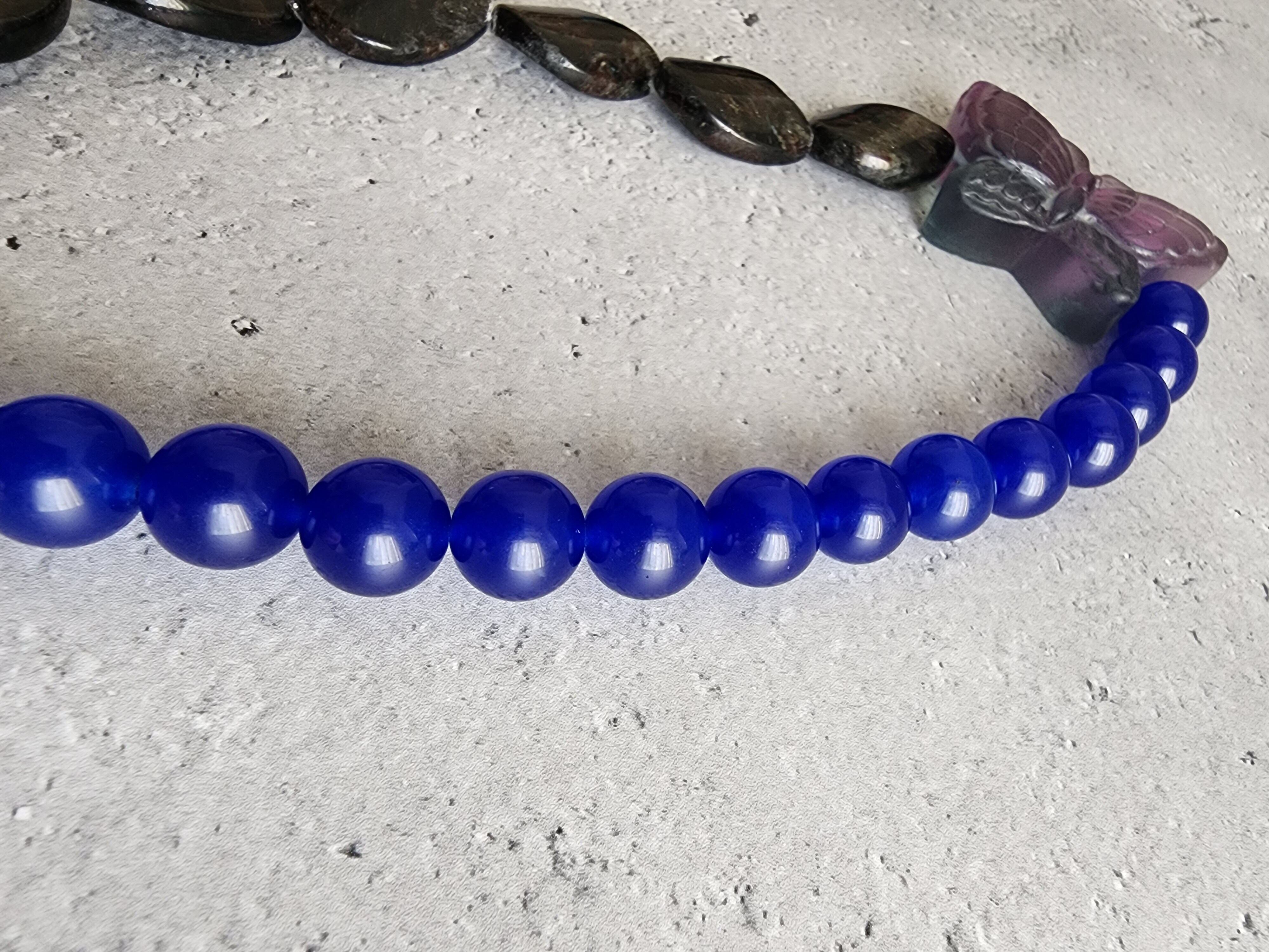 クールなガラス光沢が見られる大きいサイズのヌーマイトドロップと美しいロイヤルブルーの光沢を放つジェードを合わせて、絶大な存在感と迫力を表すユニークな唯一無二なアイテムに。
