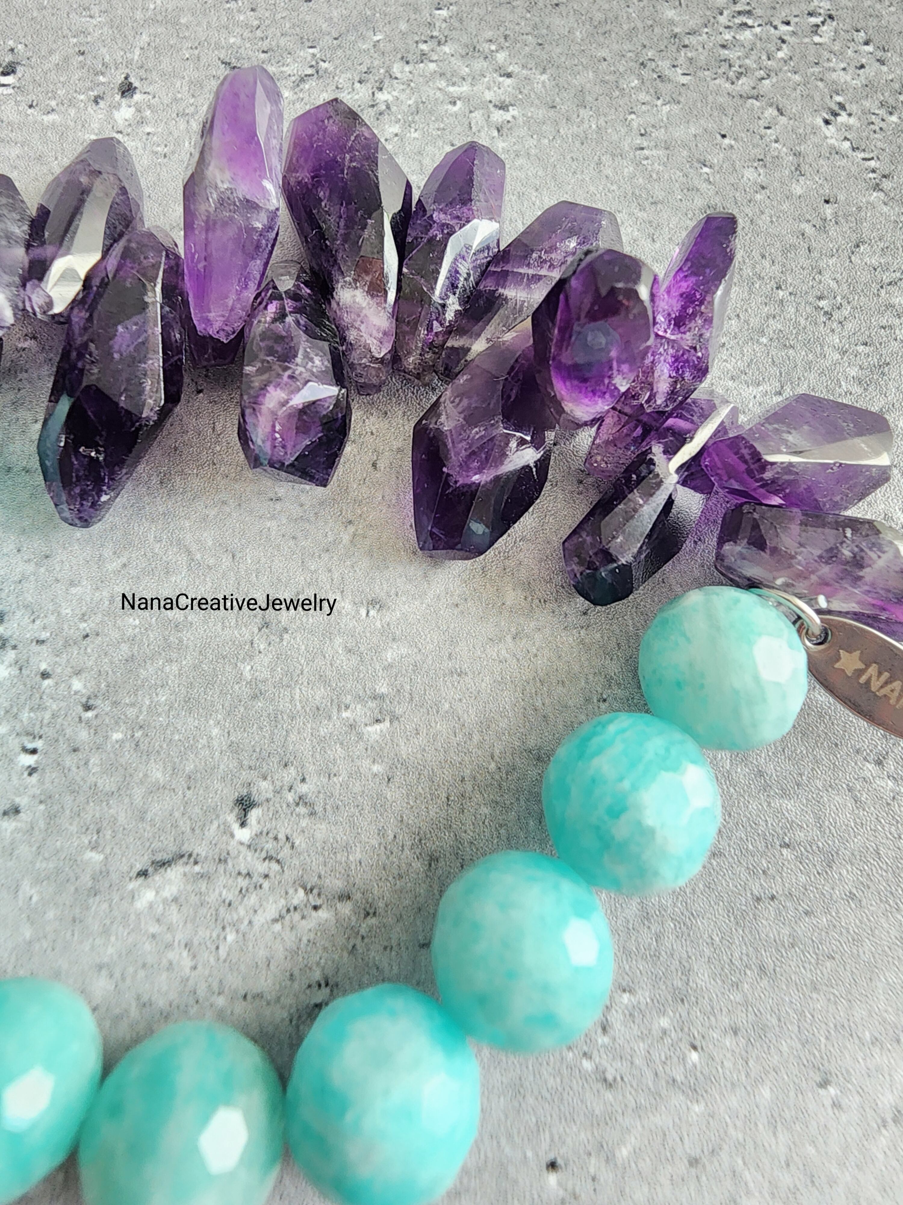 キラキラと輝くペルー産アマゾナイトと高品質なザンビア産アメジストタンブルカットのコンビネーションです。
