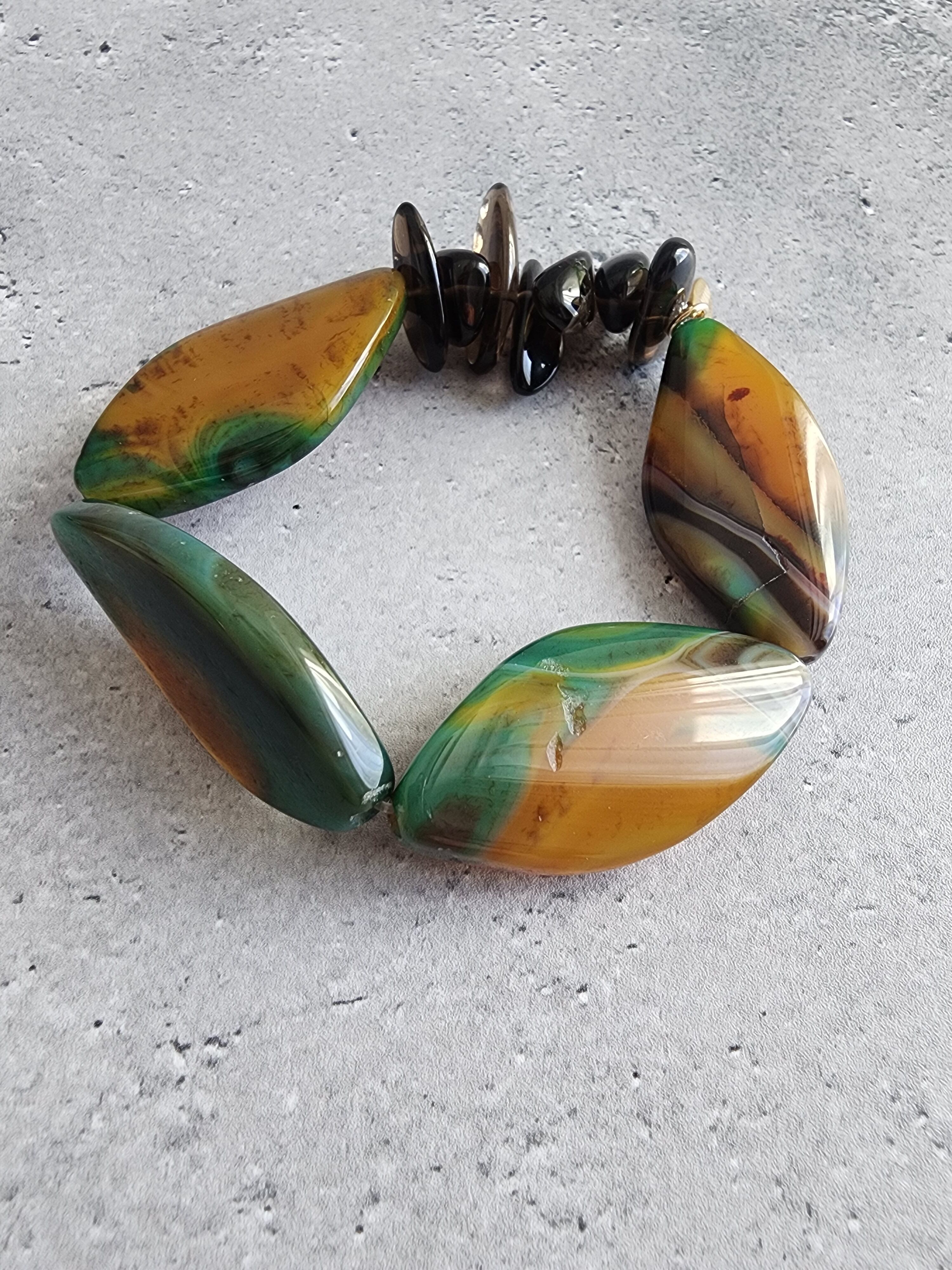 グリーン、イエロー、ブラウンカラーのコントラストが美しく、ダイナミックな縞模様と織り成す上品なアゲートのツイストカットを大胆に四枚並べて、半透明なつるんとしたスモーキークォーツチップを少し加えることで光が所々差し込む聖なる森の精霊達の囁きがまるで聞こえてくるアイテムです。