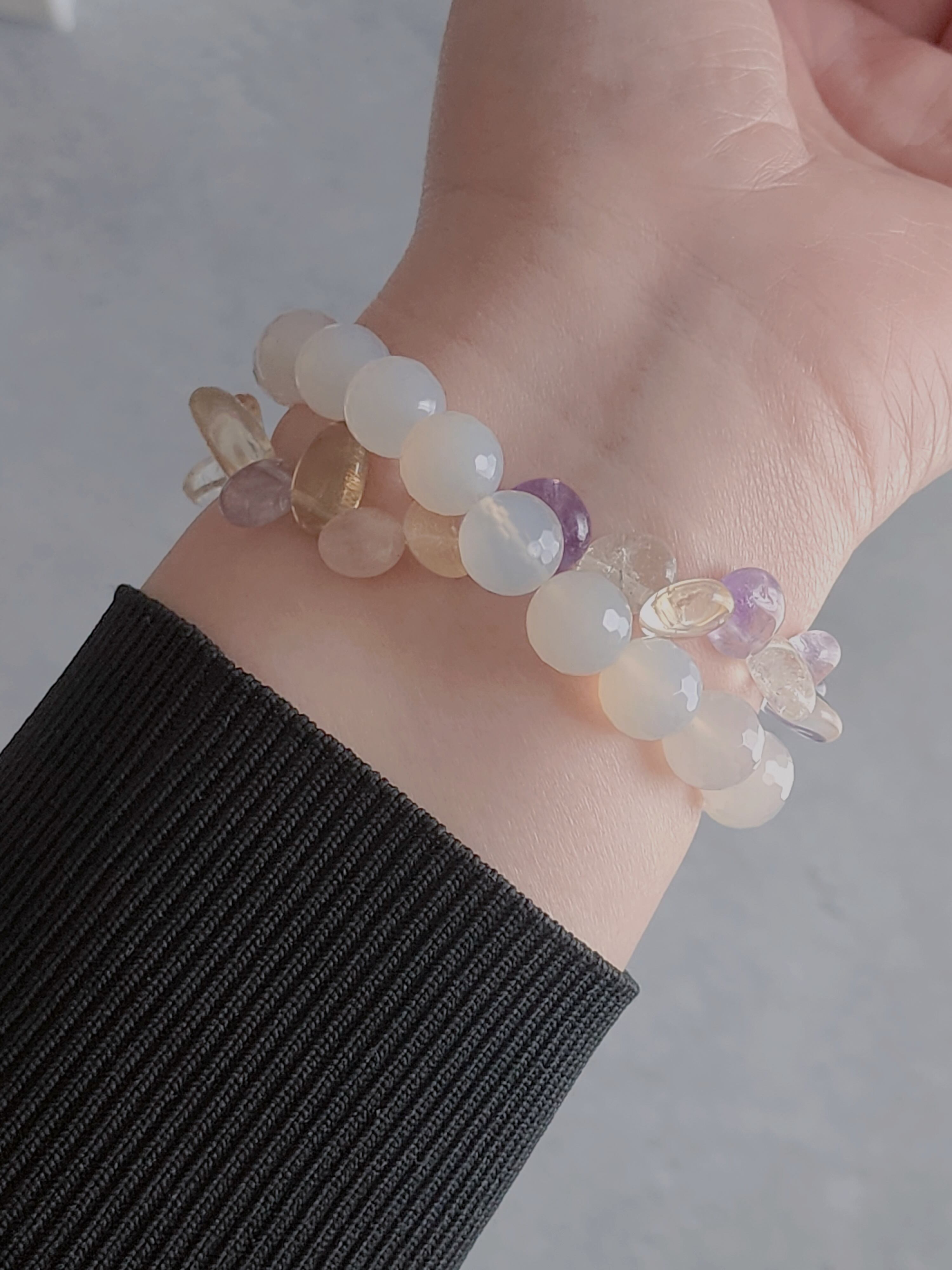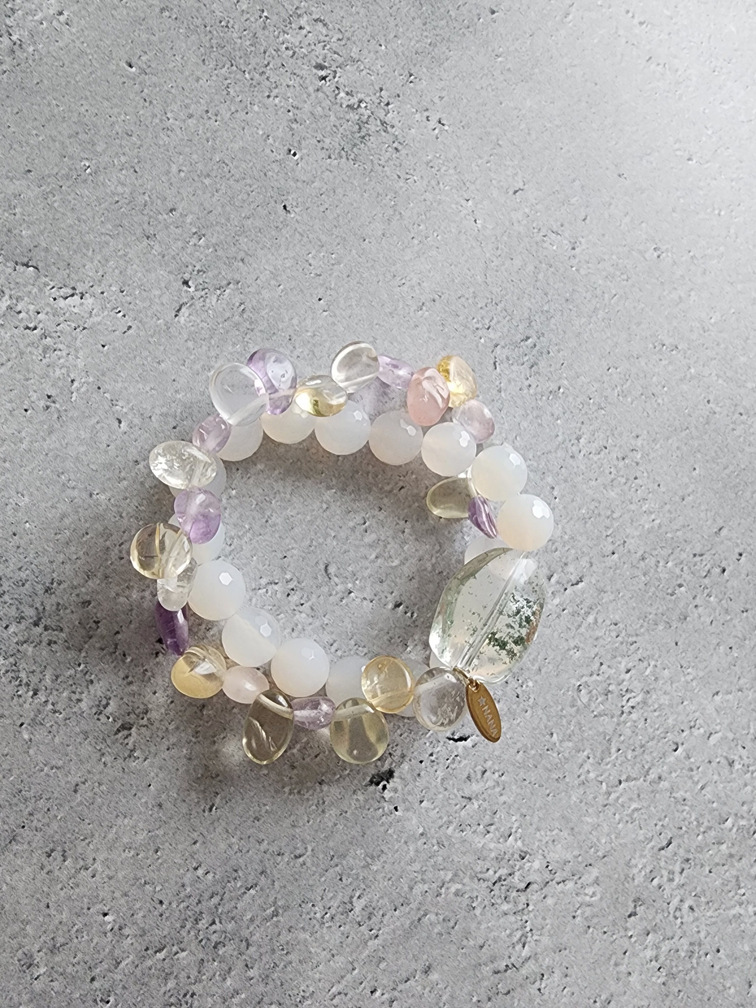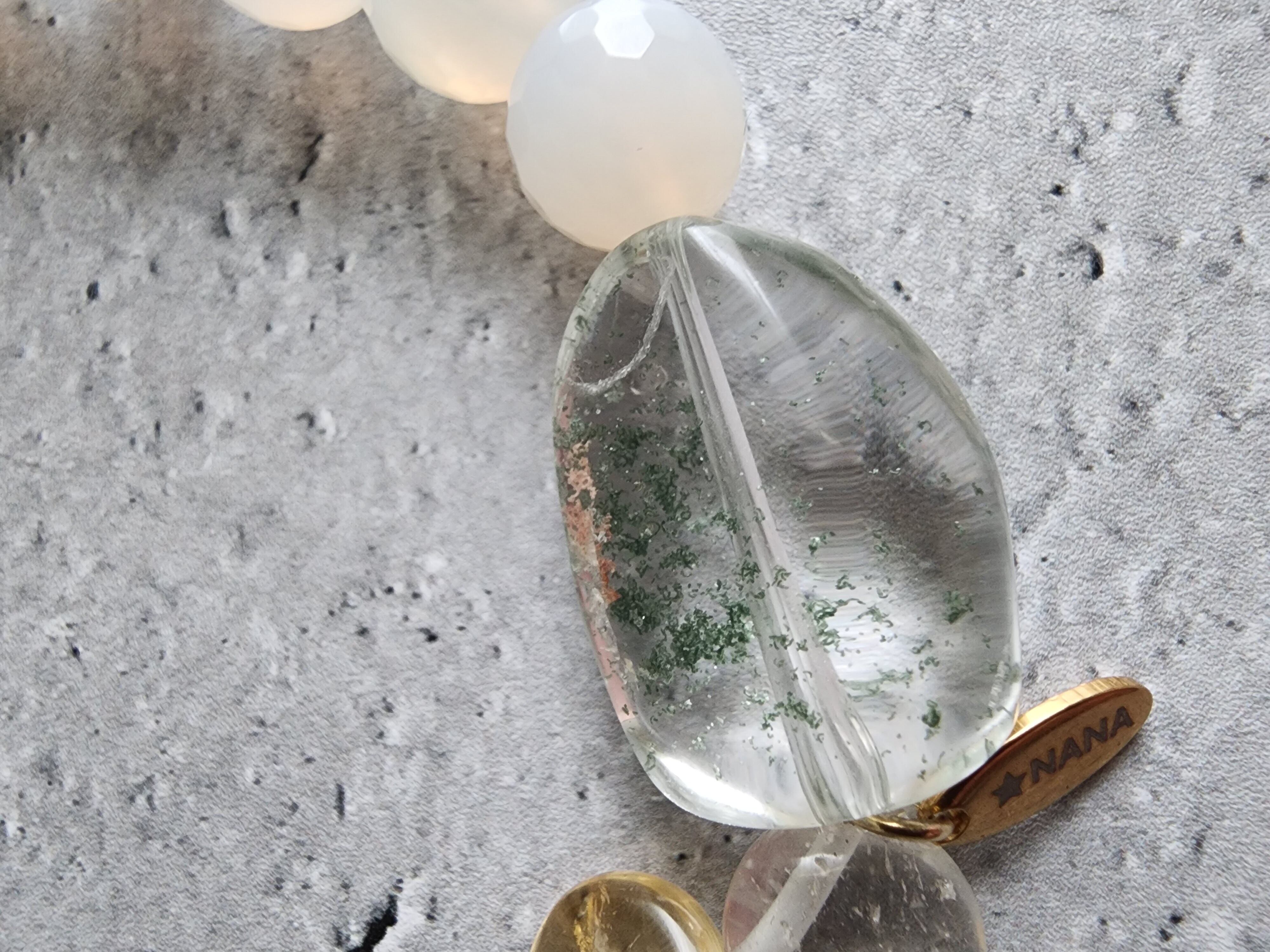 グリーンカラーの内包物とナチュラルなクラックにより、庭園風景を彷彿させるガーデンクォーツをソフトな印象のホワイトアゲートラウンドカットと彩りなクリスタルミックスで包んで。