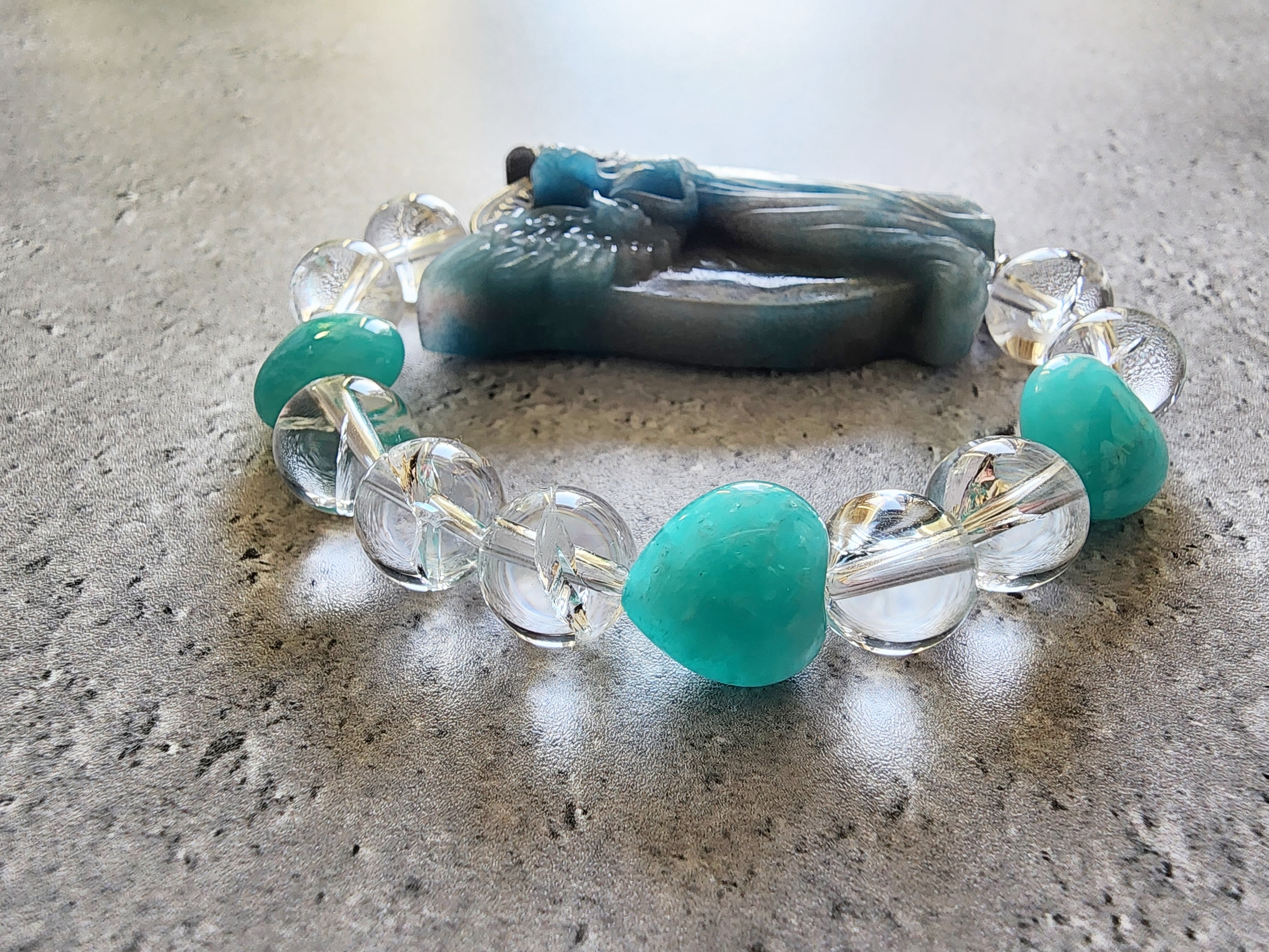 パワーストーンとして最近人気なトロレアイトのマリア様とアイリスクォーツの幻想的なクラックと虹。透明感のあるブルーグリーンカラーアマゾナイトハートと組み合わせた高次元の女神と妖精の世界を表す一本。