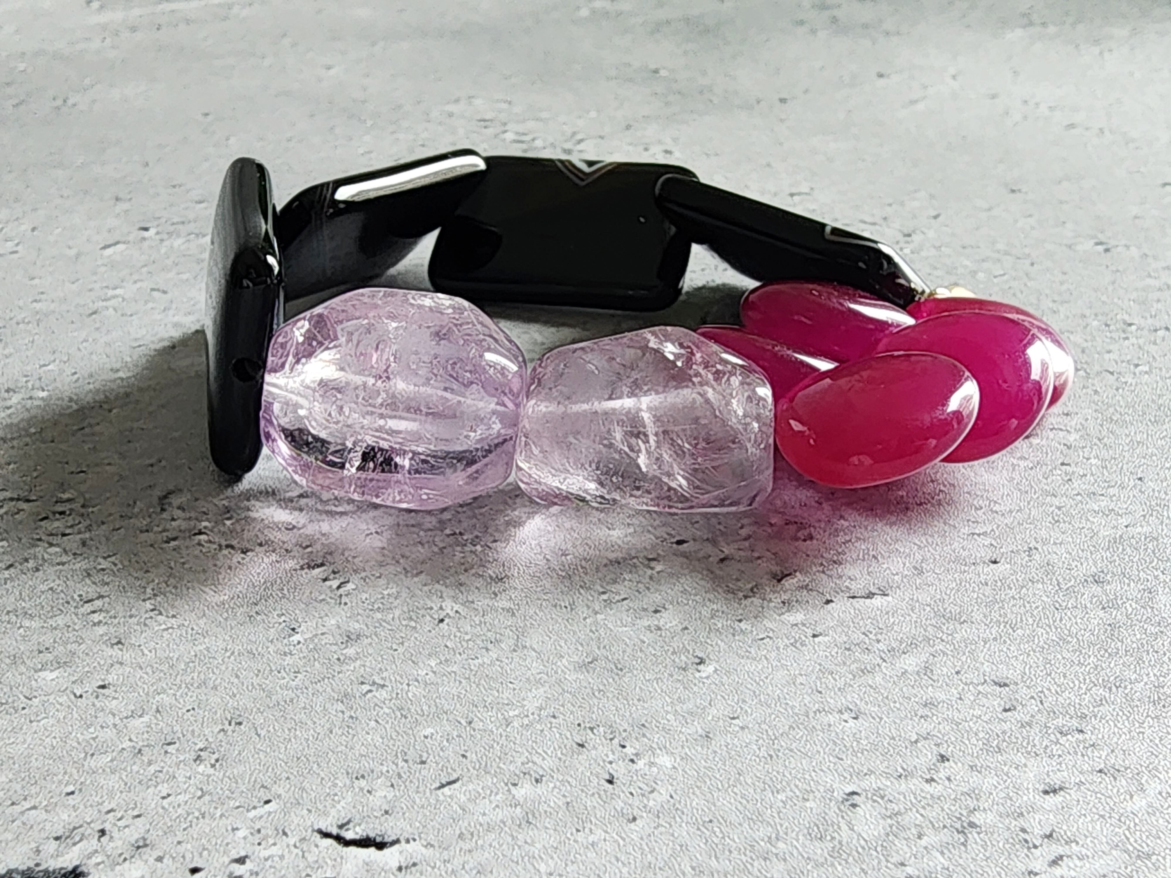 ストライプが入るブラックオニキスのナゲットは一つ一つ表情が違い、艶やかな表面が優しいムードのアメジストの輝きを際立たせ、ふっくらとしたパープルジェードマロンとで女性らしい大人シックなアイテムを演出。