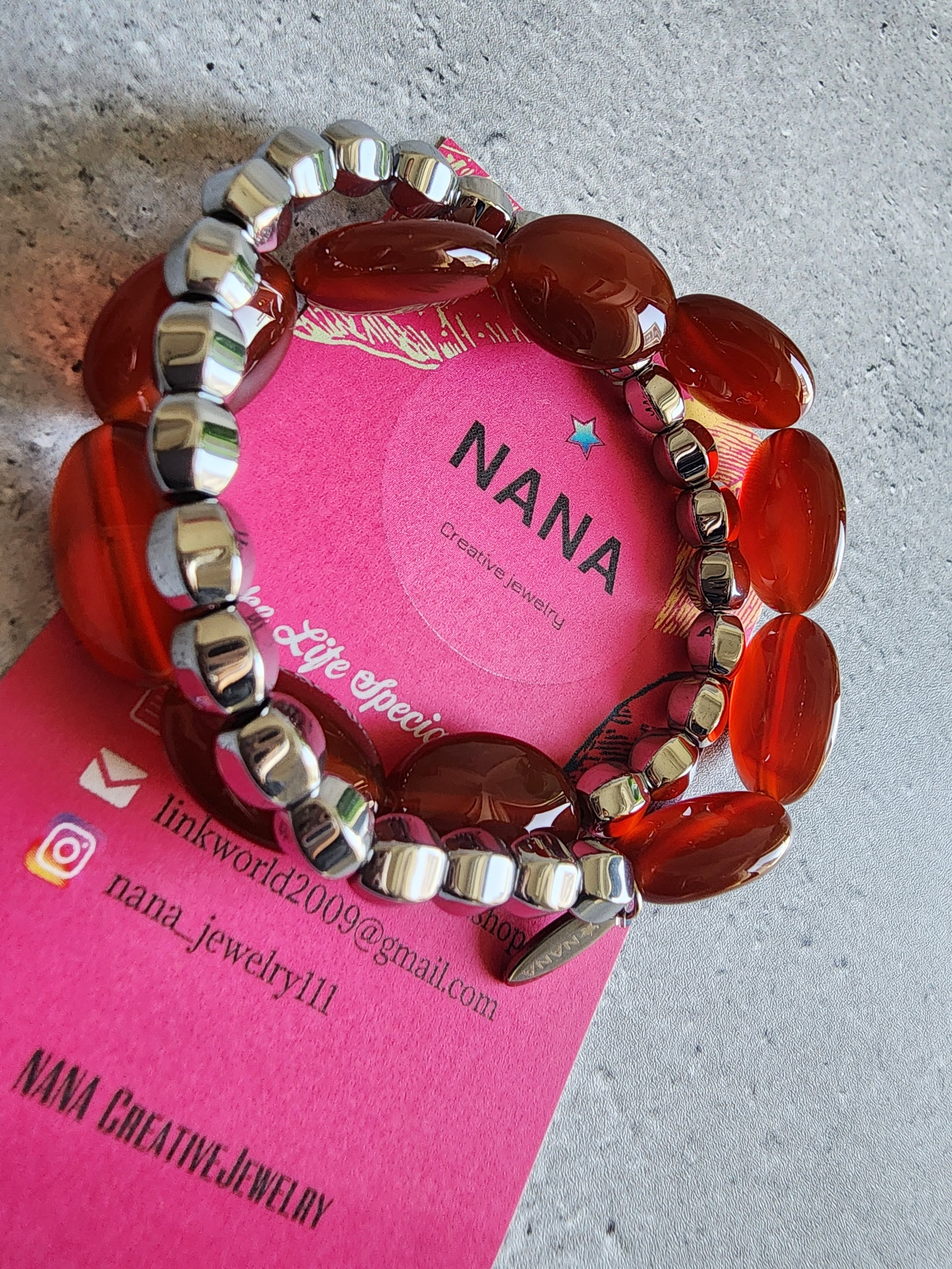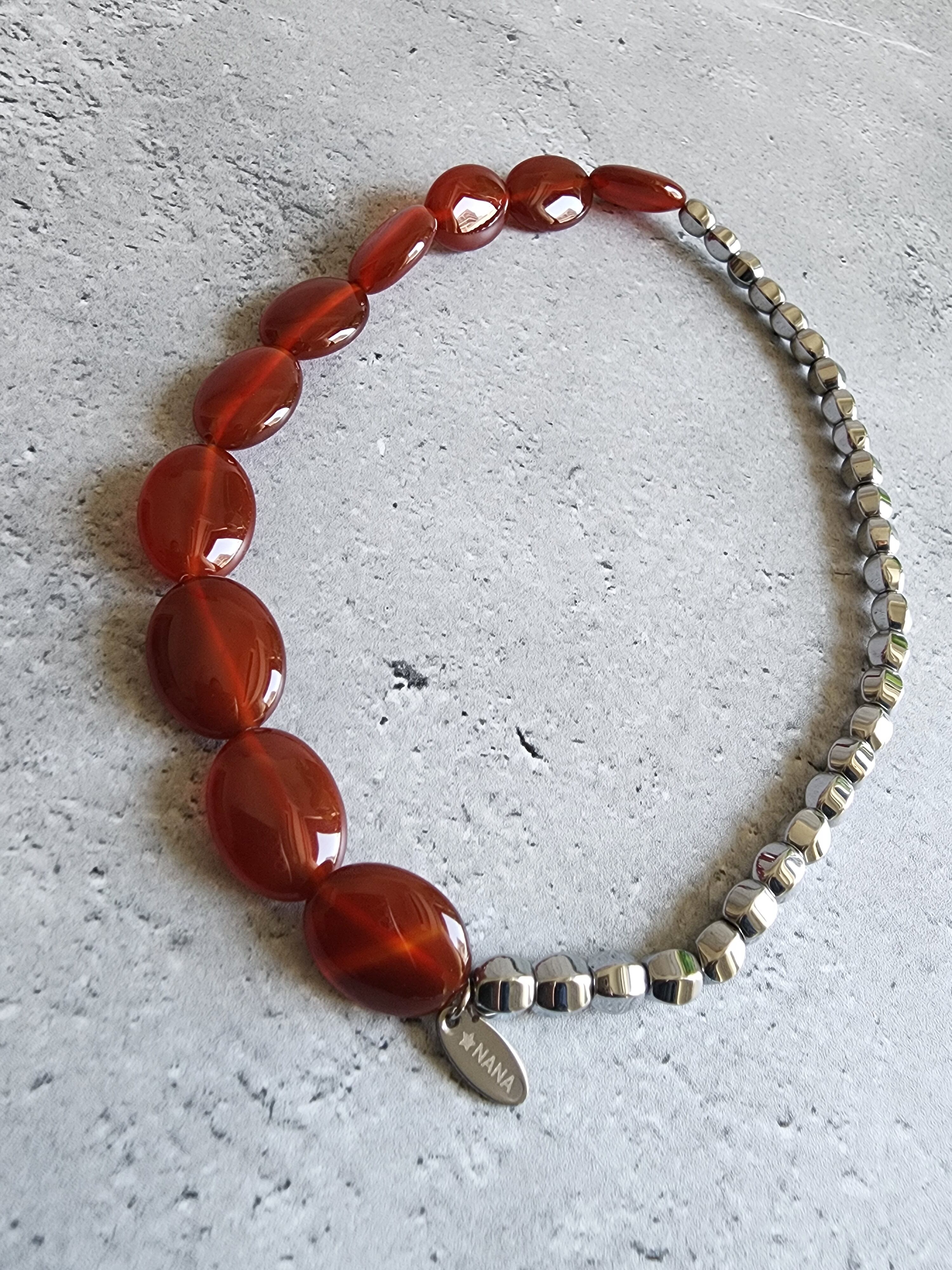 美しい艶やかなレッドアゲートをシルバーヘマタイトのメタリックな輝きでクールに、モダンに。