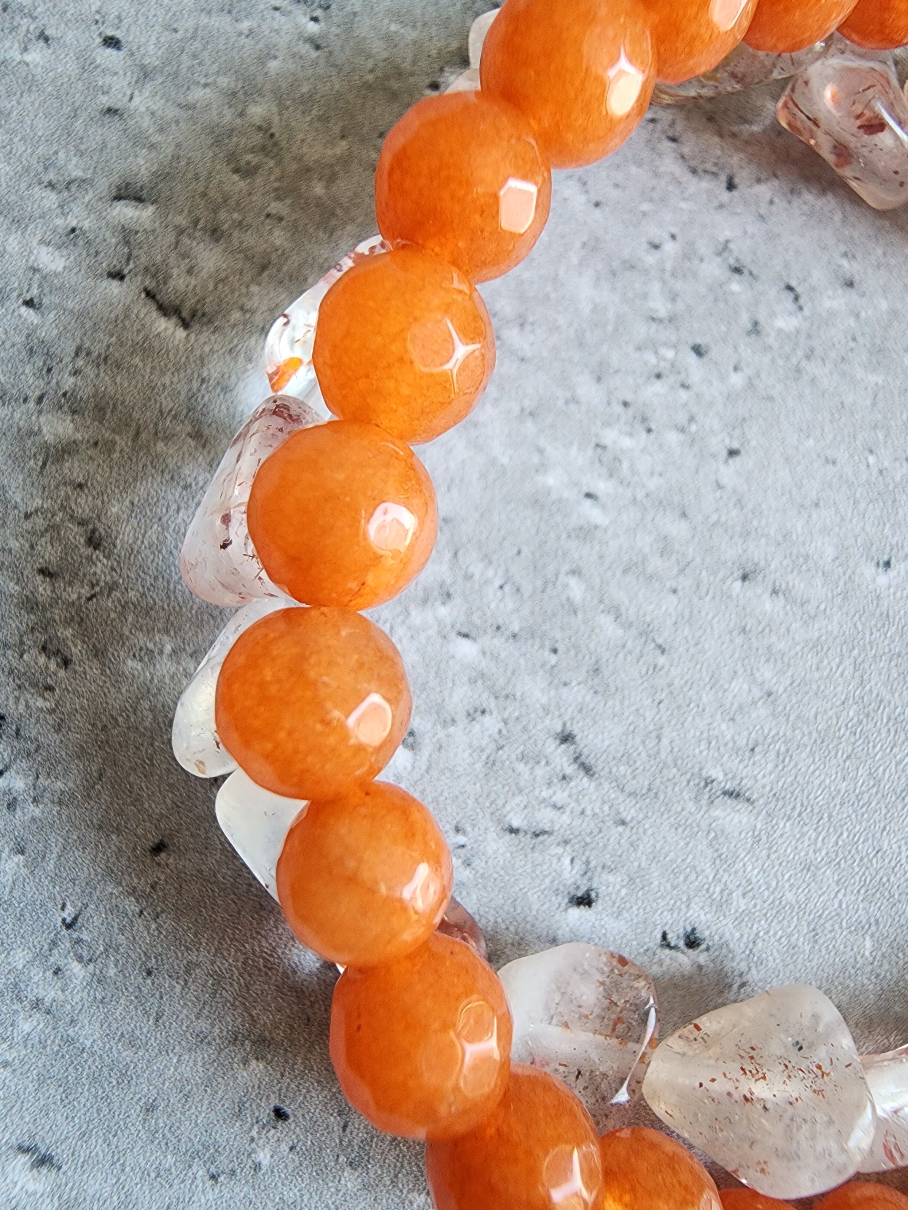 クリアな水晶の中の針のような真紅や赤褐色の内包物が甘く、フレッシュな果実のように、鮮やかなオレンジカラーの輝きが細かいカットによって煌めくオレンジジェードとの絶妙なバランスとカラーコンビネーションが躍動感をもたらす一本。
