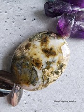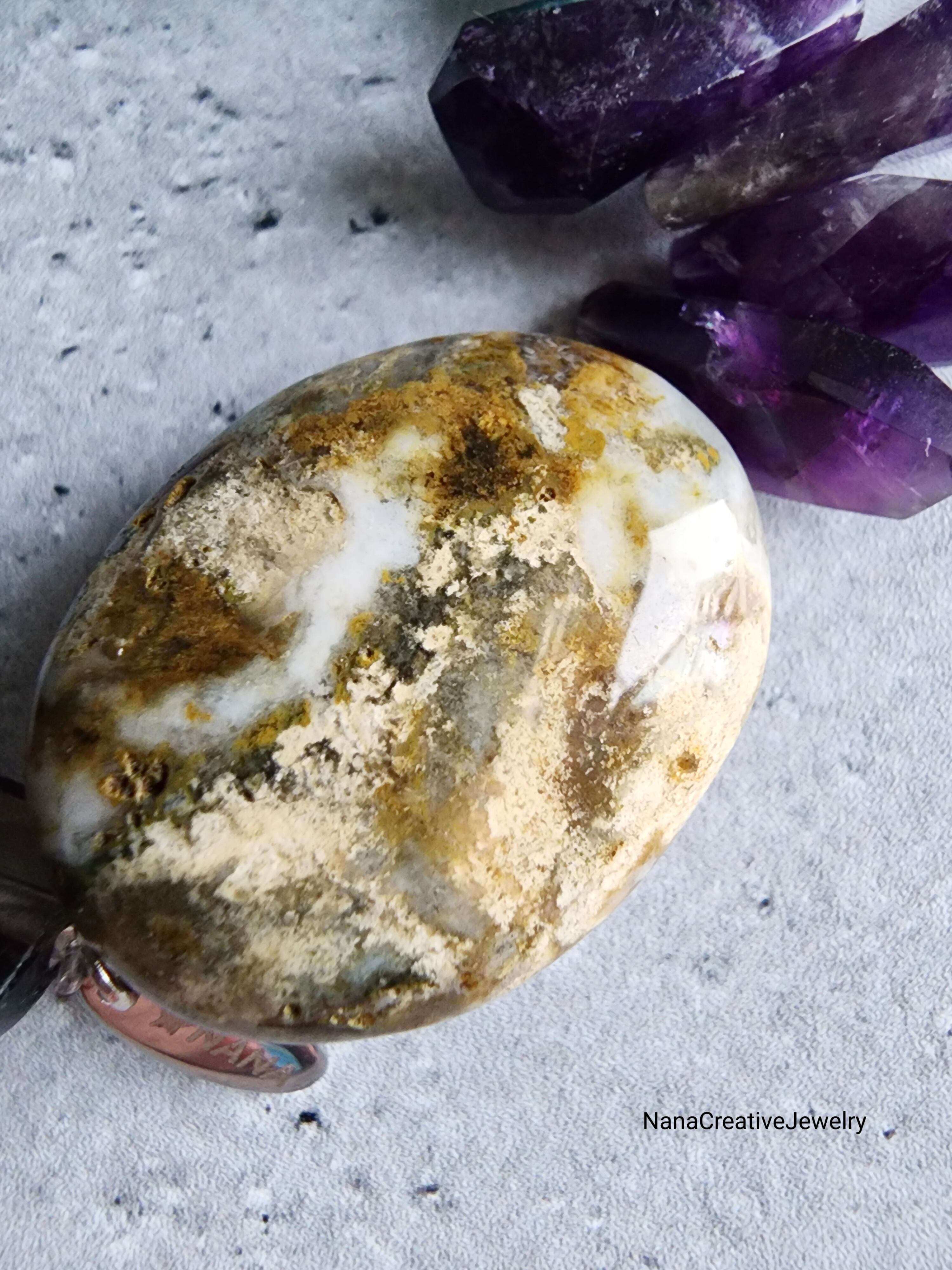 まるで古い文明のストーリーを描き記した独特な「オーブ」模様がその唯一無二な存在を誇るオーシャンジャスパー、滑らかな表面とビビットなブルーカラーが特徴なアマゾナイトラフカット、ユニークなストライプ模様のオニキス、光を程よく吸収して反射する半透明のスモーキークォーツと全体を締めるザンビア産高品質のアメジストチップはどの石も独自な魅力とそれぞれ違う表情を見せてくれます。