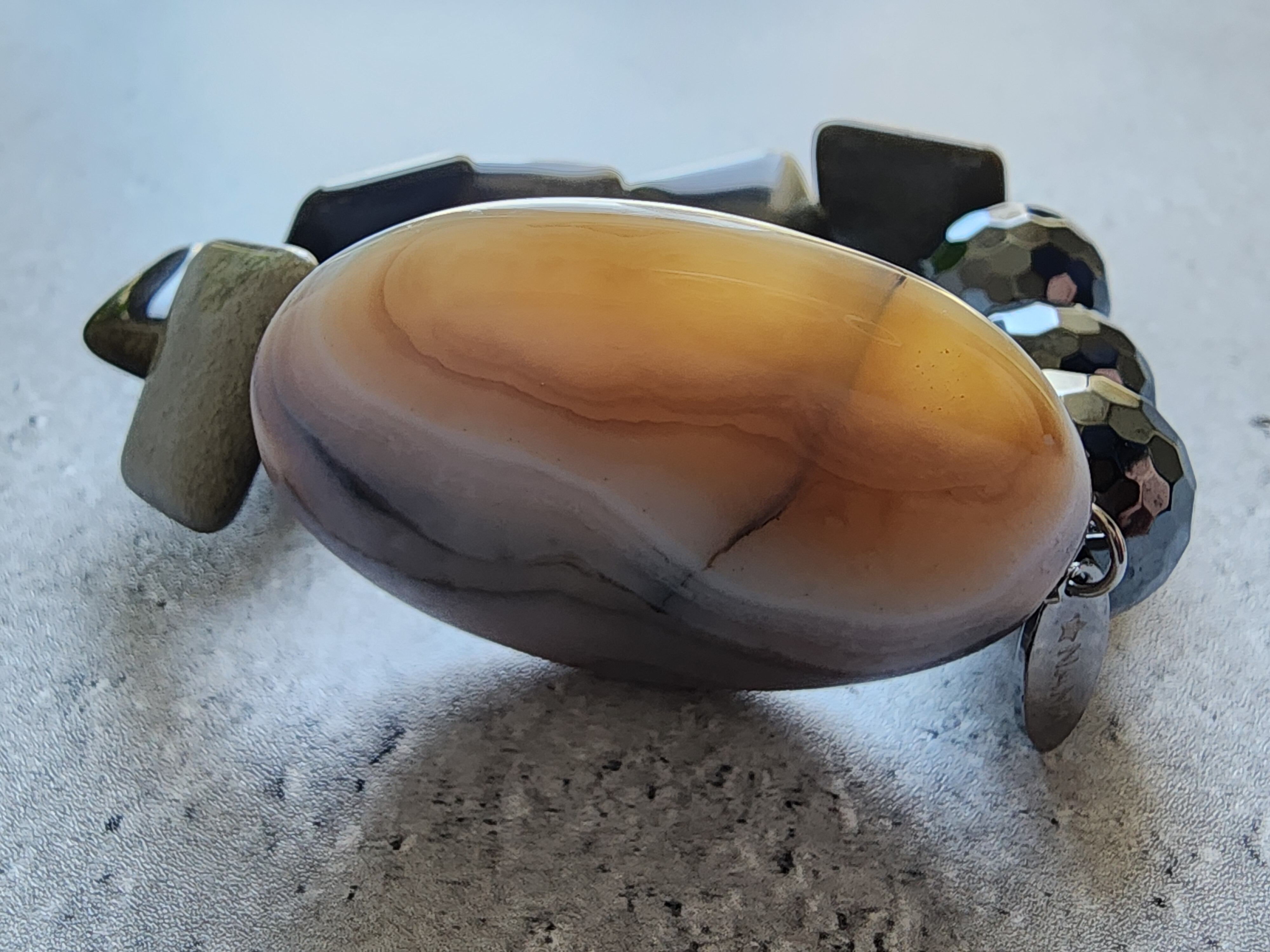 マーブル模様の大きなアゲートは、地球が生み出したアートのような白と茶色の渦を描きます。内に秘めた金色の輝きが力強さと豊かな創造力を象徴するゴールデンオブシディアンとメタリックなきらめきを十二分に発揮するヘマティーンラウンドカットのこちらの組み合わせはエレガントでモダンなデザインが特徴です。