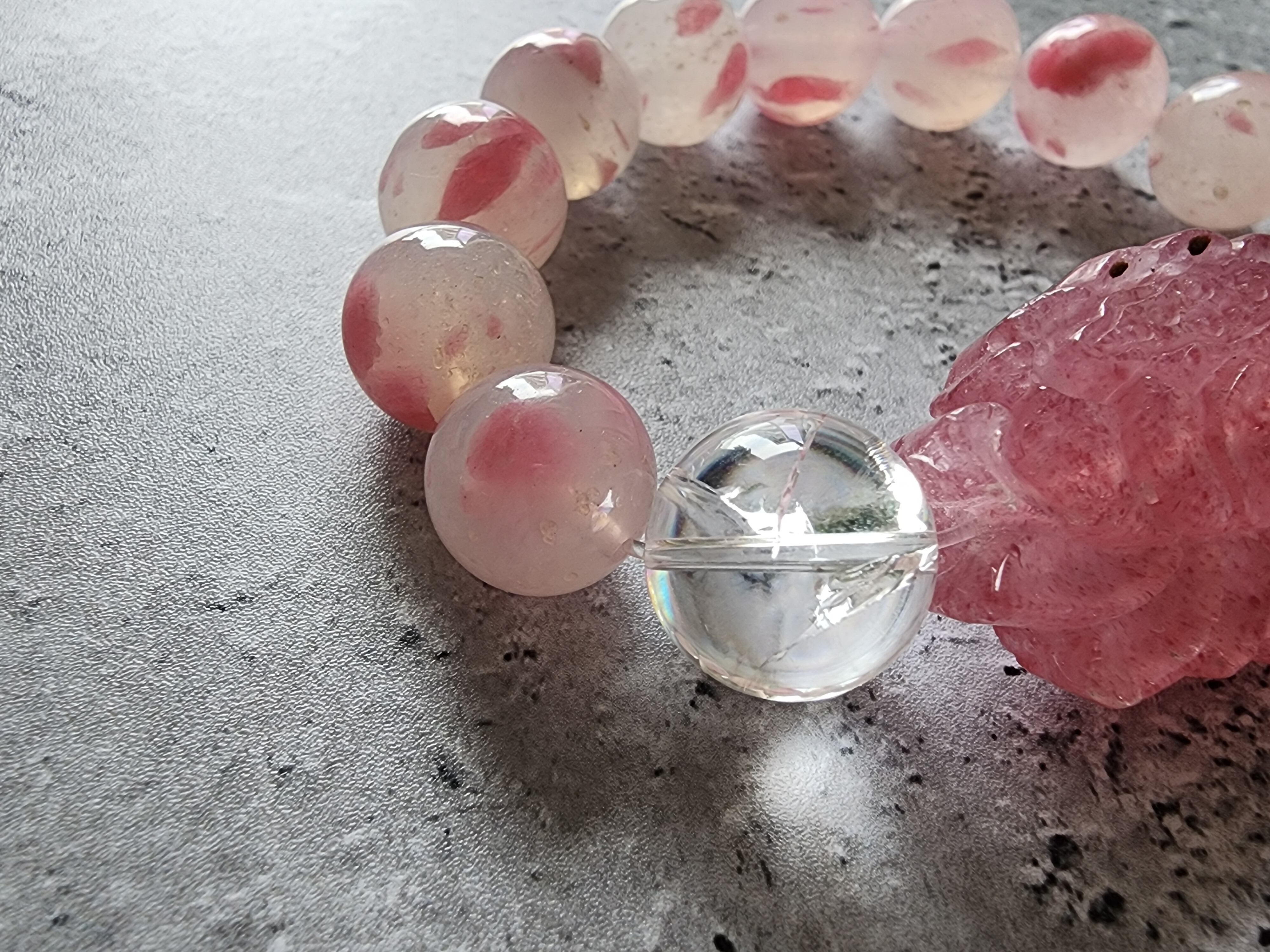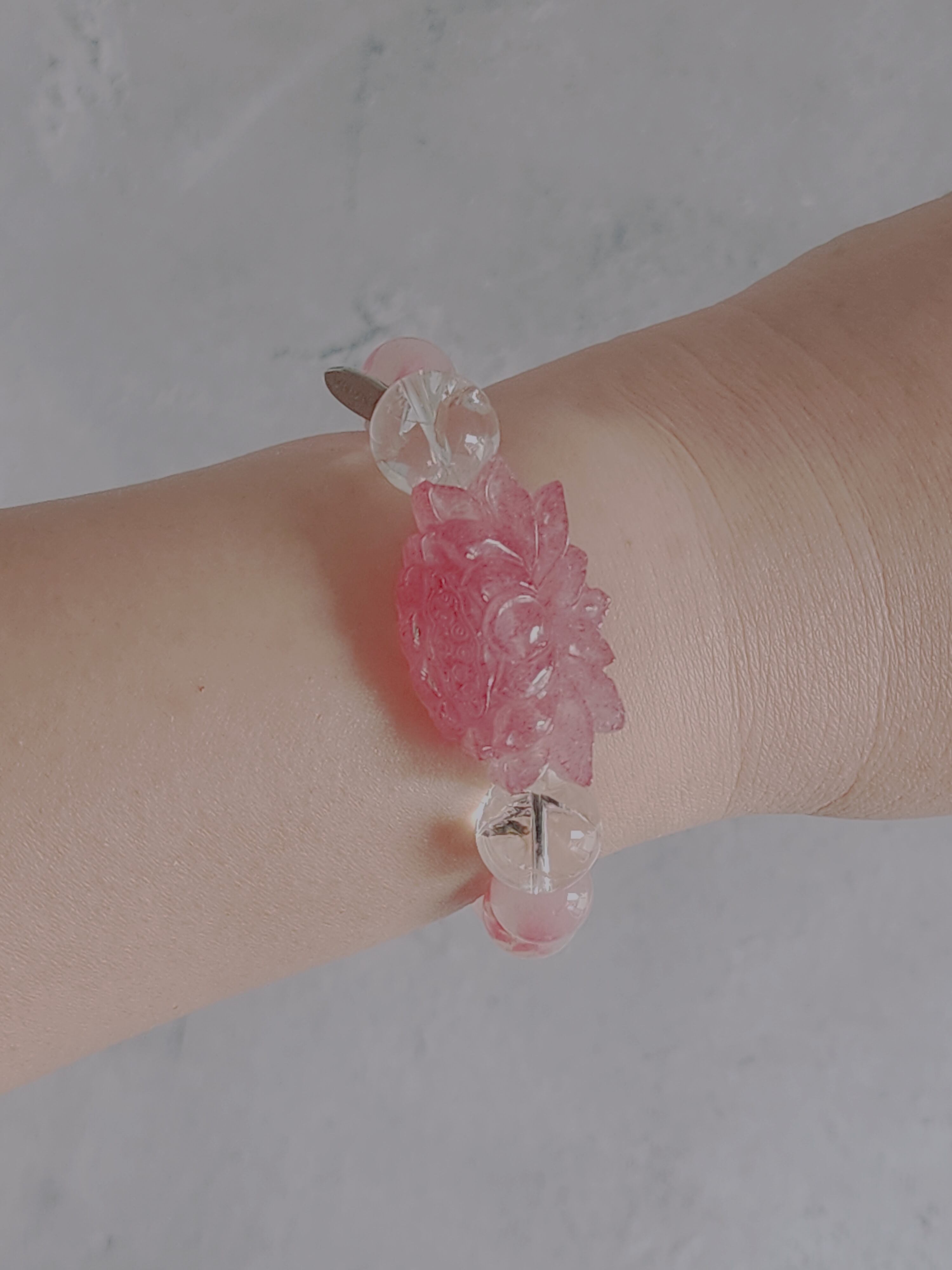 蓮モチーフのストロベリークォーツは透明感と発色両方共素晴らしく美しい観賞価値の高い石です。桜の花びらのように可憐な様子のロードナイトシリカを合わせて、同系色の組み合わせによってより甘い、上品な美しさを表現。蓮の両側に大粒アイリスクォーツを入れて、ブレスレットの全体を更にユニークに、別次元に裝飾しました。