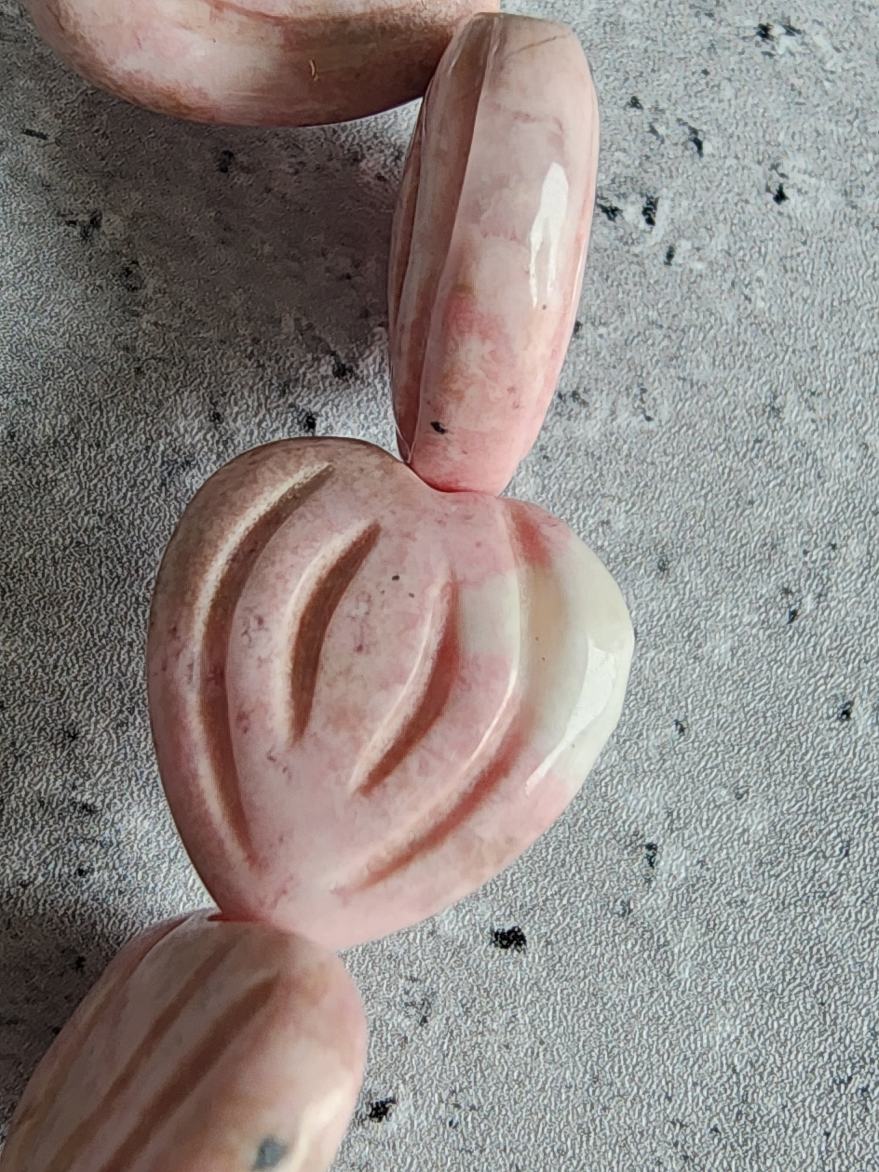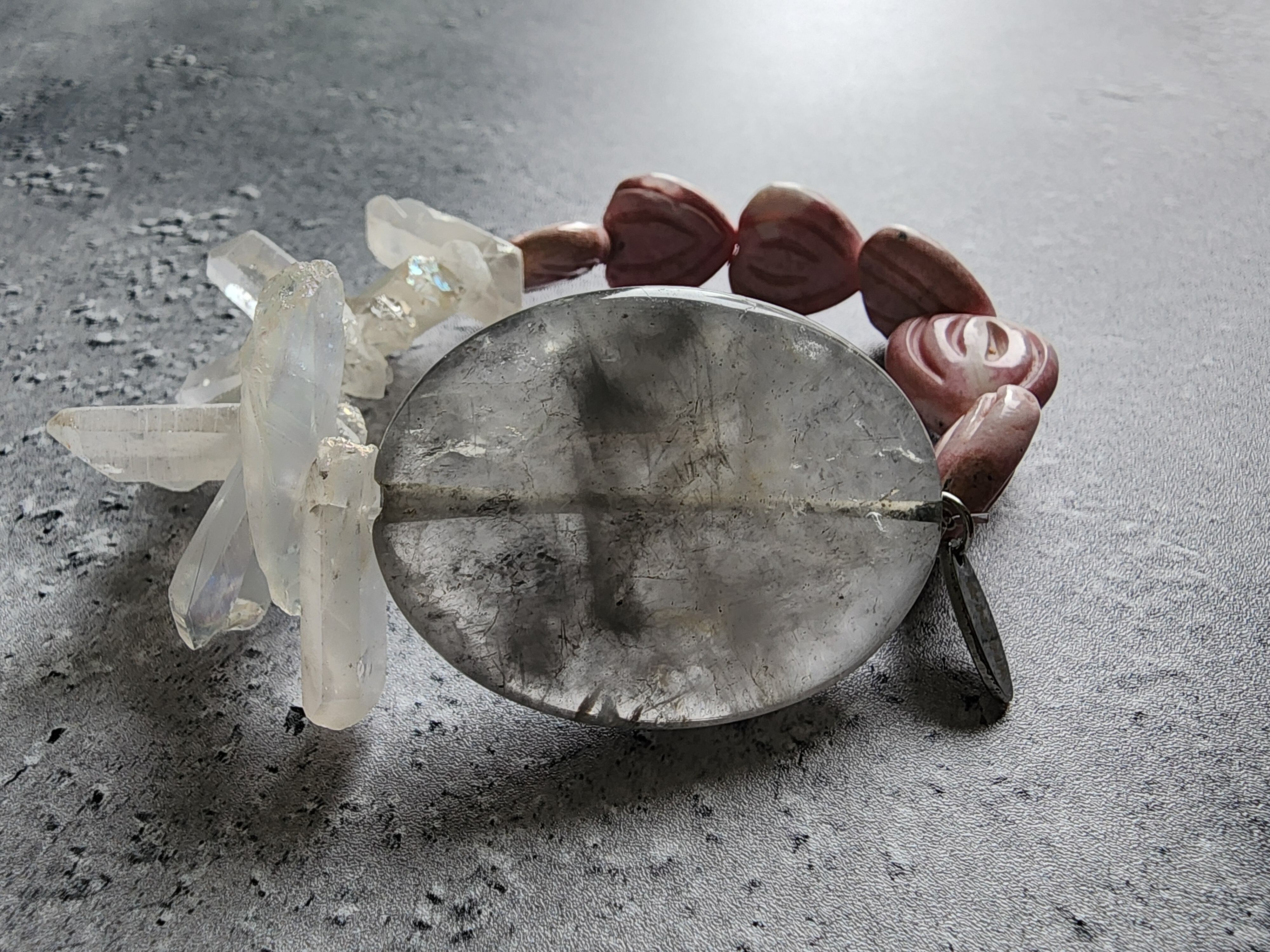 滑らかな表面とシックな発色がチャーミングなグレークォーツとハートシェイプの彫刻入りベビーピンクロードナイトの洗練されたパステル調の組み合わせに虹色の光沢を放つクリスタルをつけて、優しさと華やかさを併せ持つアイテムに。