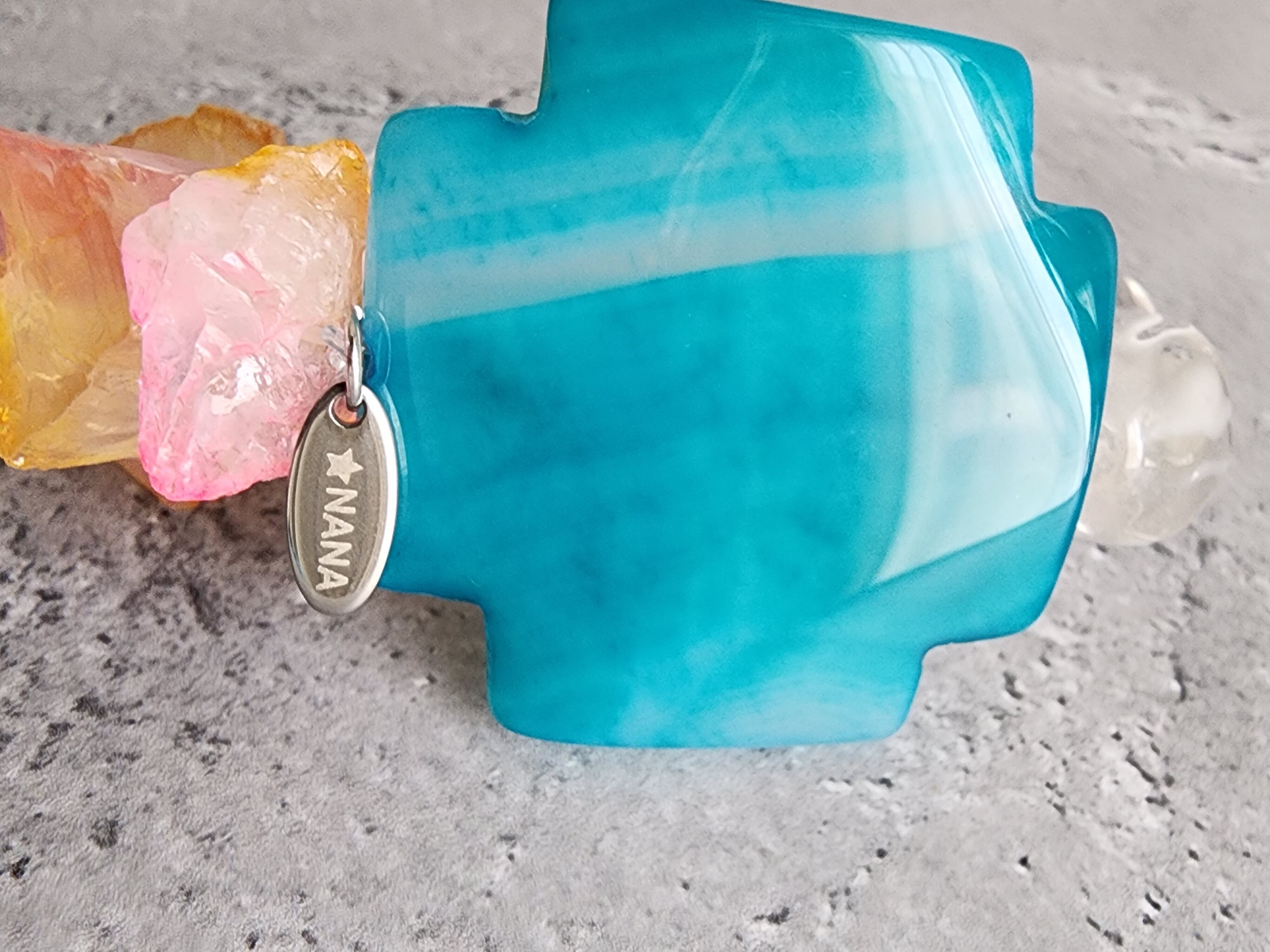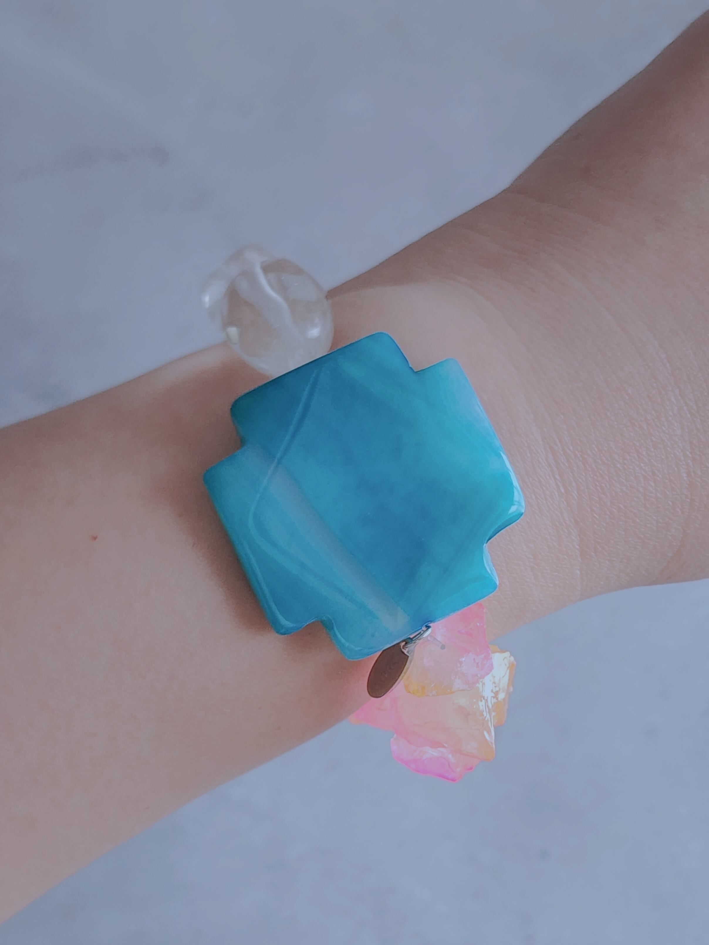 センターの大きいブルーアゲートは、その独特なパターンと形状が魅力を放ち、ブレスレット全体の存在感を高めます。
